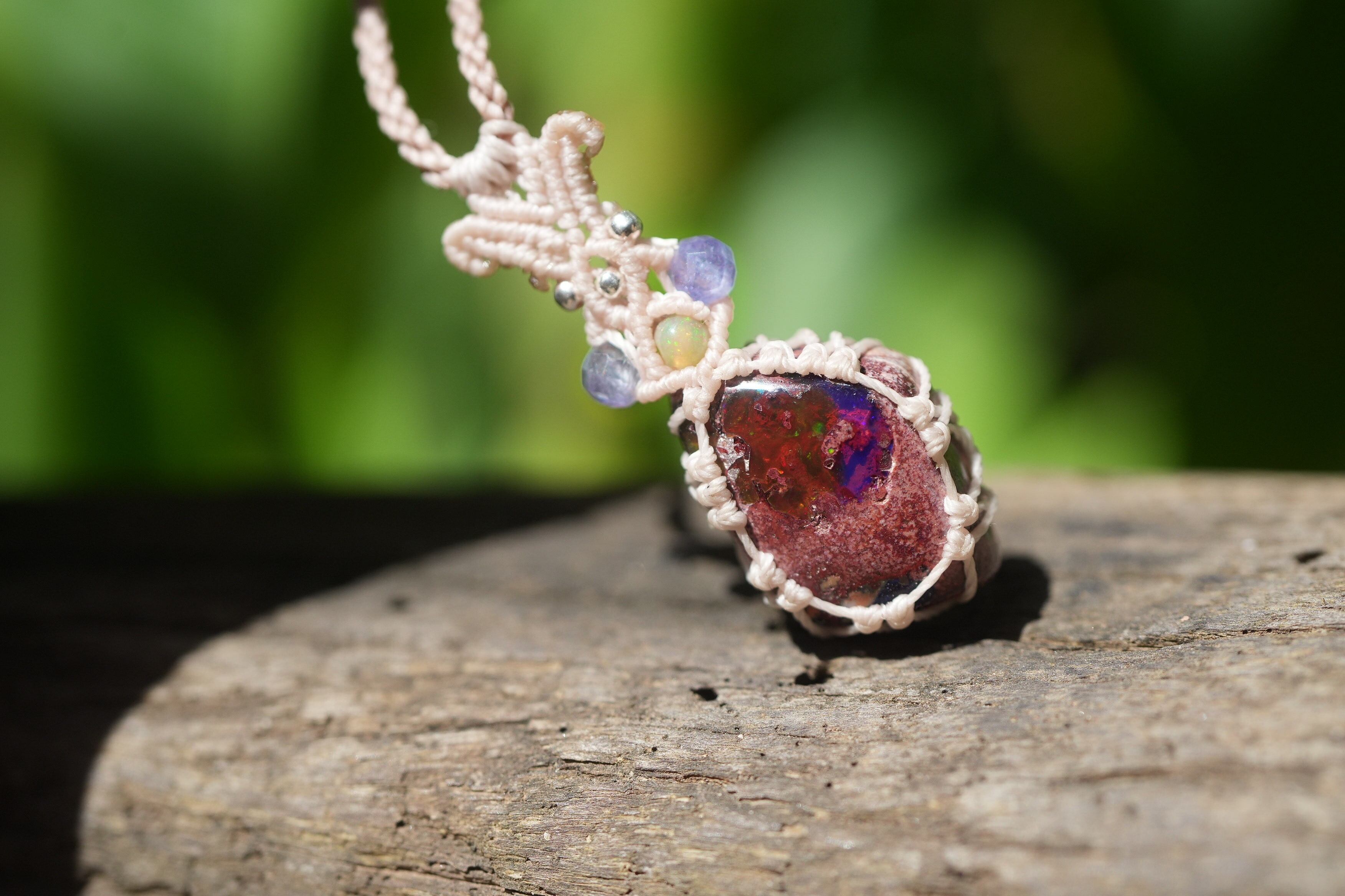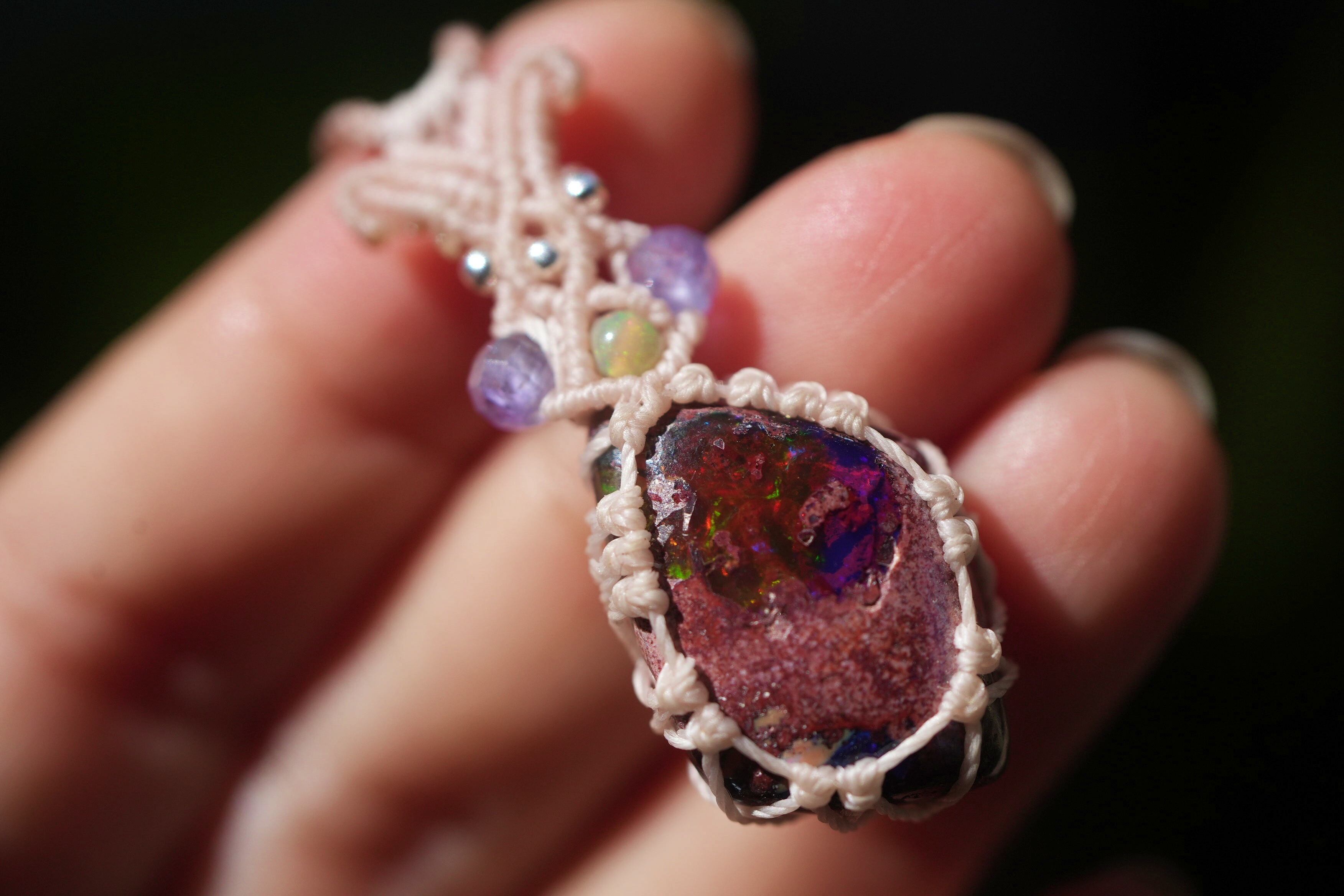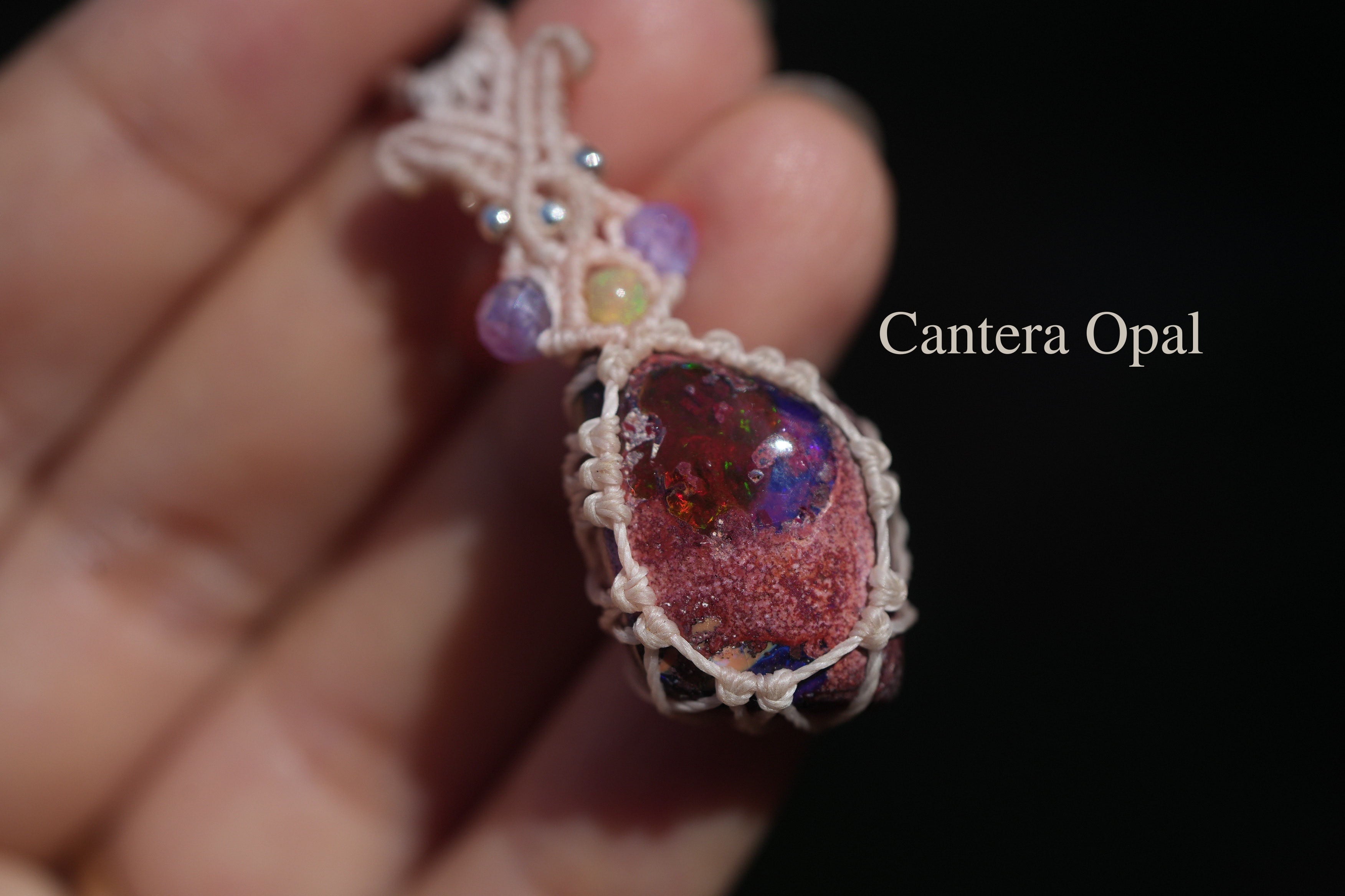 蒼い遊色の日差し★カンテラオパール マクラメネックレス1959