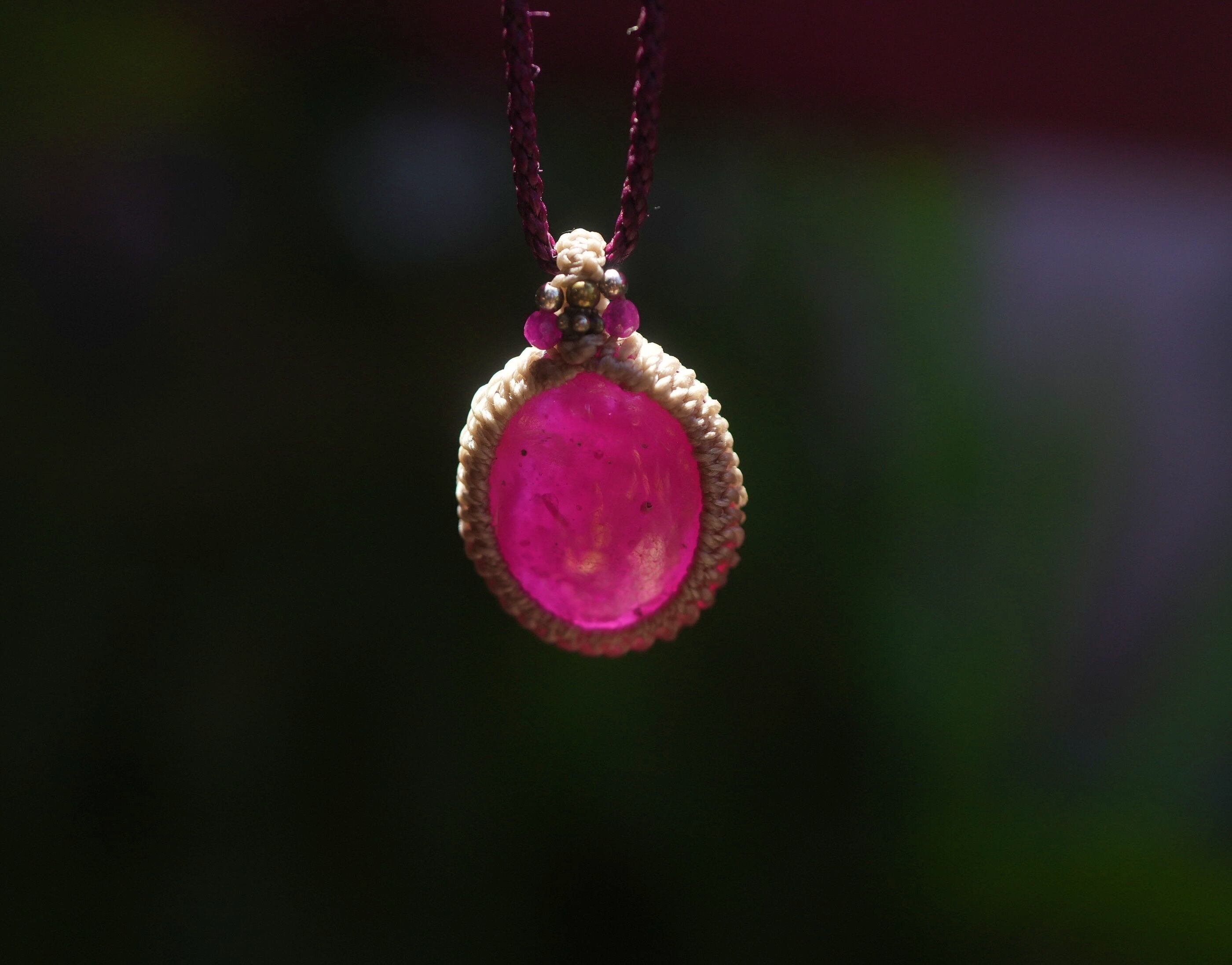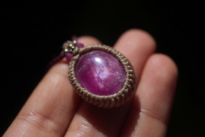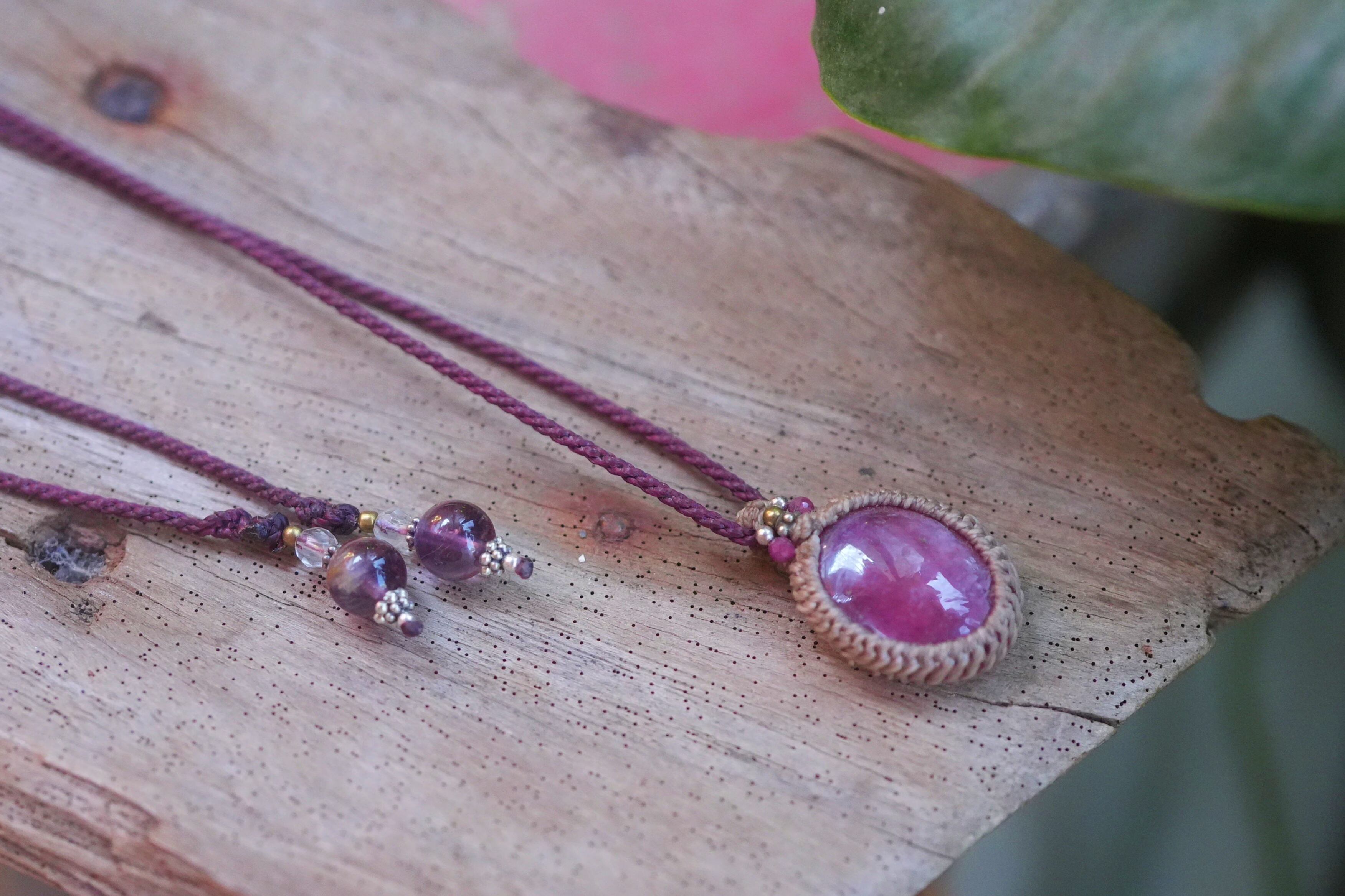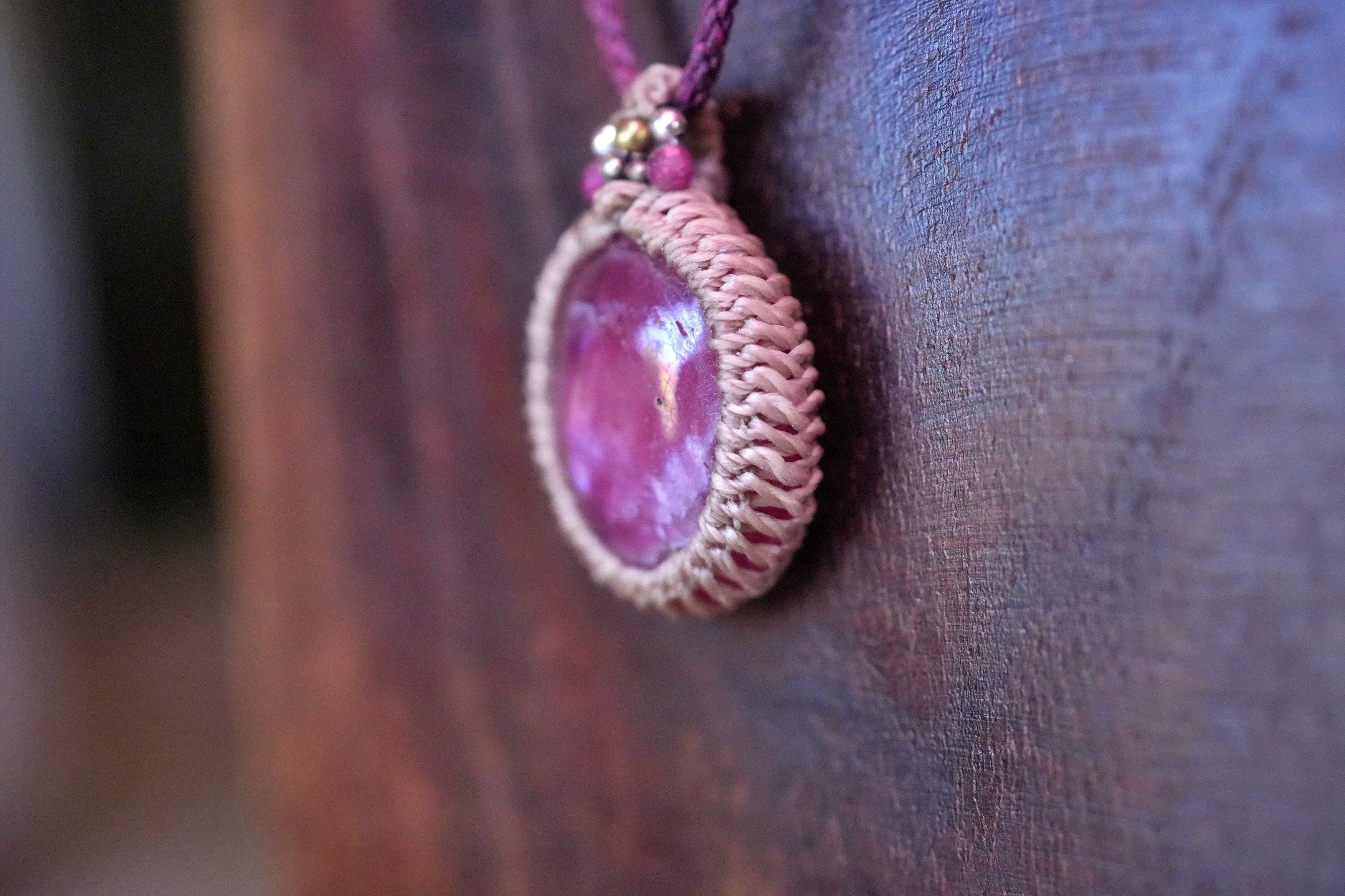 ◆このたびはカフェオレ、ボルドー色の蝋引き糸を使用しマクラメ編み装飾を施しました。