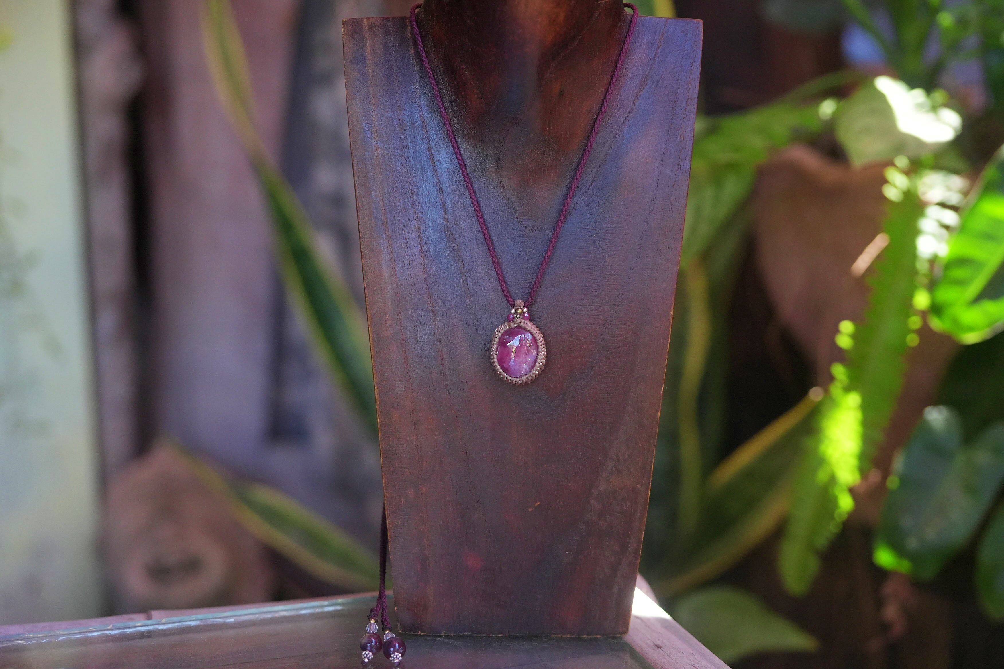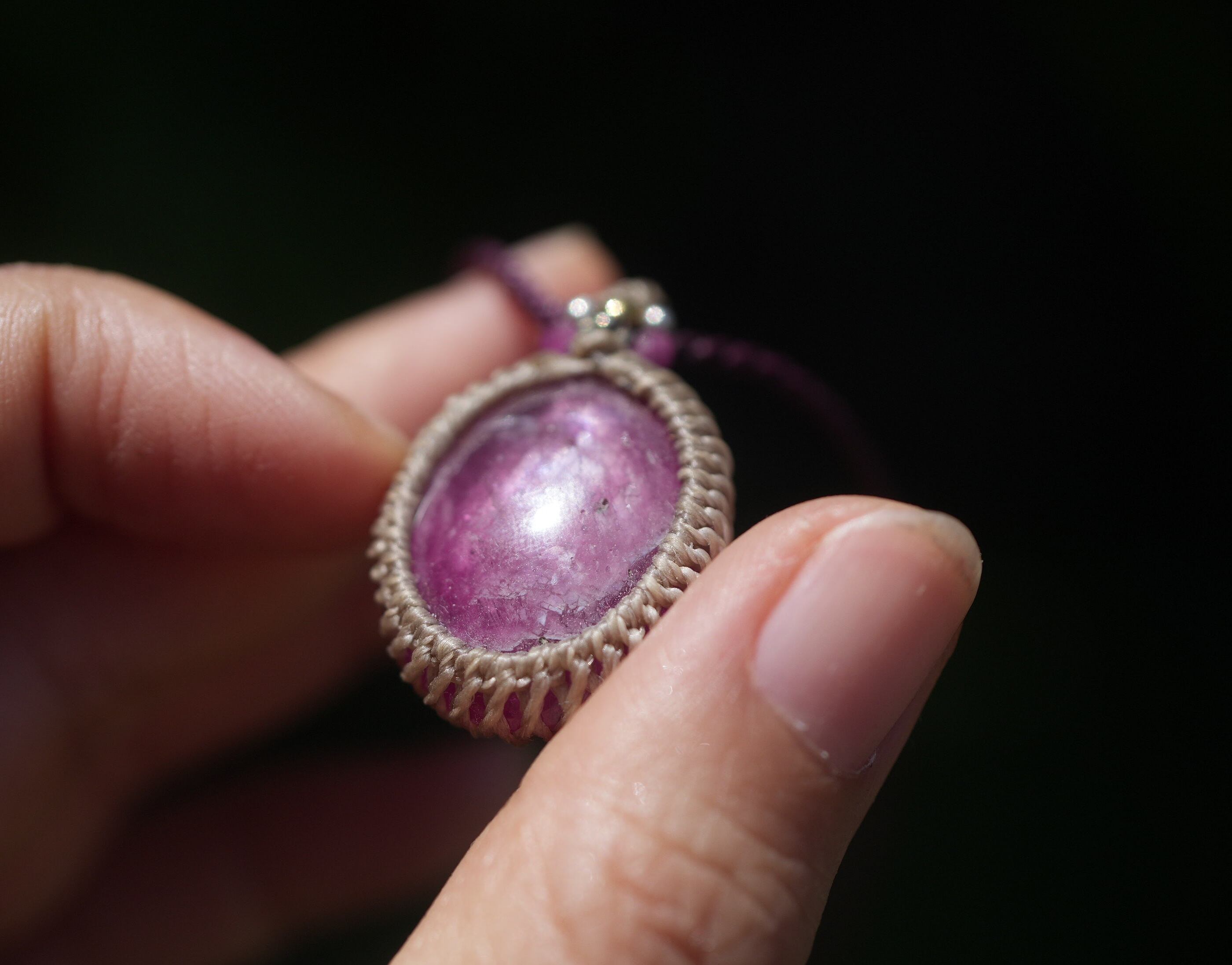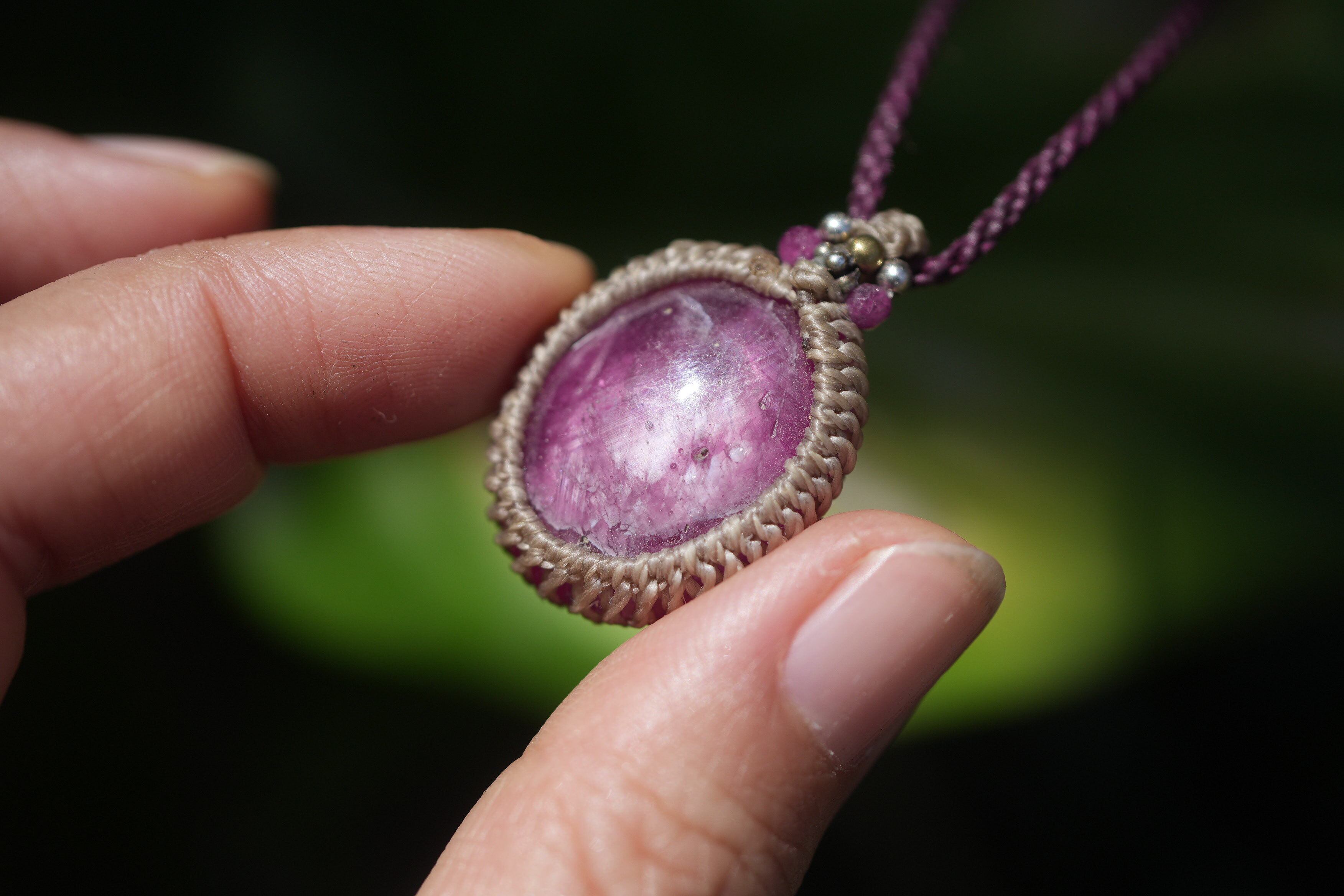 ◆このたびはカフェオレ、ボルドー色の蝋引き糸を使用しマクラメ編み装飾を施しました。