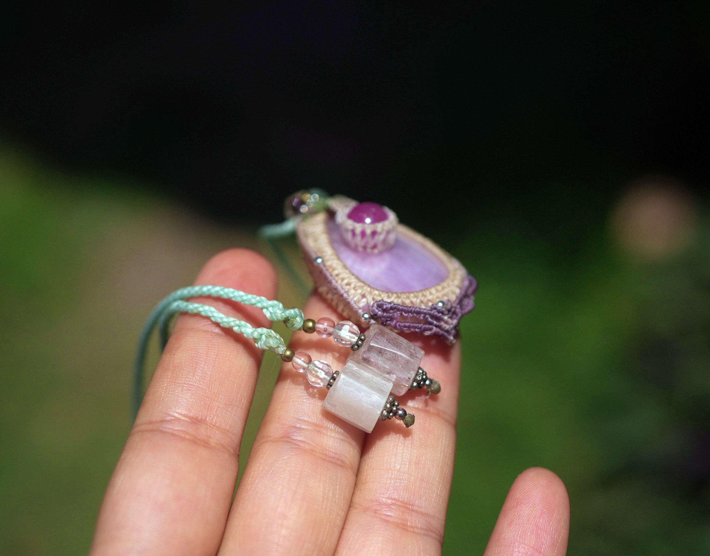◆このたびはナチュラルホワイト、ミント、ミルクココア、パープル、ピスタチオ色の蝋引き糸を使用しマクラメ編み装飾を施しました。
