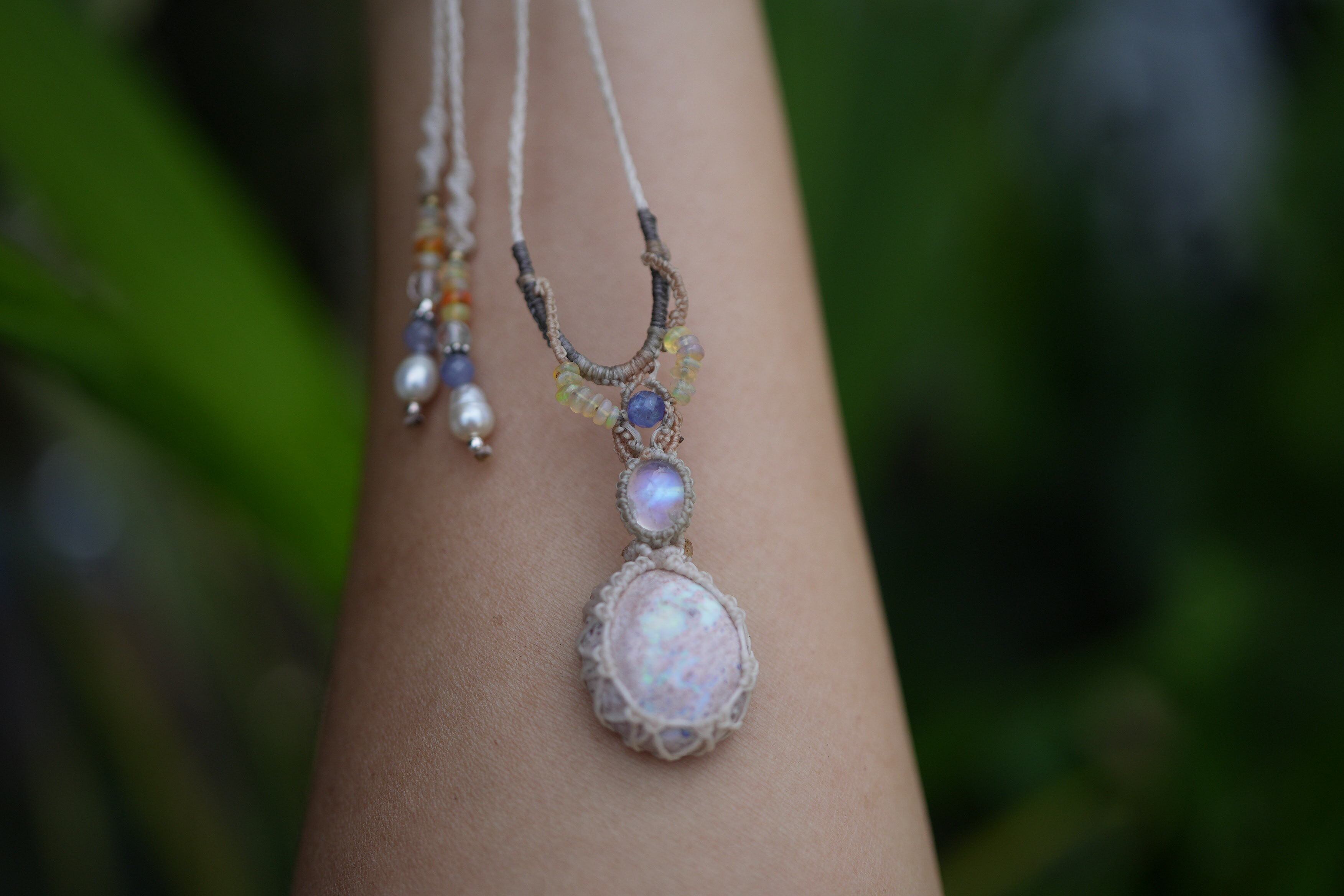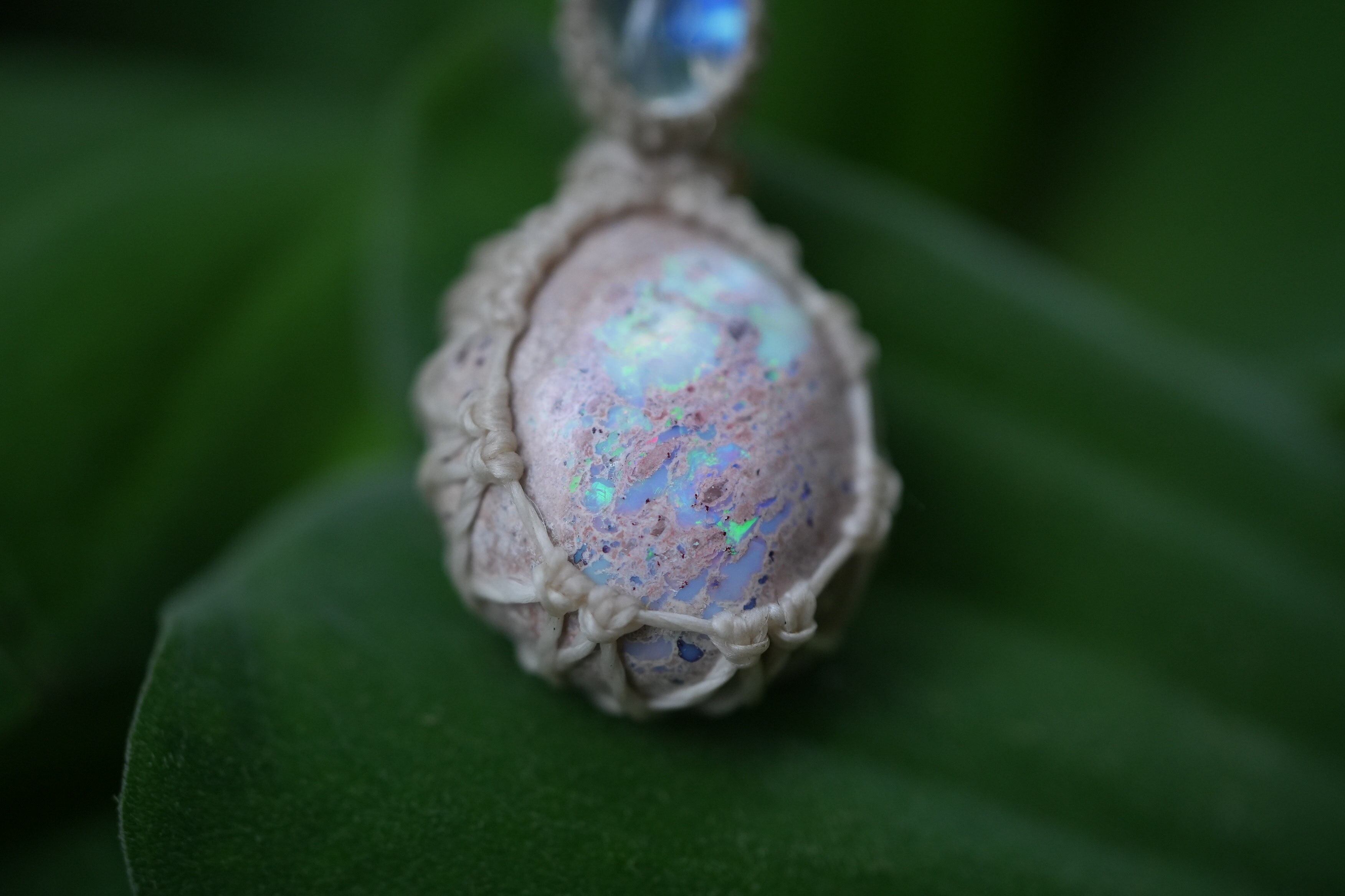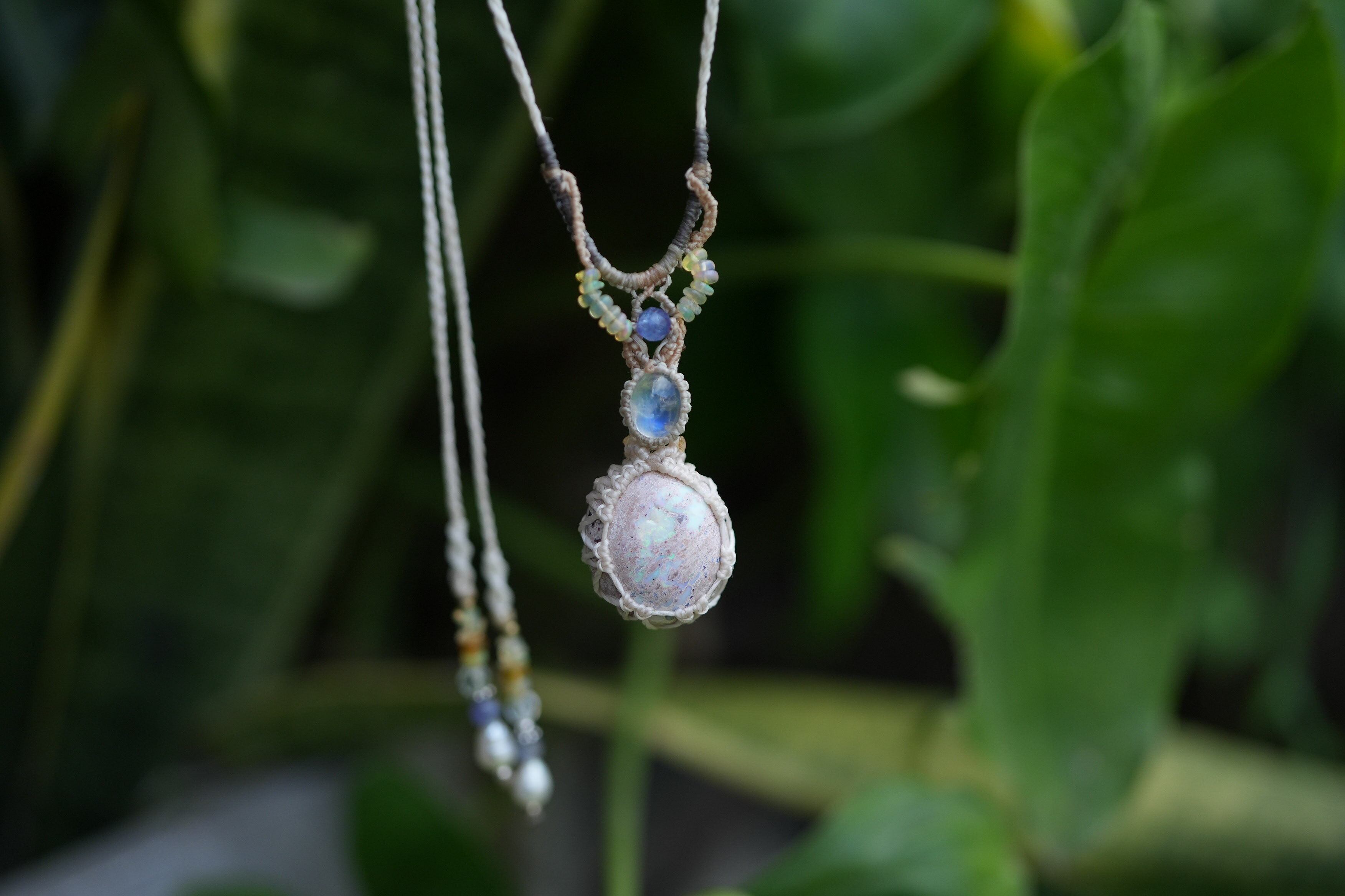 ふわふわ遊色★カンテラオパール★高品質moonstone マクラメネックレス1982