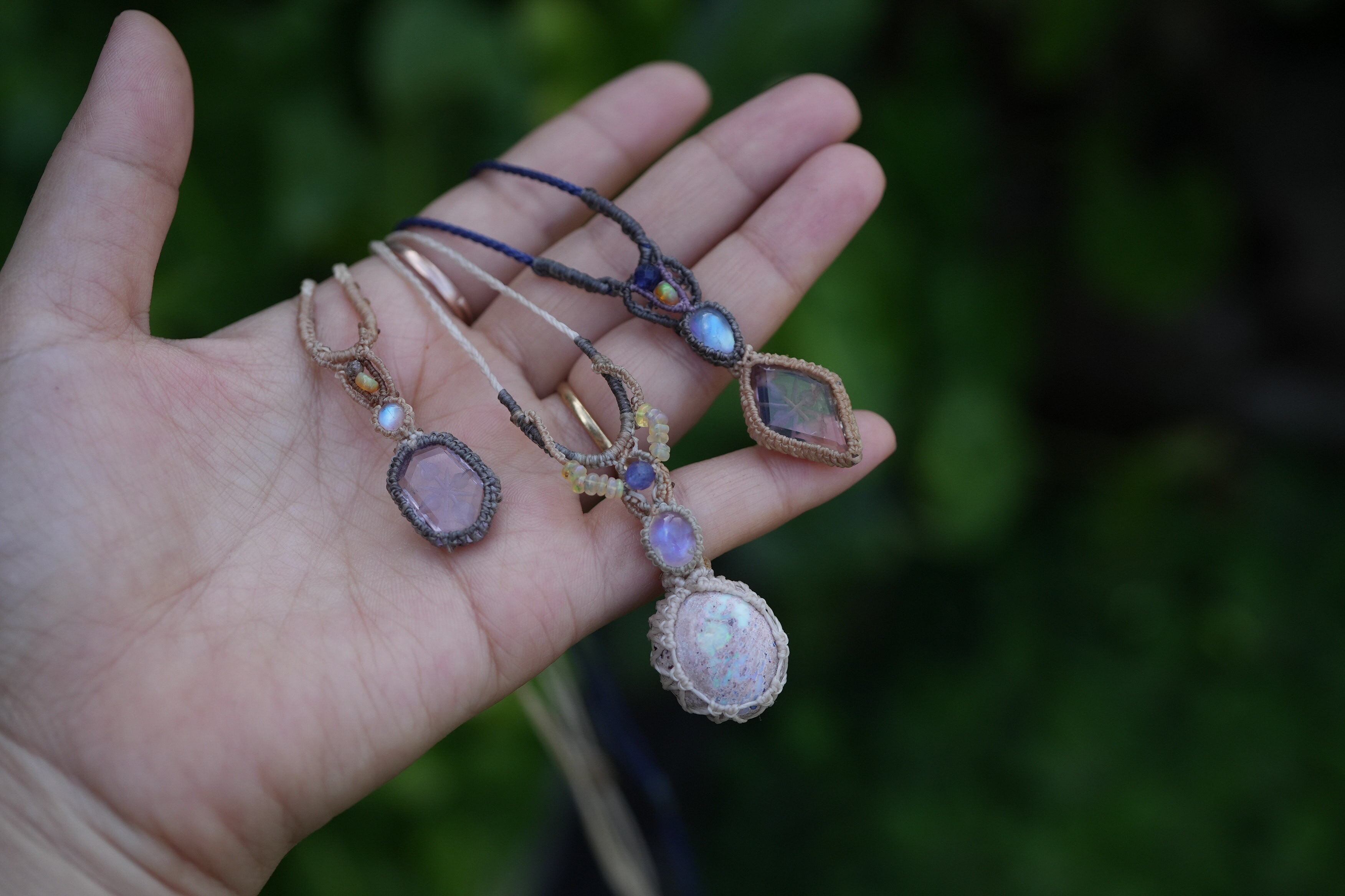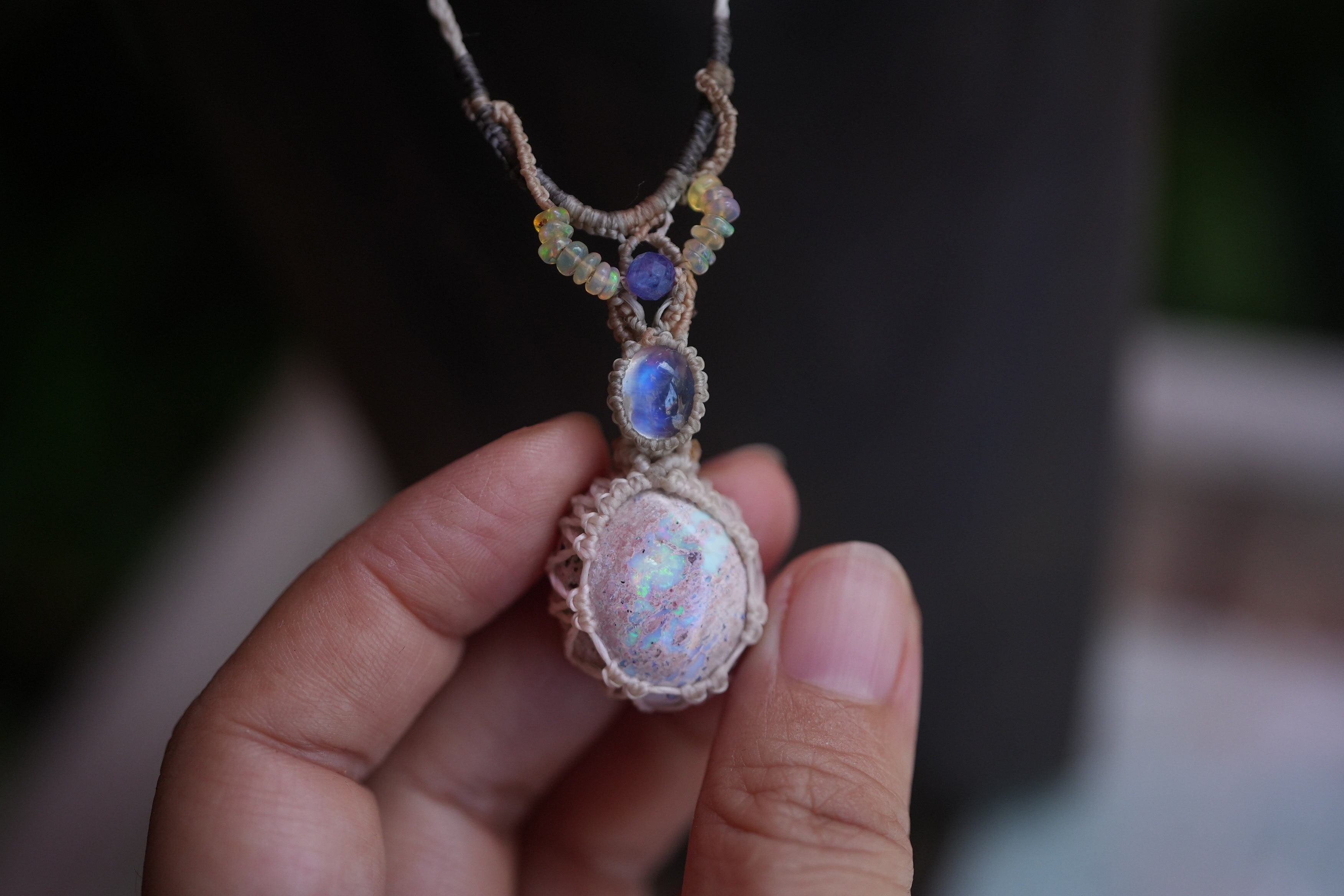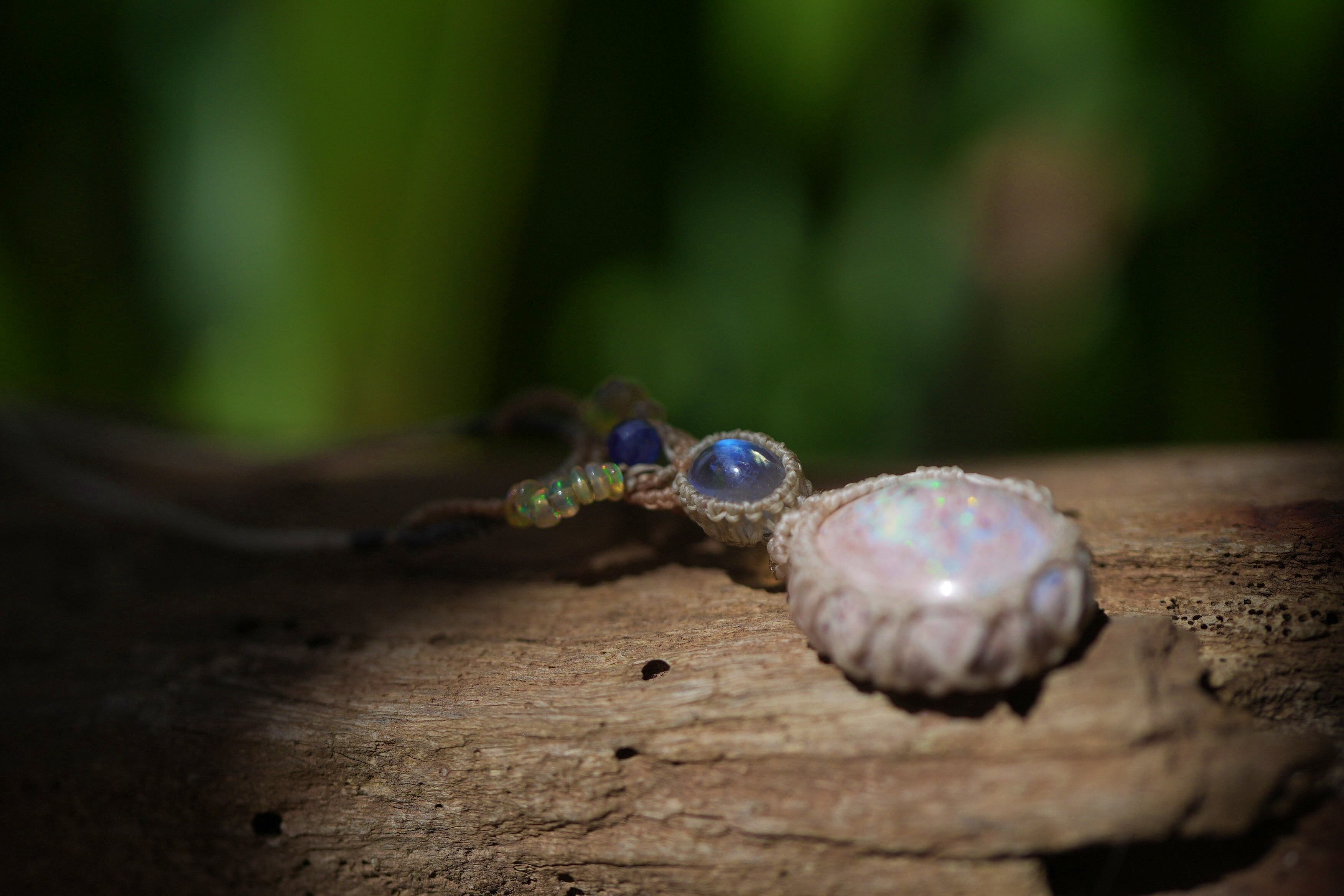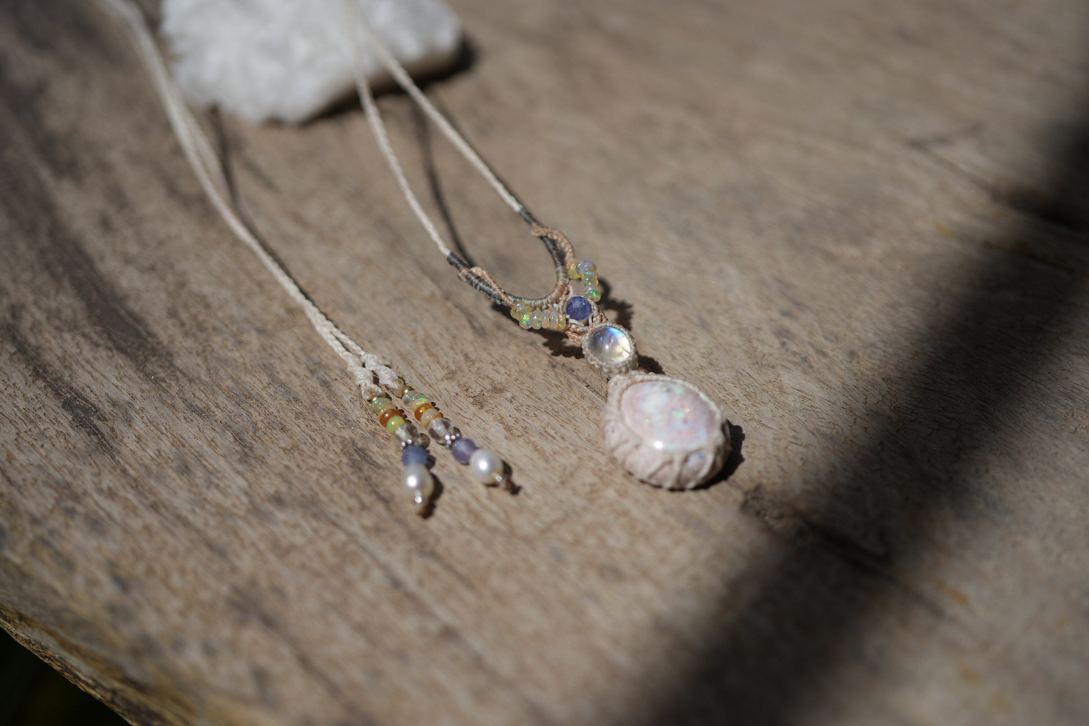 ふわふわ遊色★カンテラオパール★高品質moonstone マクラメネックレス1982