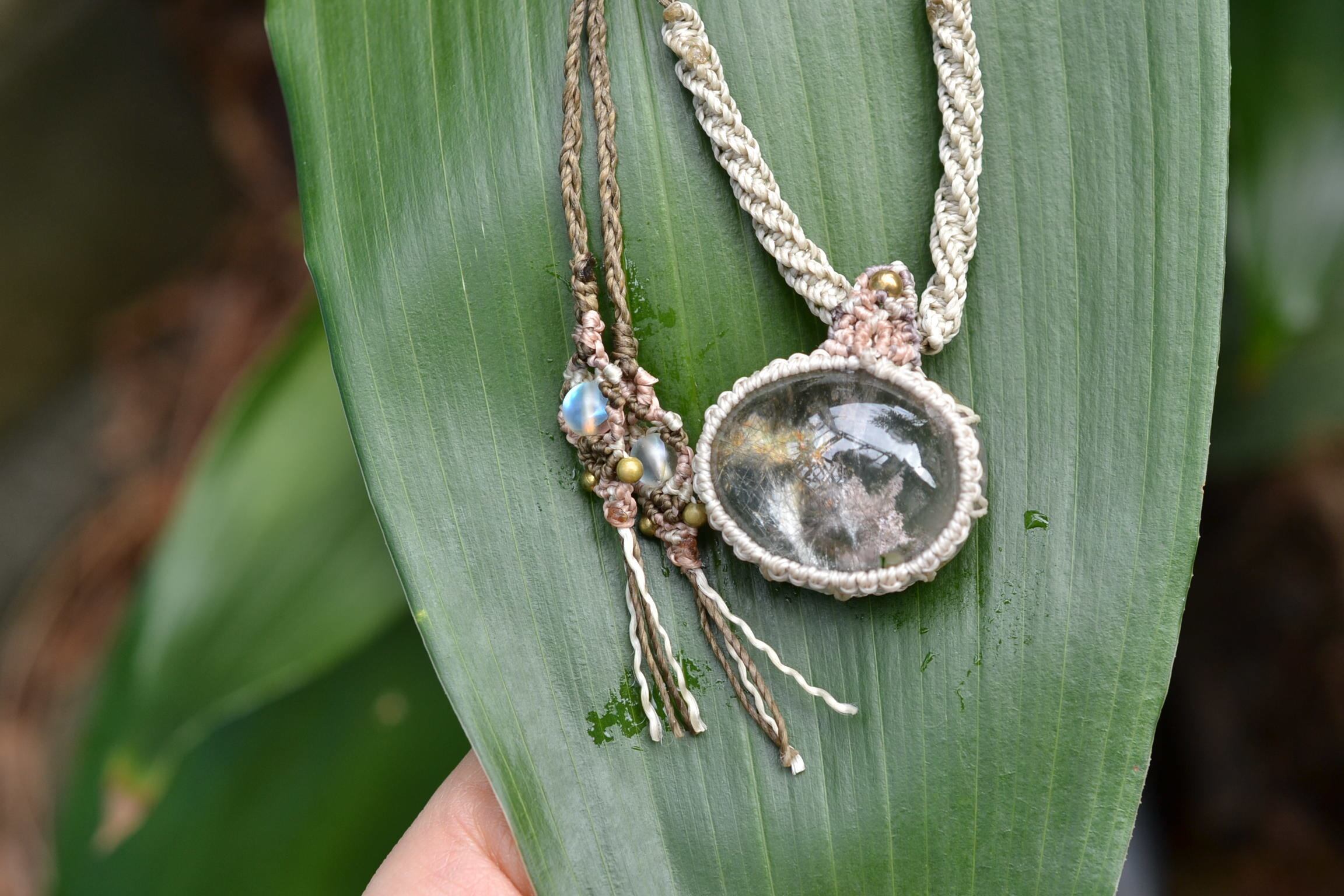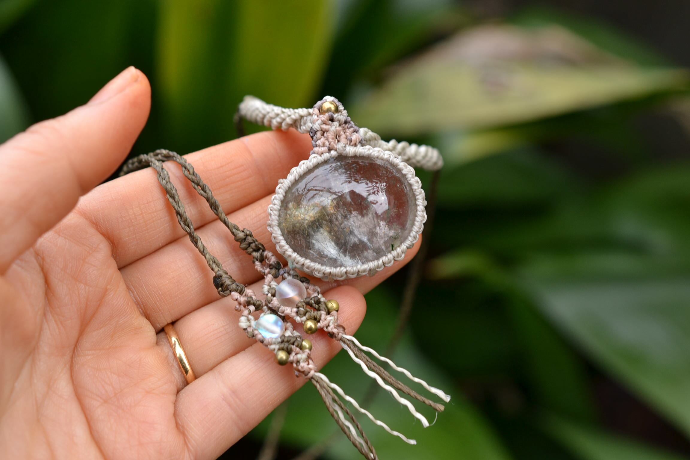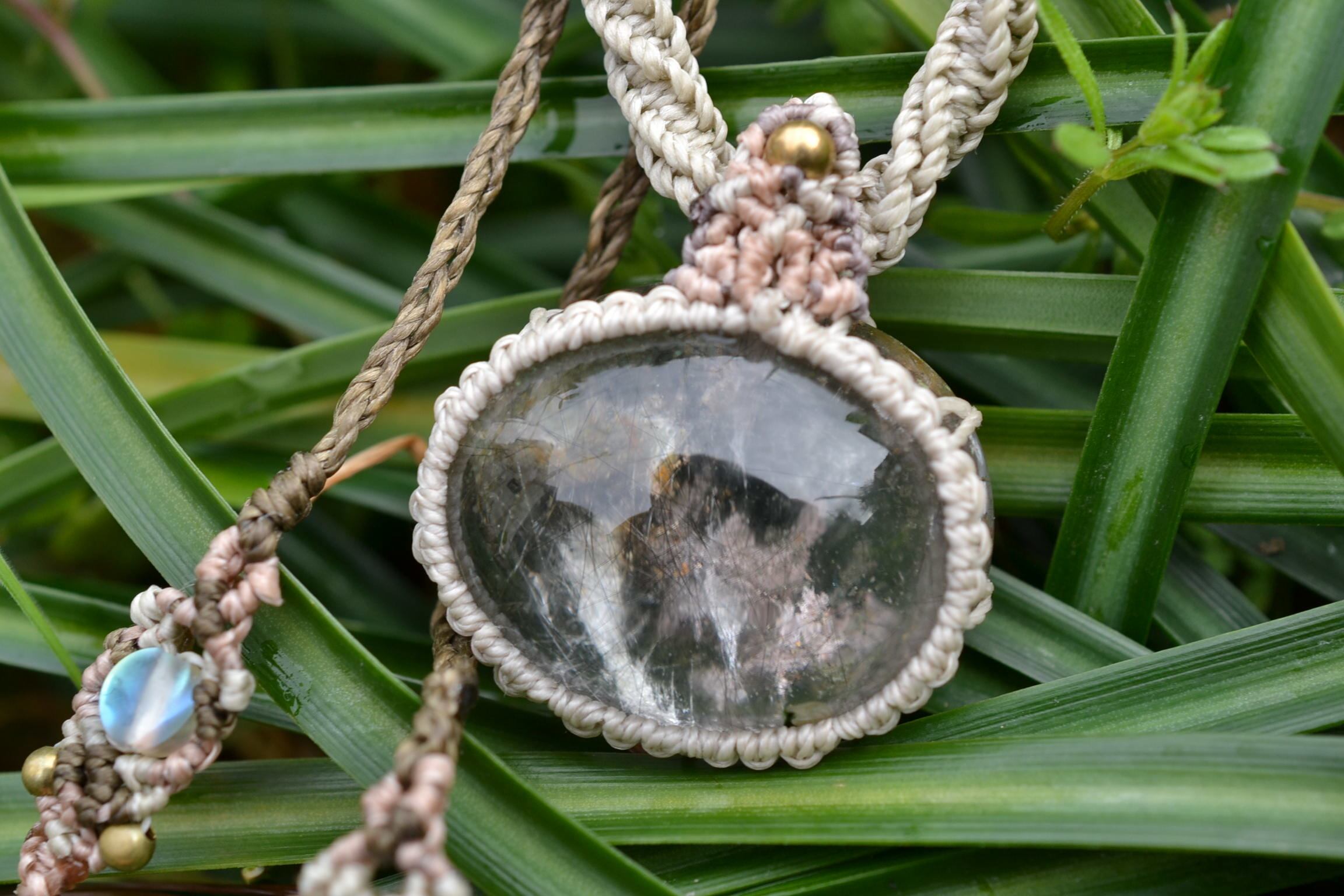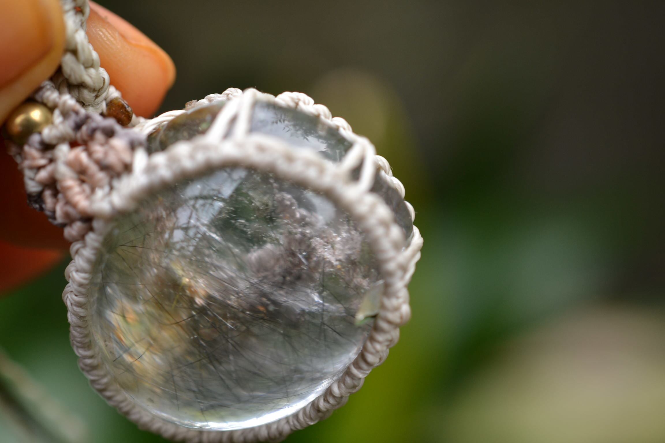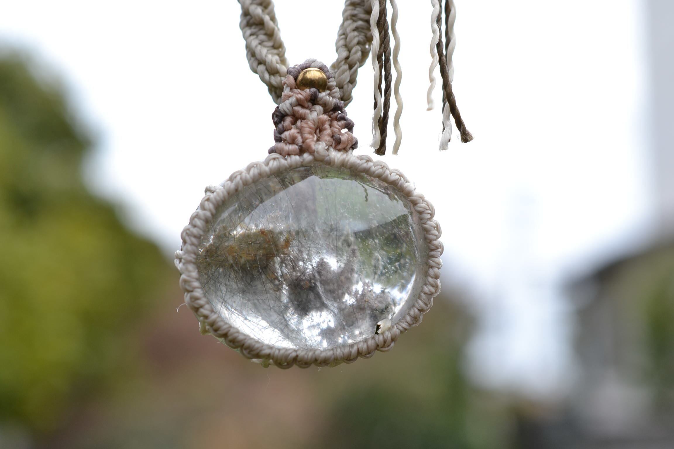 針水晶(ブラックルチル)と庭水晶(ガーデンクォーツ)がミックスされた、世にも美しいガーデンルチルクォーツをシンプルに石の隅々まで楽しめるようマクラメ編み装飾を施しペンダントに仕上げました。