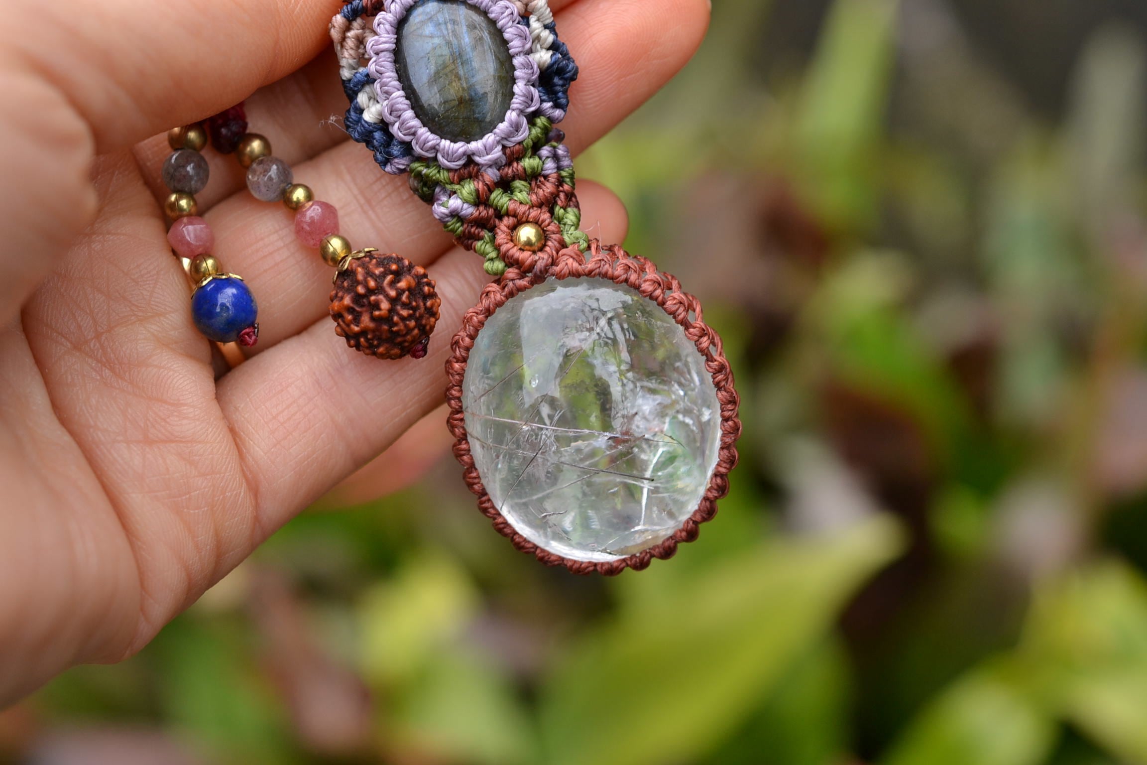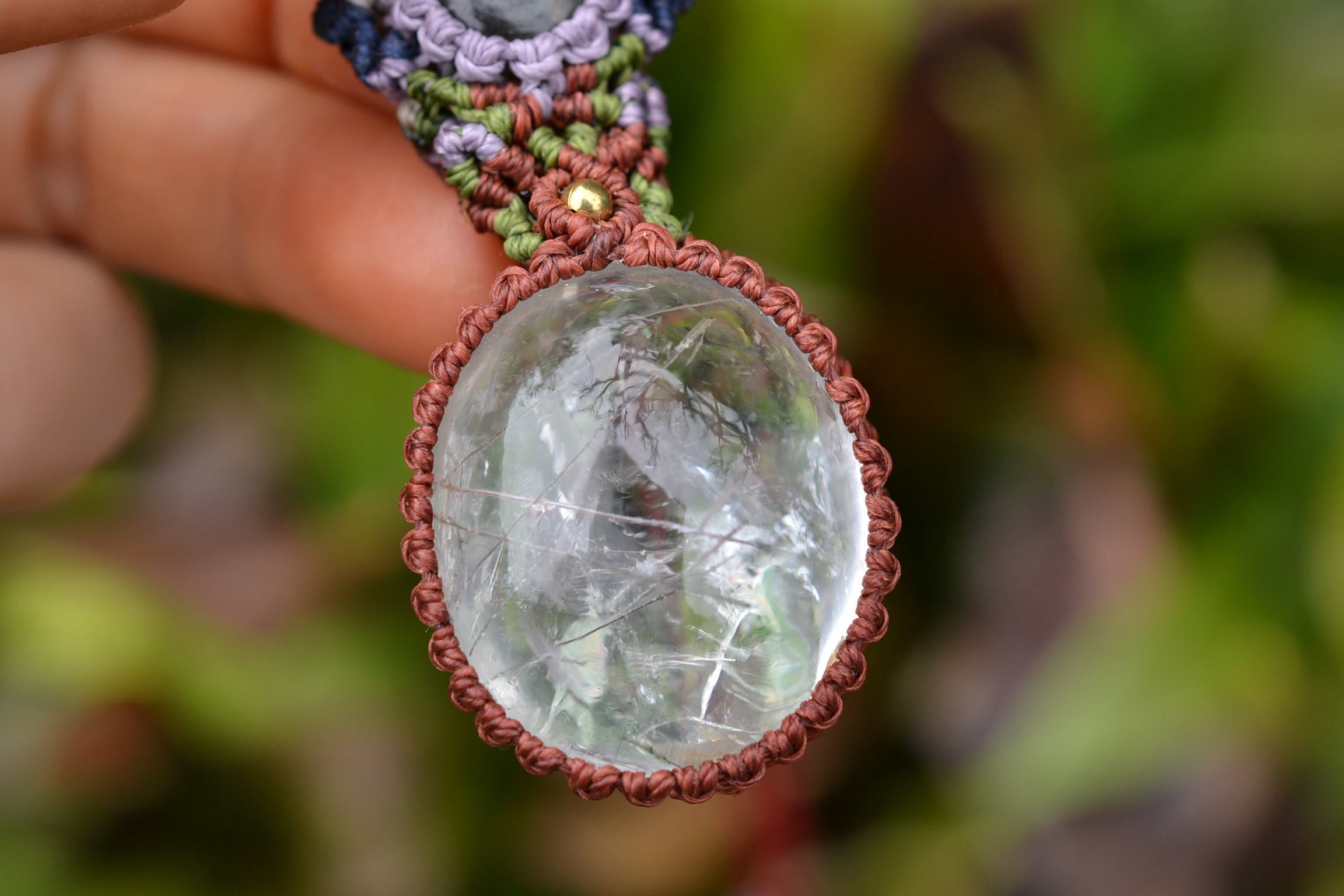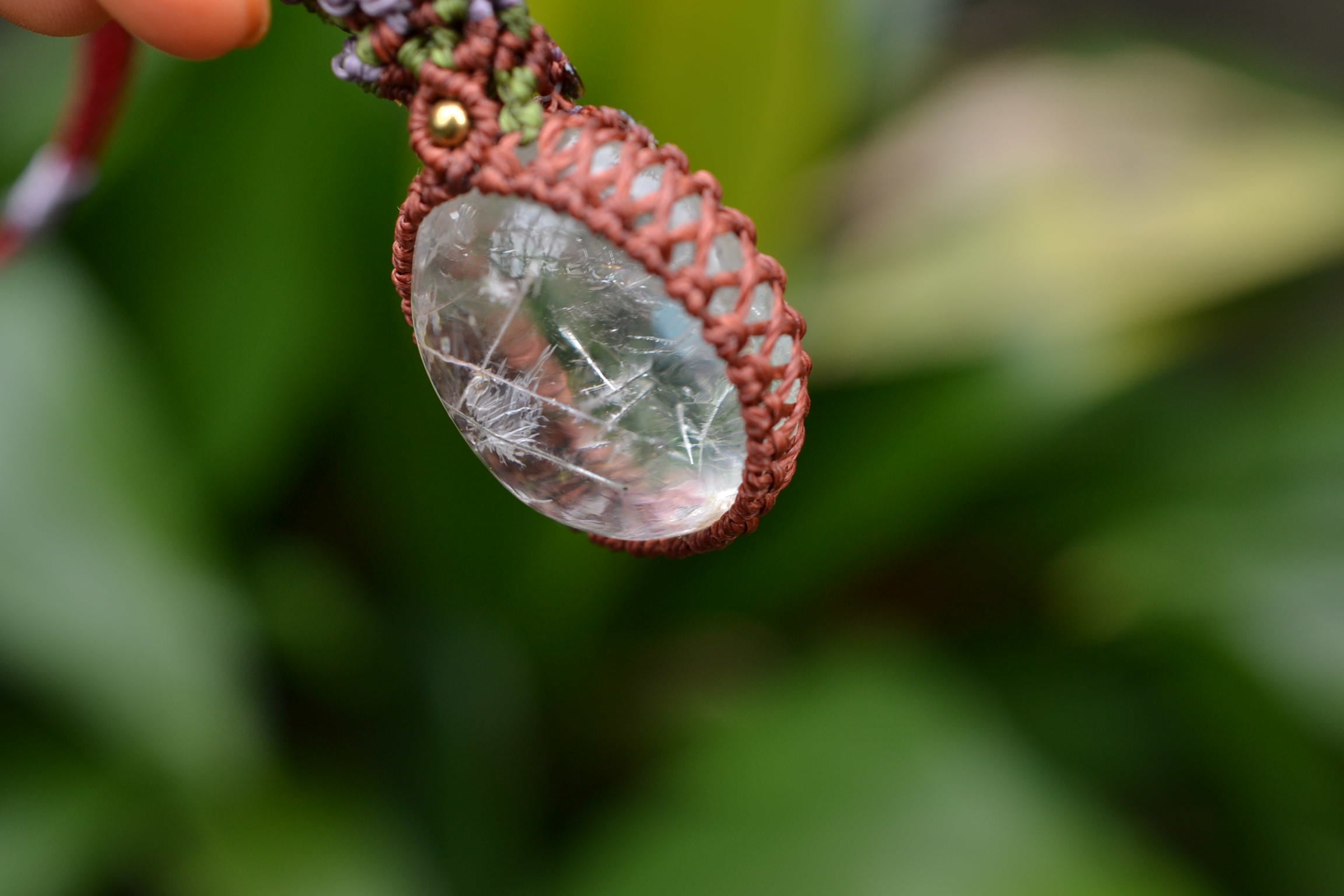 ルチル入り水晶にはシラーや石の気泡を見ることができます。それぞれの石にそれぞれの物語を楽しめるよう、マクラメ編み装飾を施してペンダントに仕上げました。