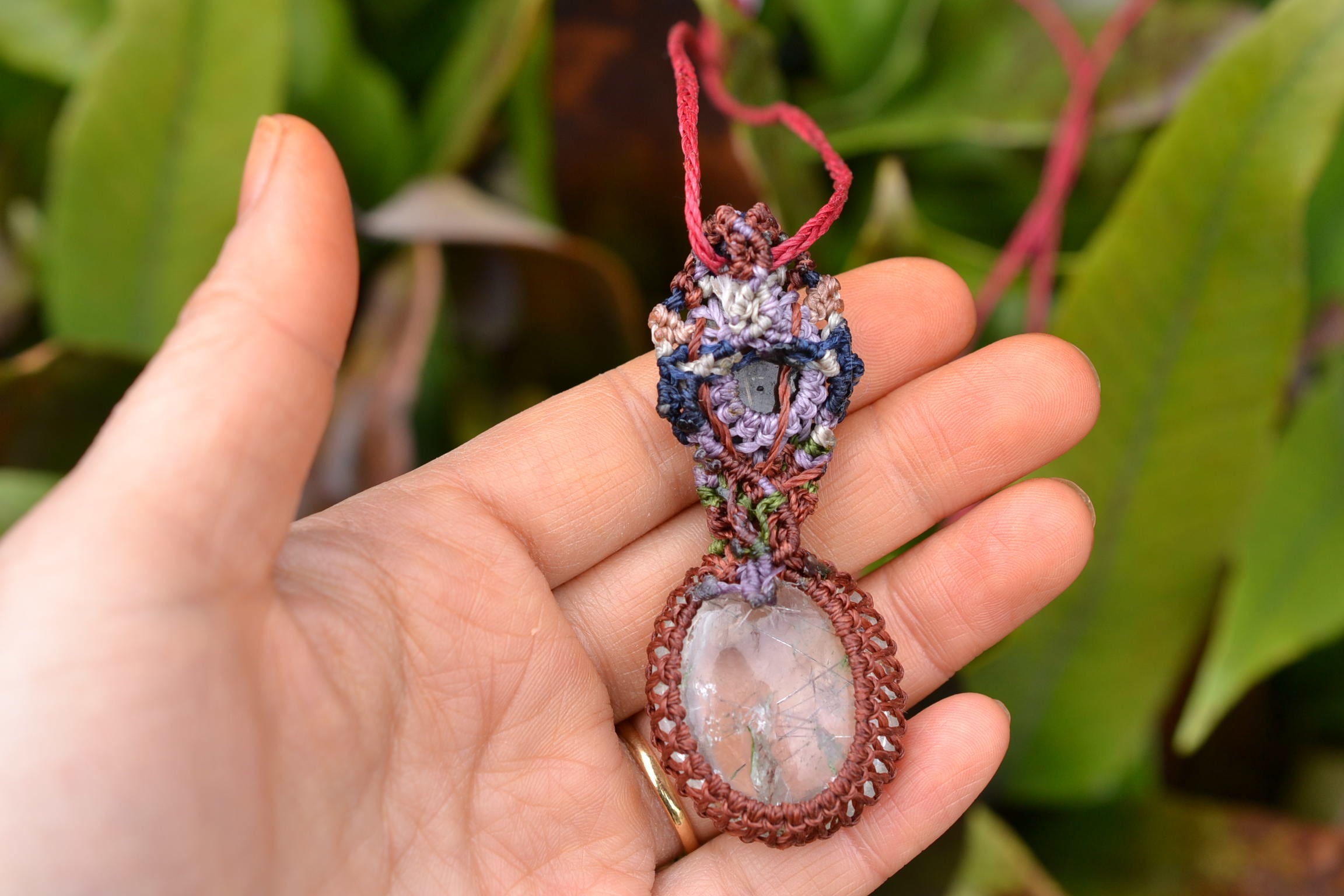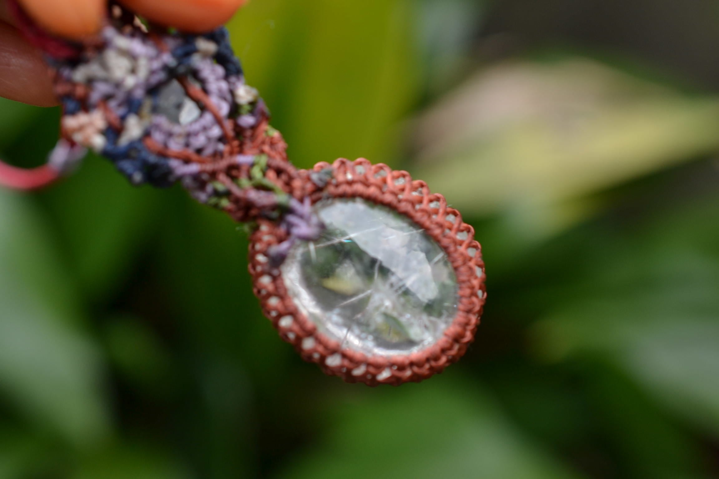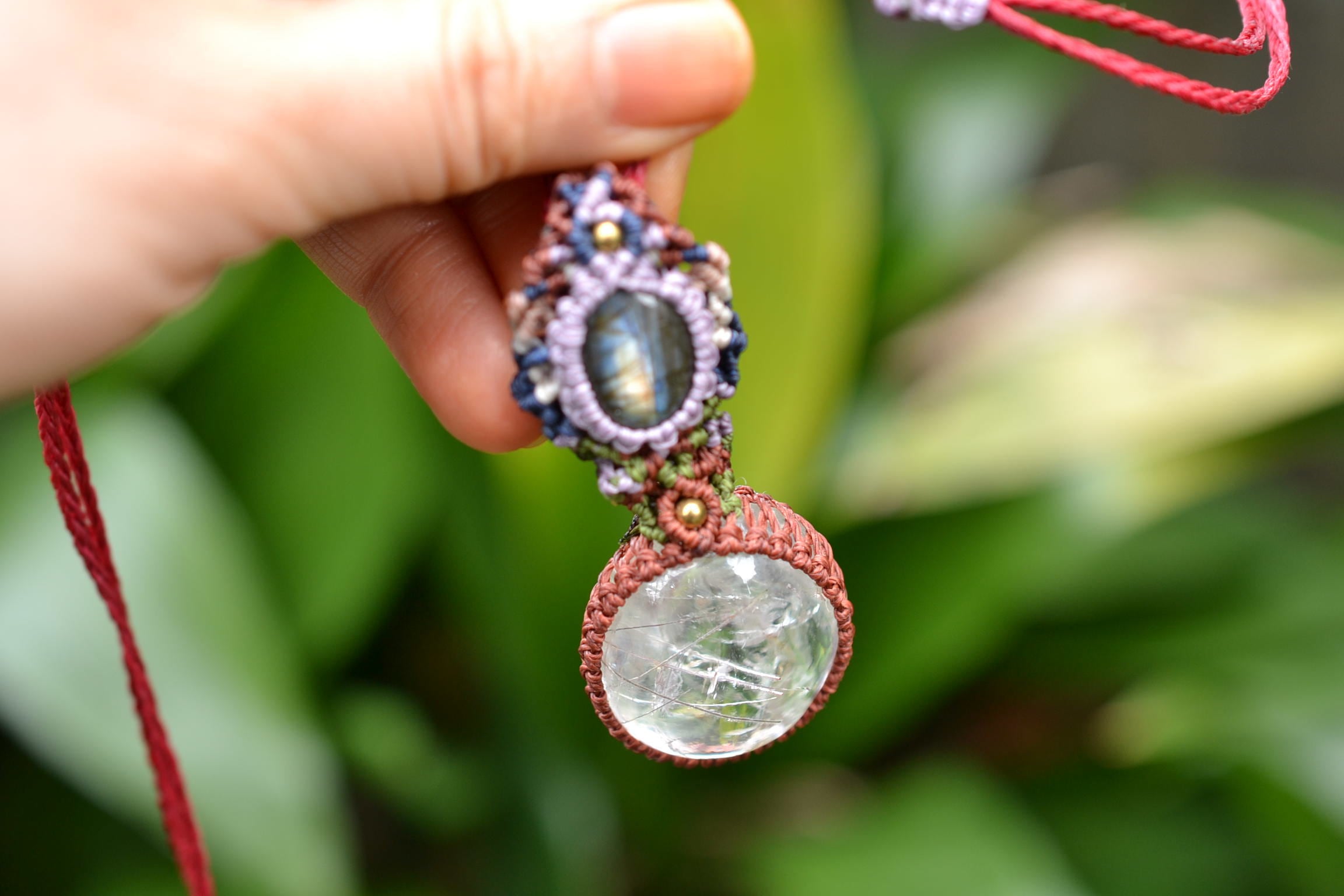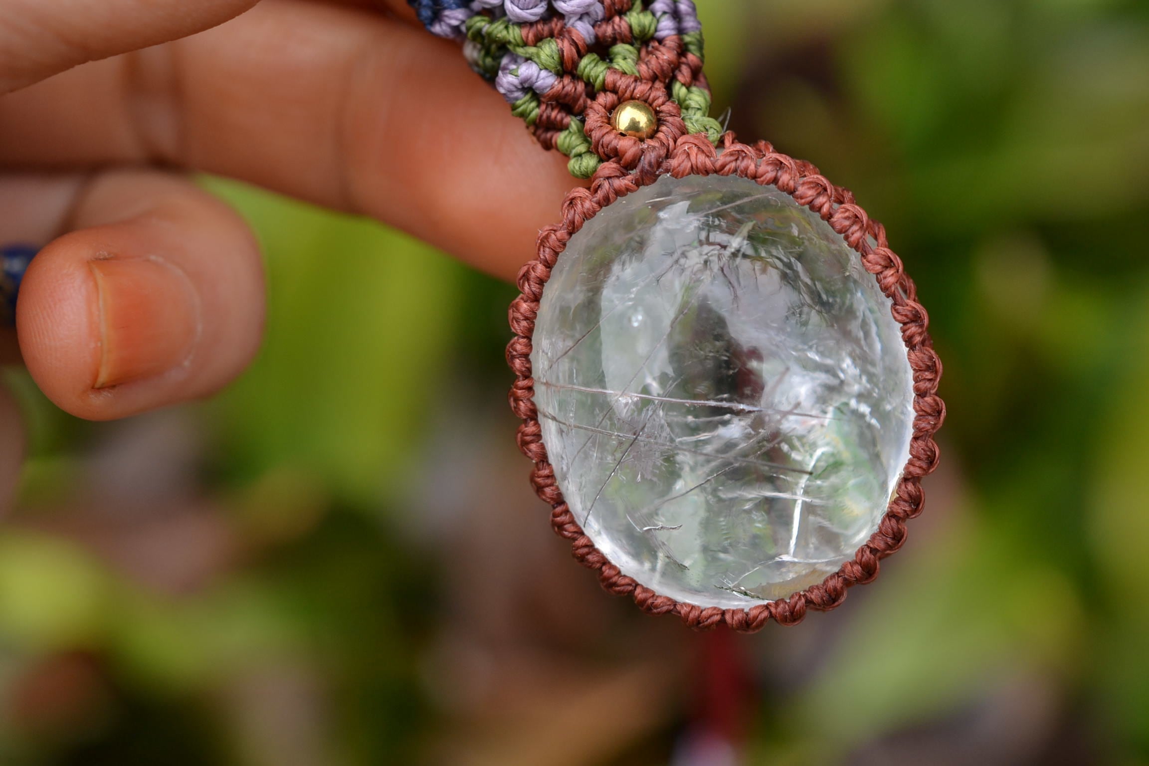 ルチル入り水晶にはシラーや石の気泡を見ることができます。それぞれの石にそれぞれの物語を楽しめるよう、マクラメ編み装飾を施してペンダントに仕上げました。