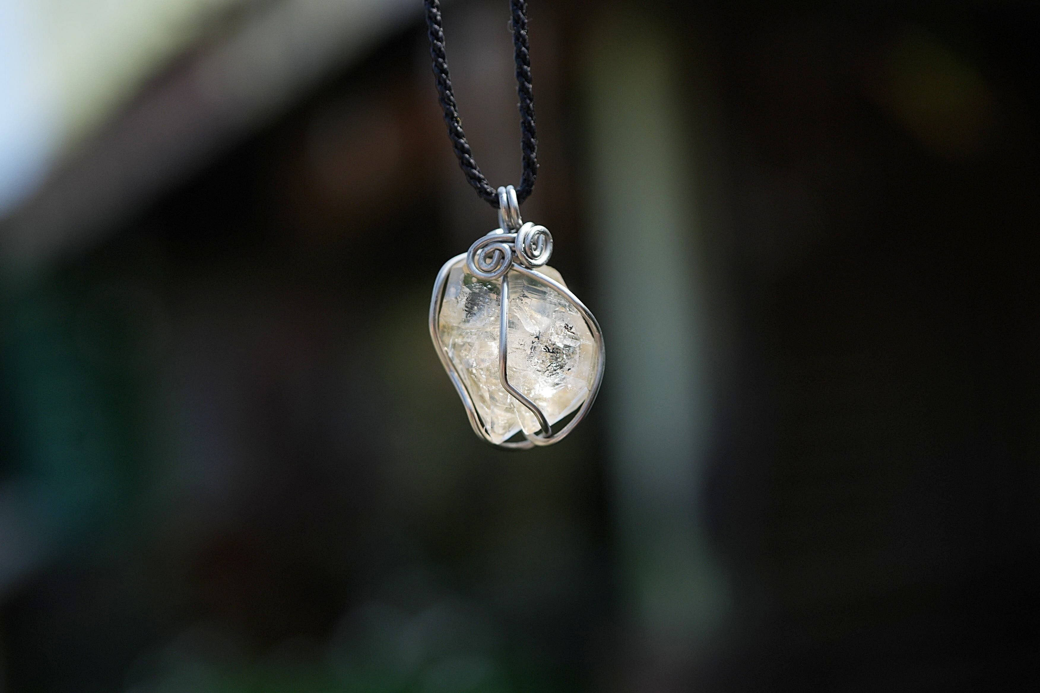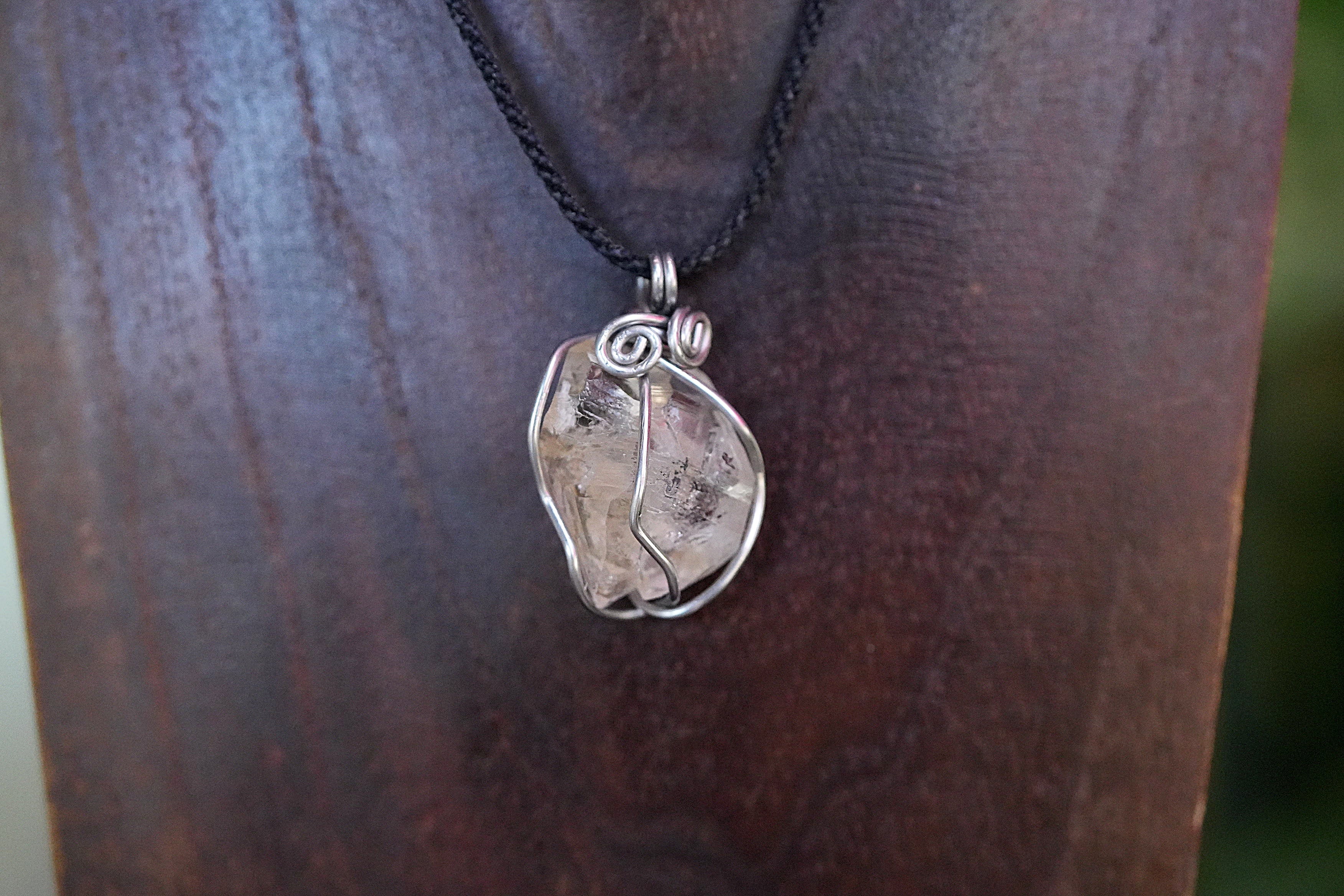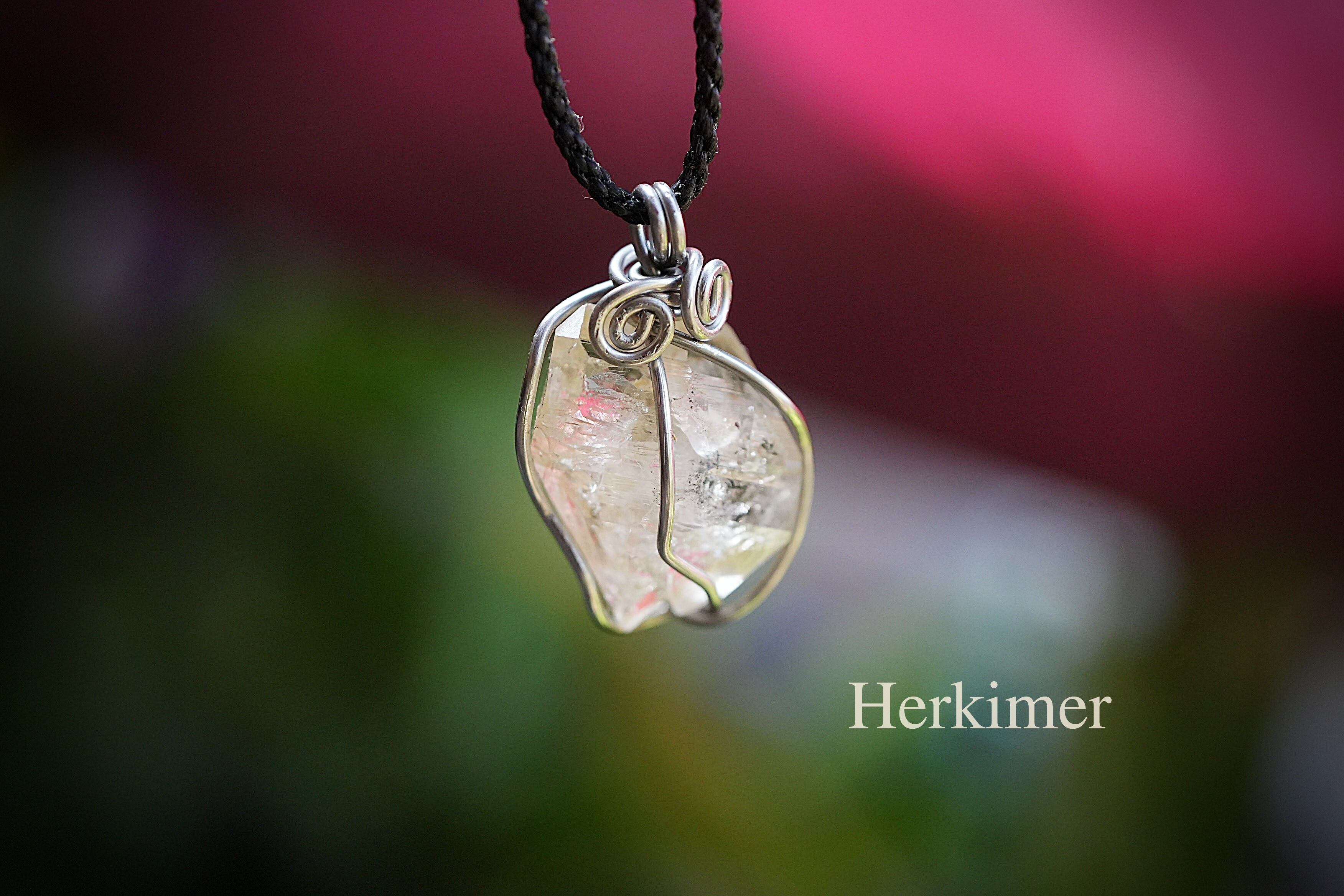 ハーキマー水晶のカットに沿って太めのワイヤーを巻き込んだペンダント。しっかりと水晶を捉えています。
