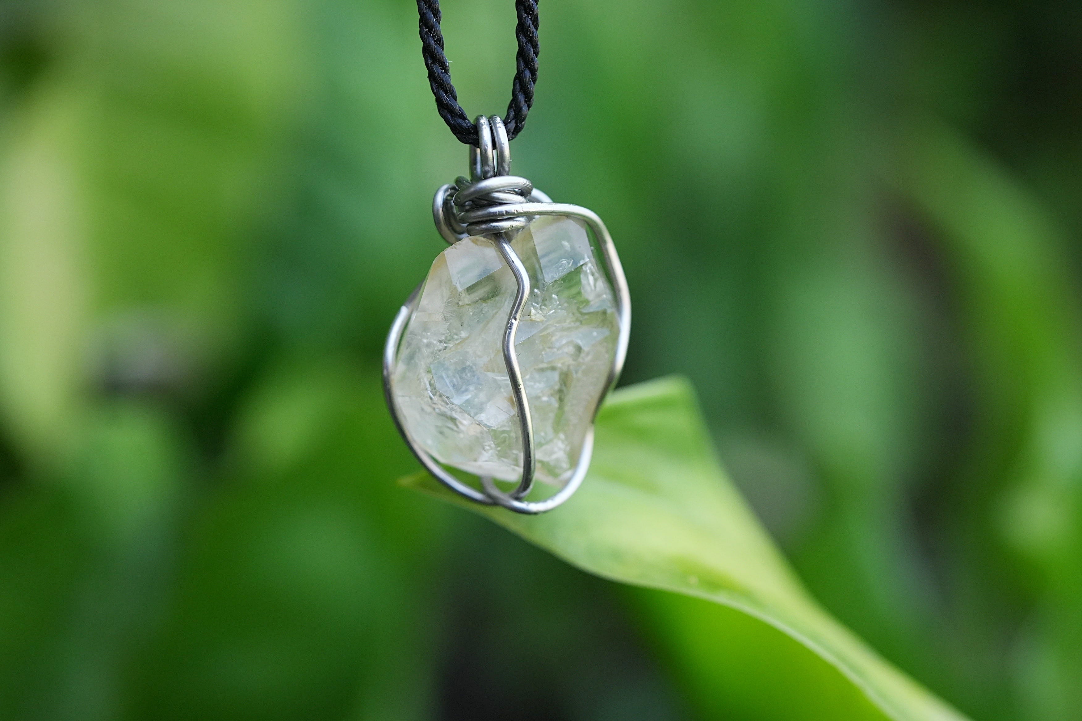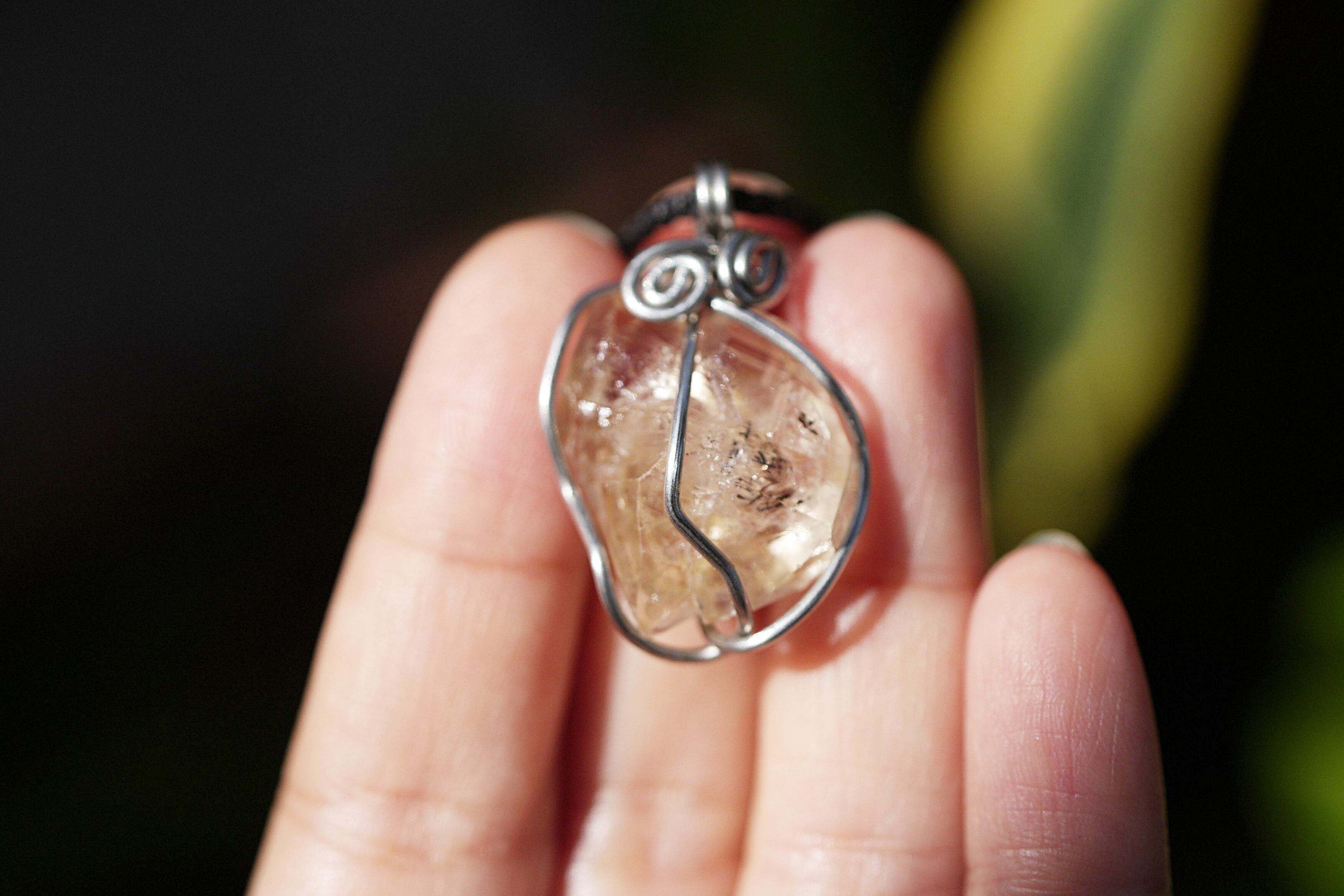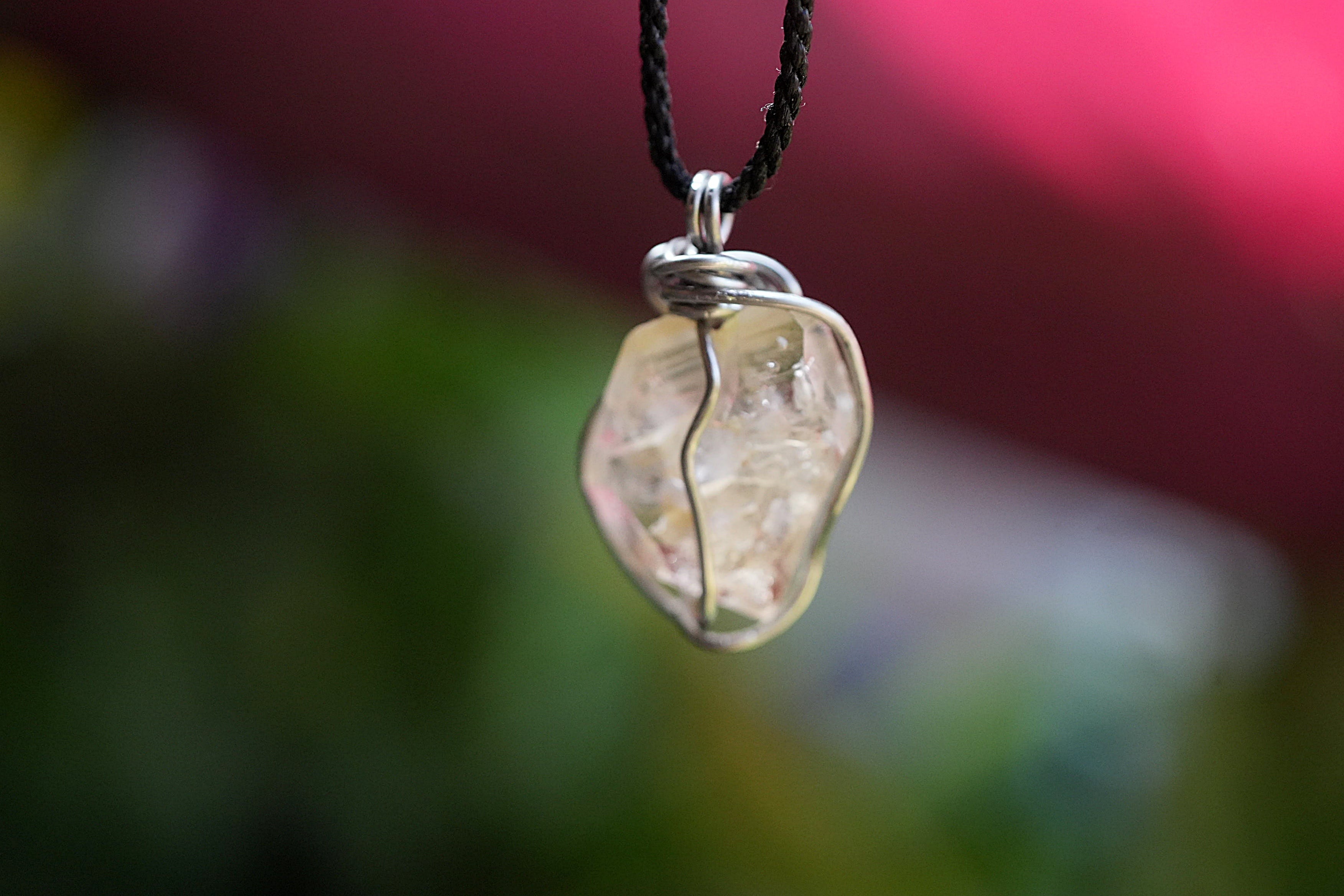 ハーキマー水晶のカットに沿って太めのワイヤーを巻き込んだペンダント。しっかりと水晶を捉えています。