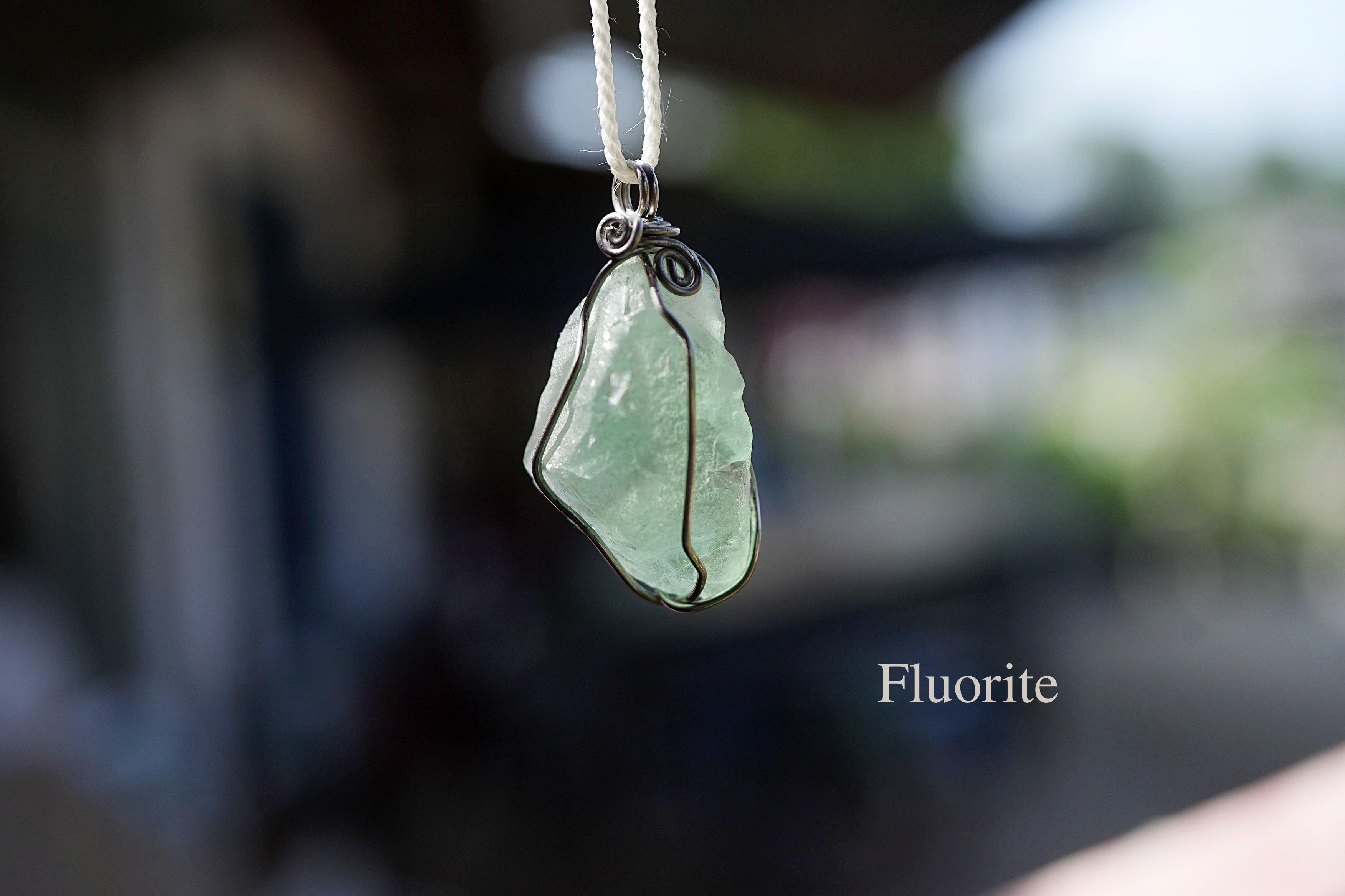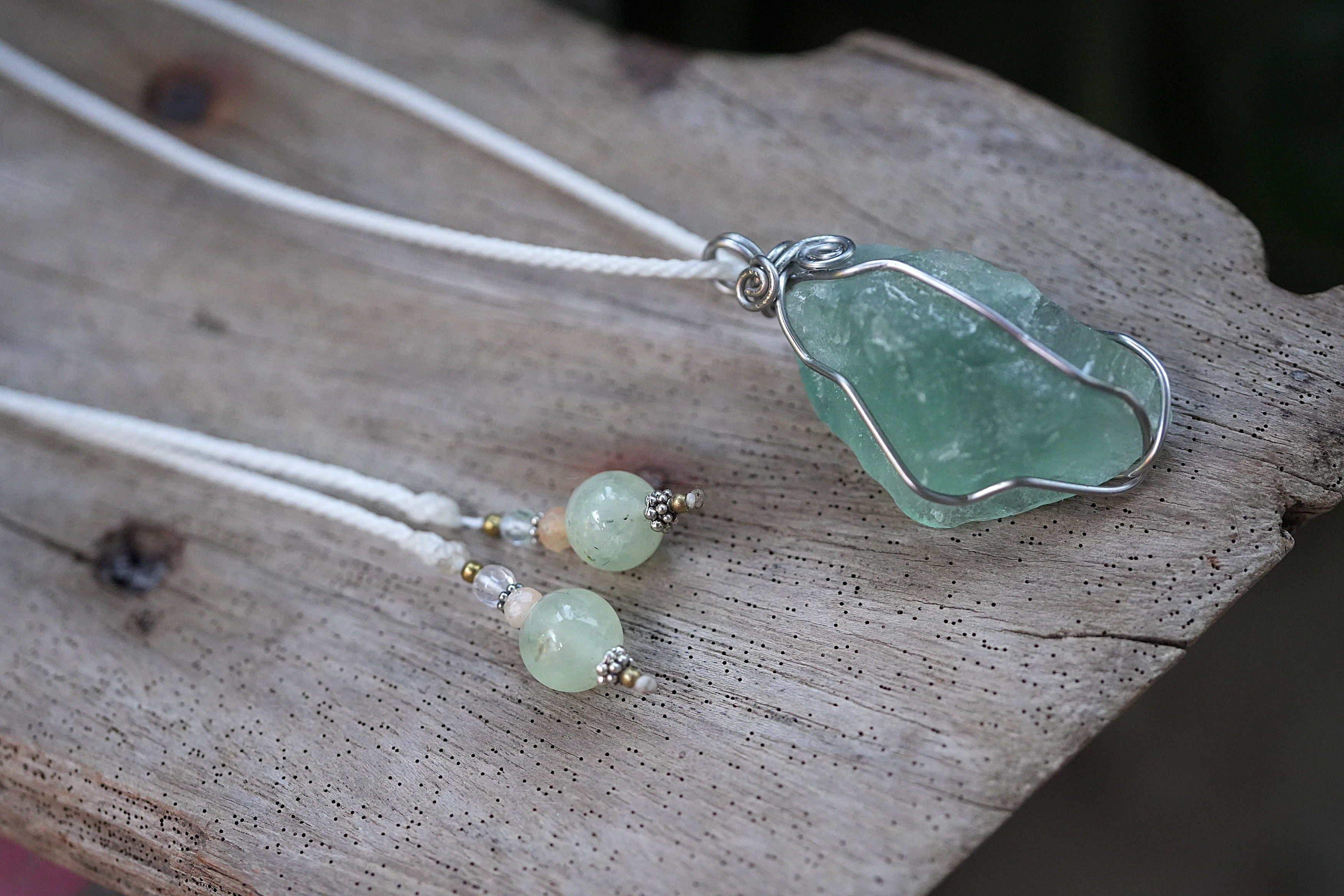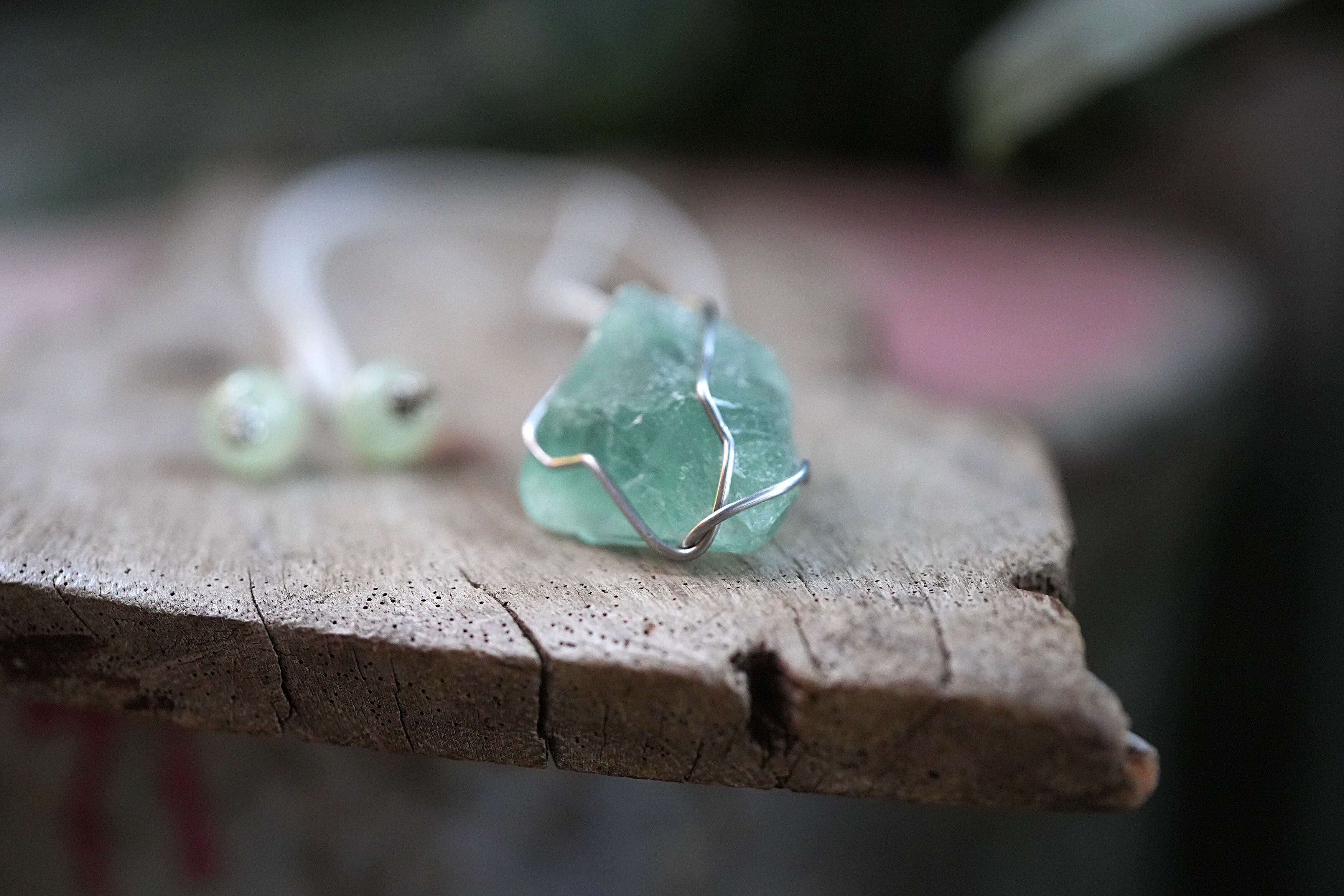 グリーンフローライト原石を使用し、ワイヤーワークを施してペンダントを仕上げました。