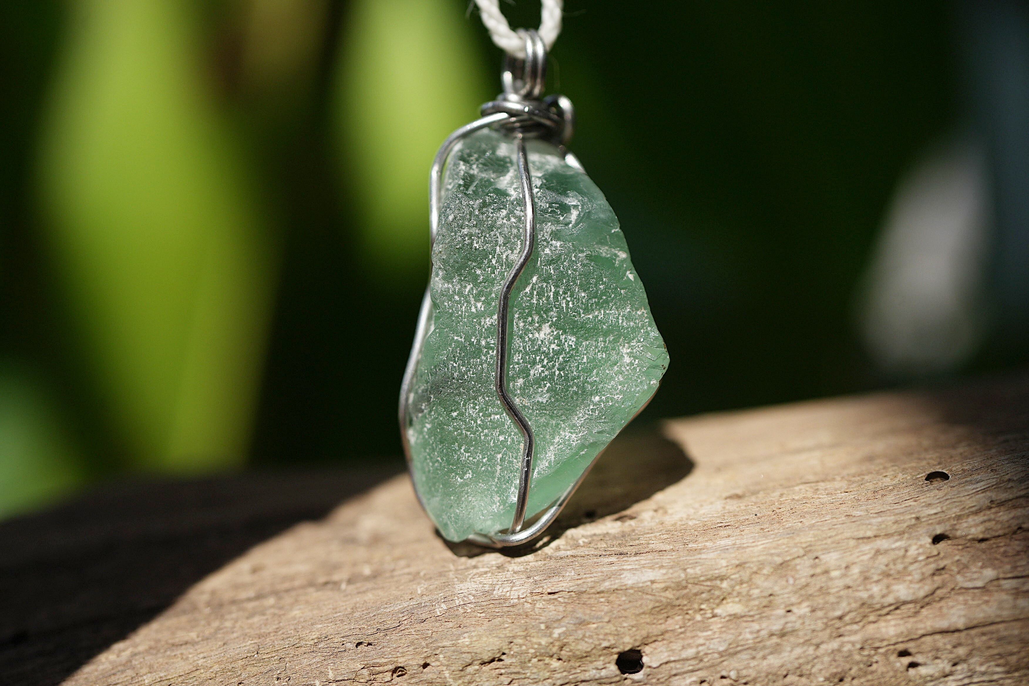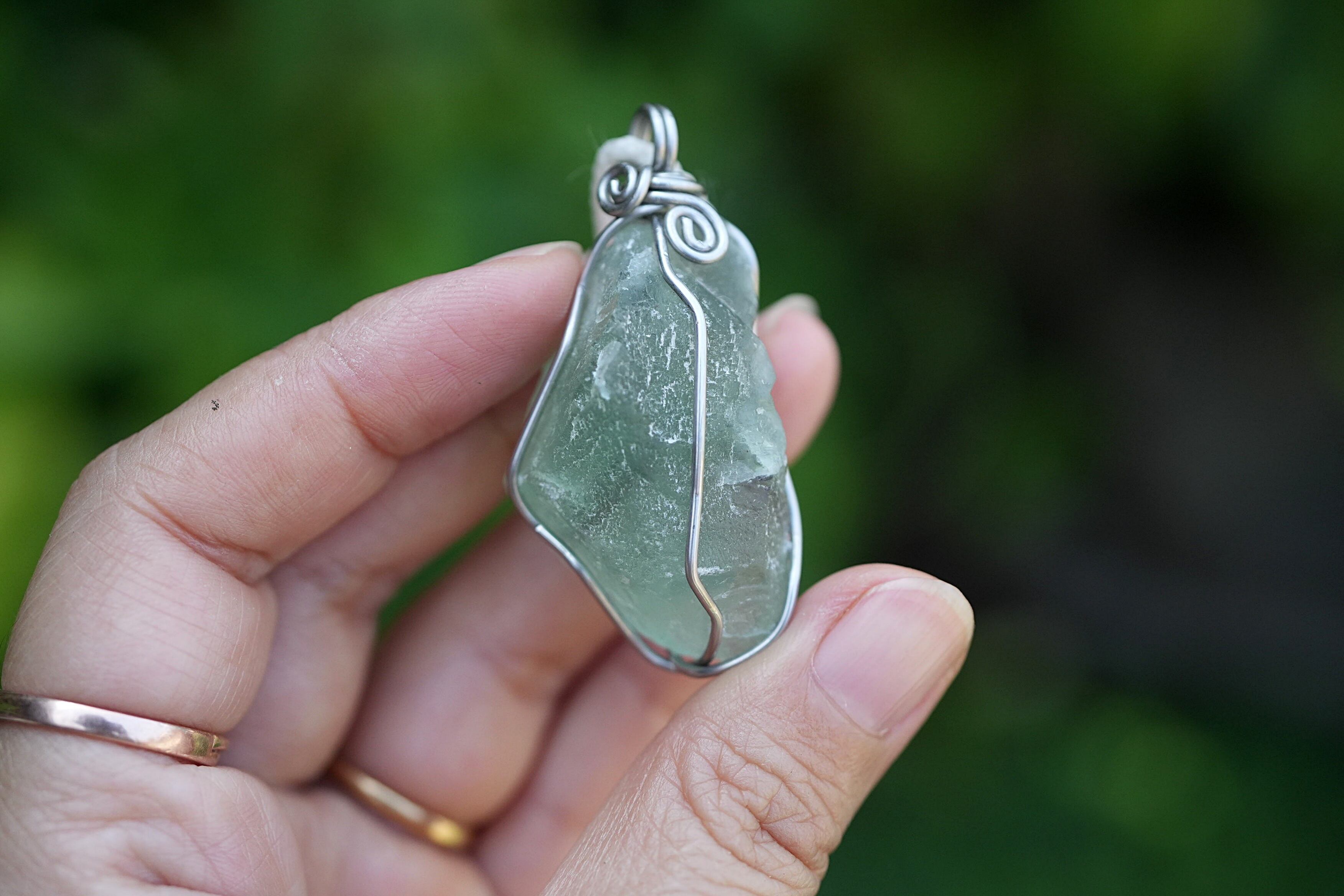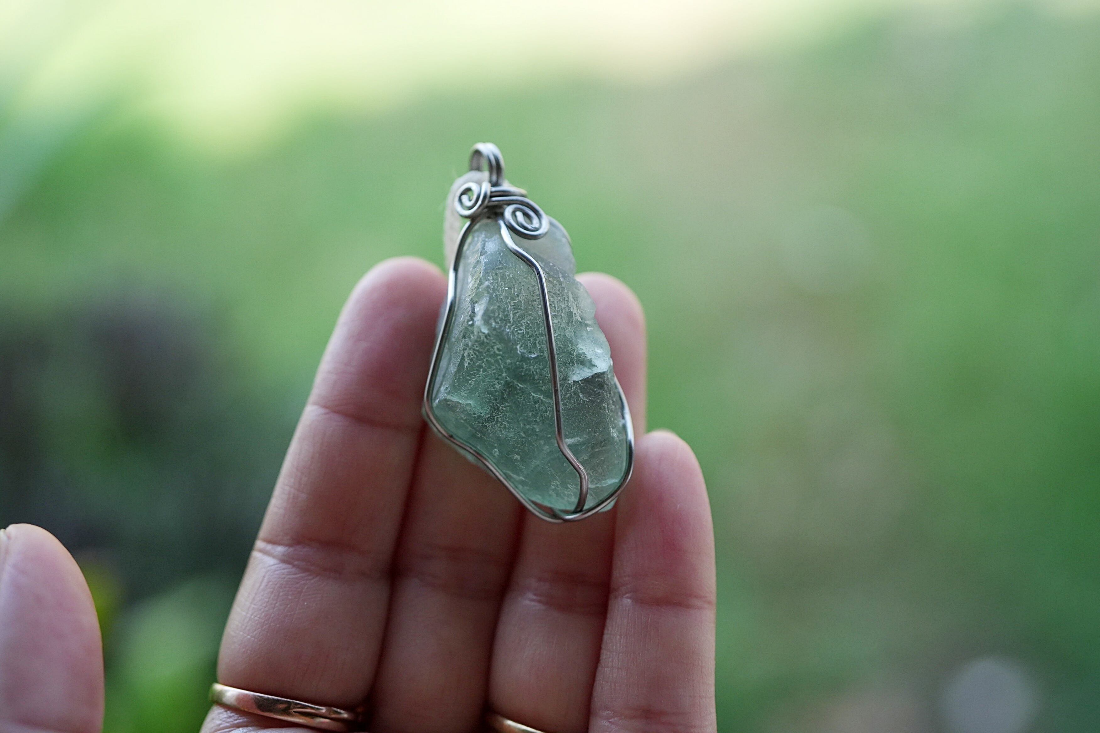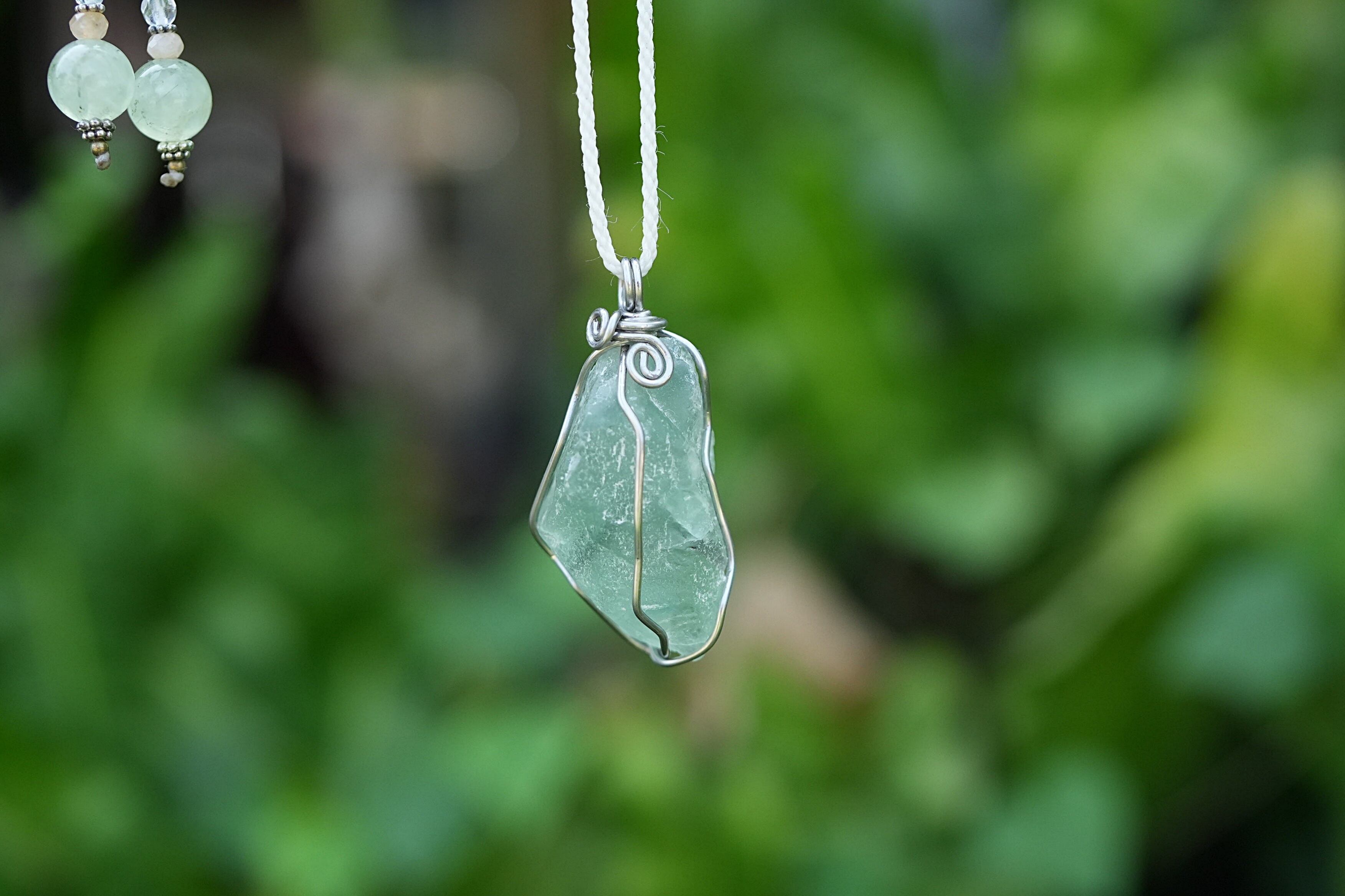 グリーンフローライト原石を使用し、ワイヤーワークを施してペンダントを仕上げました。