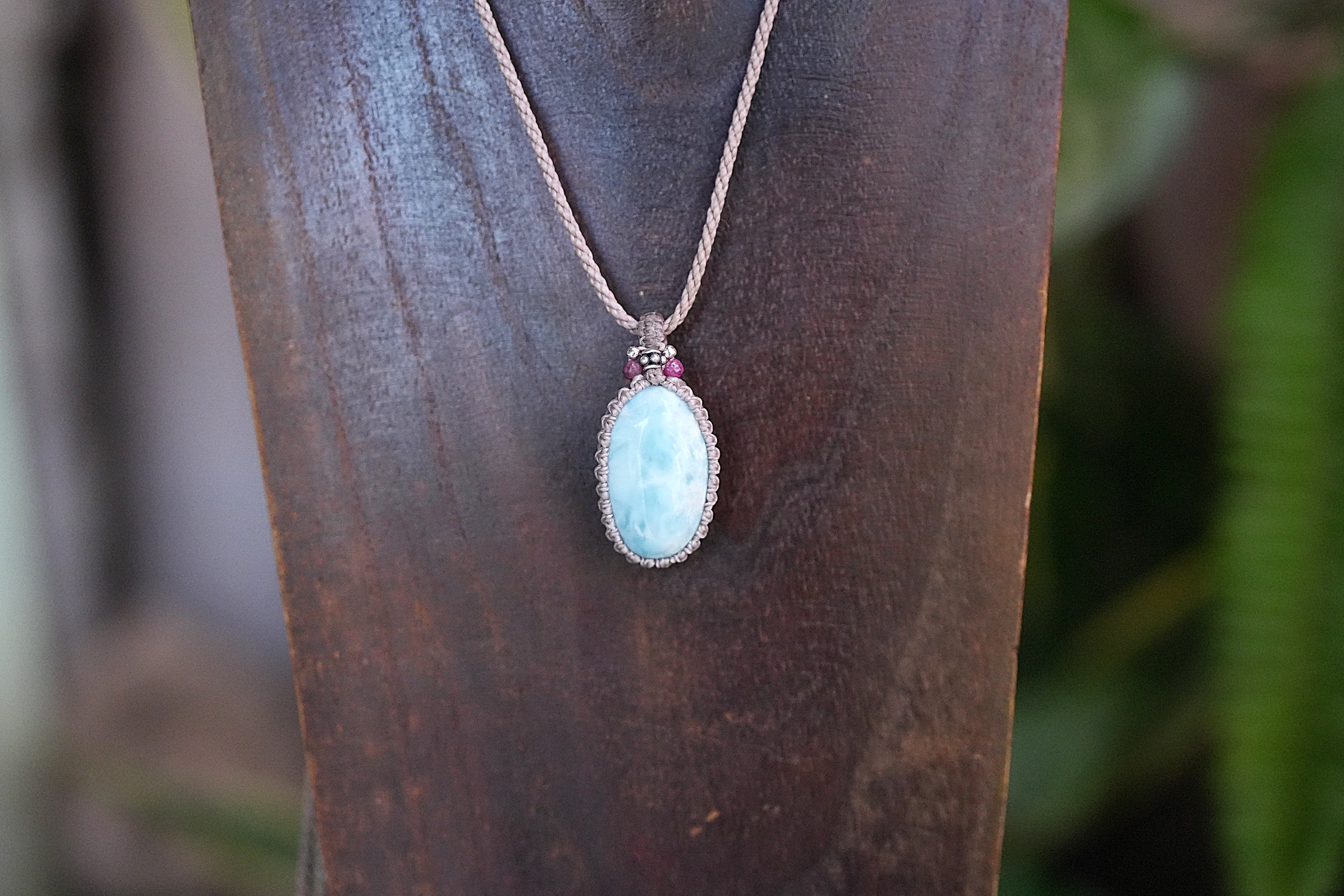 ◆このたびはヘンプ・カフェオレ色の蝋引き糸を使用しマクラメ編み装飾を施しました。