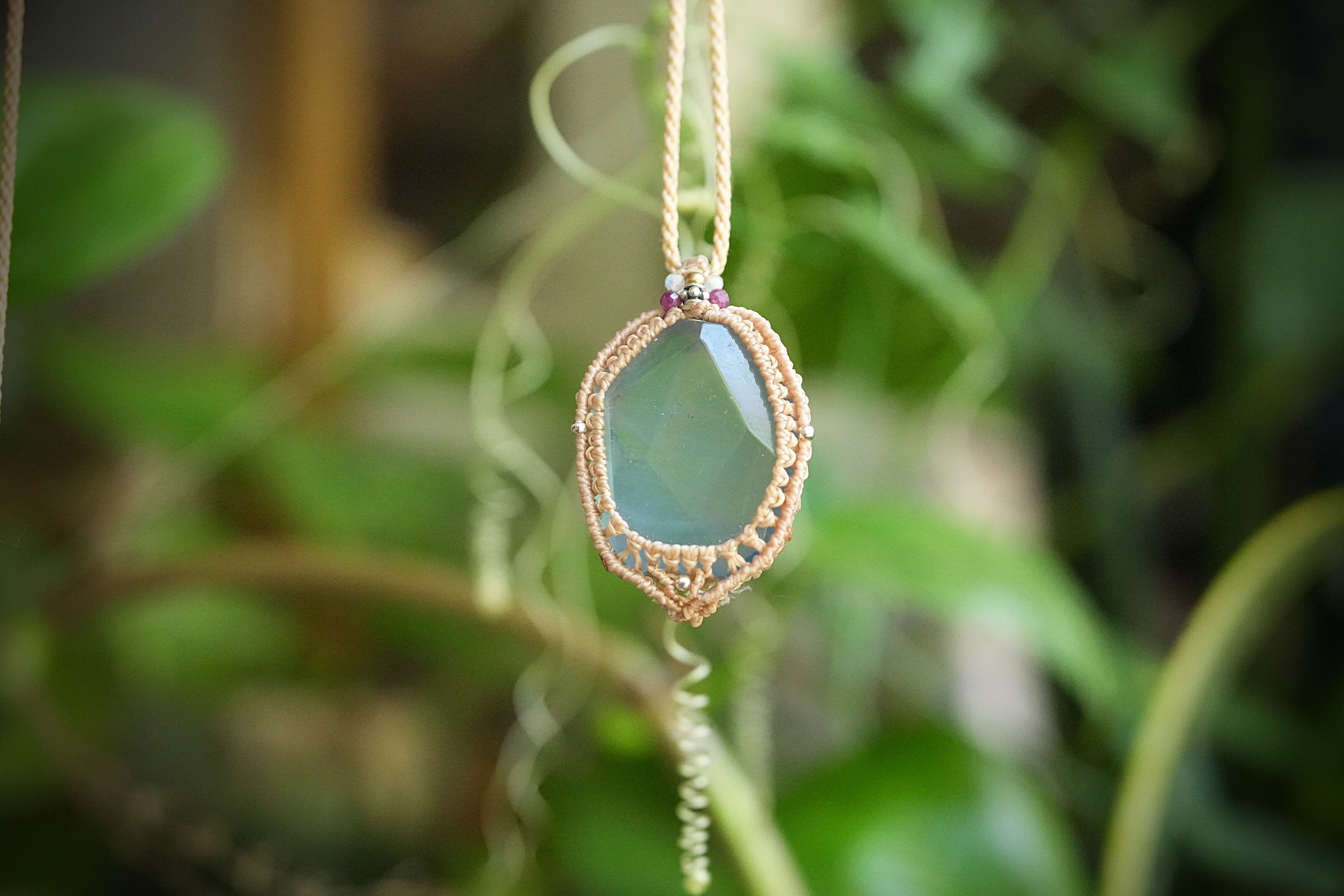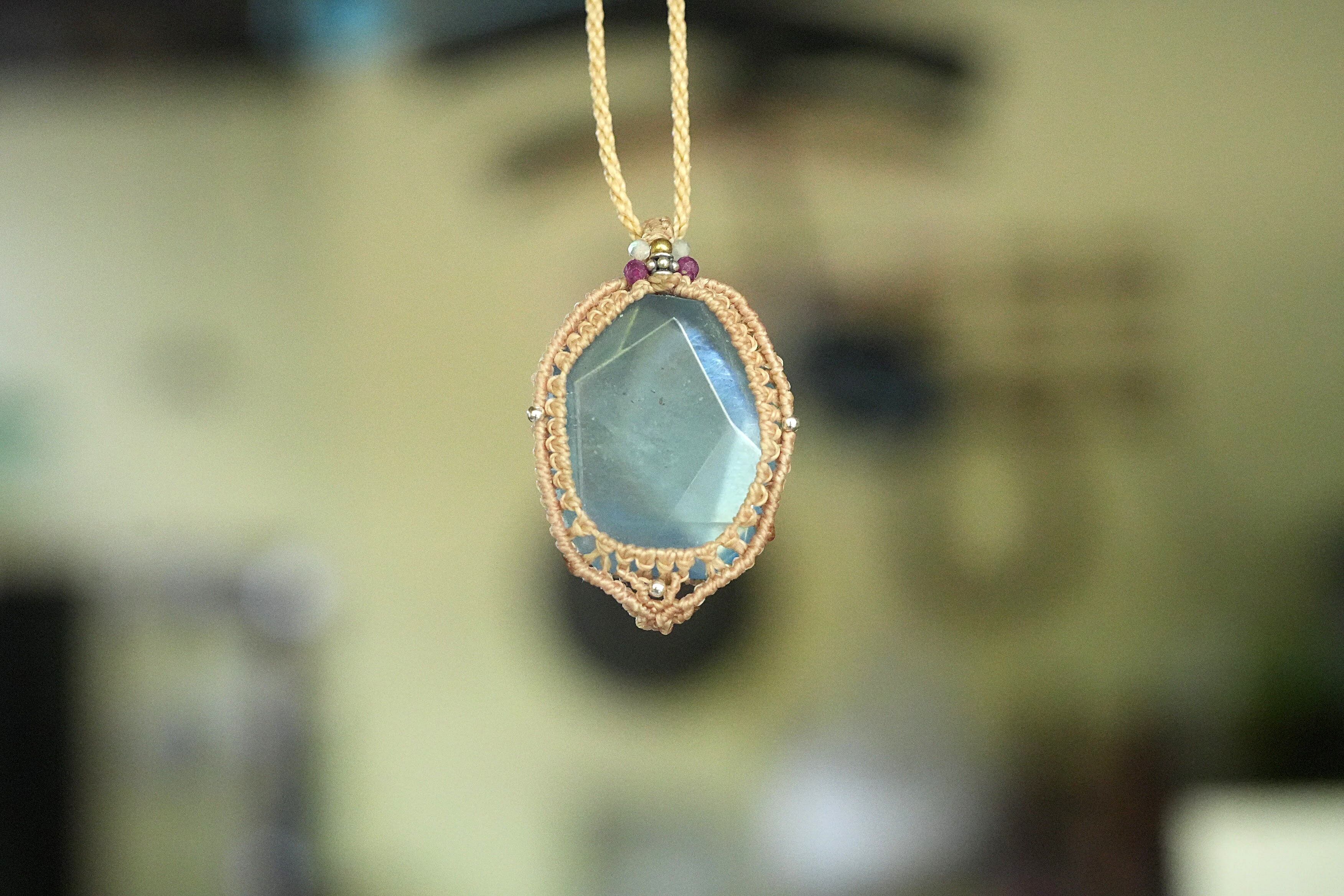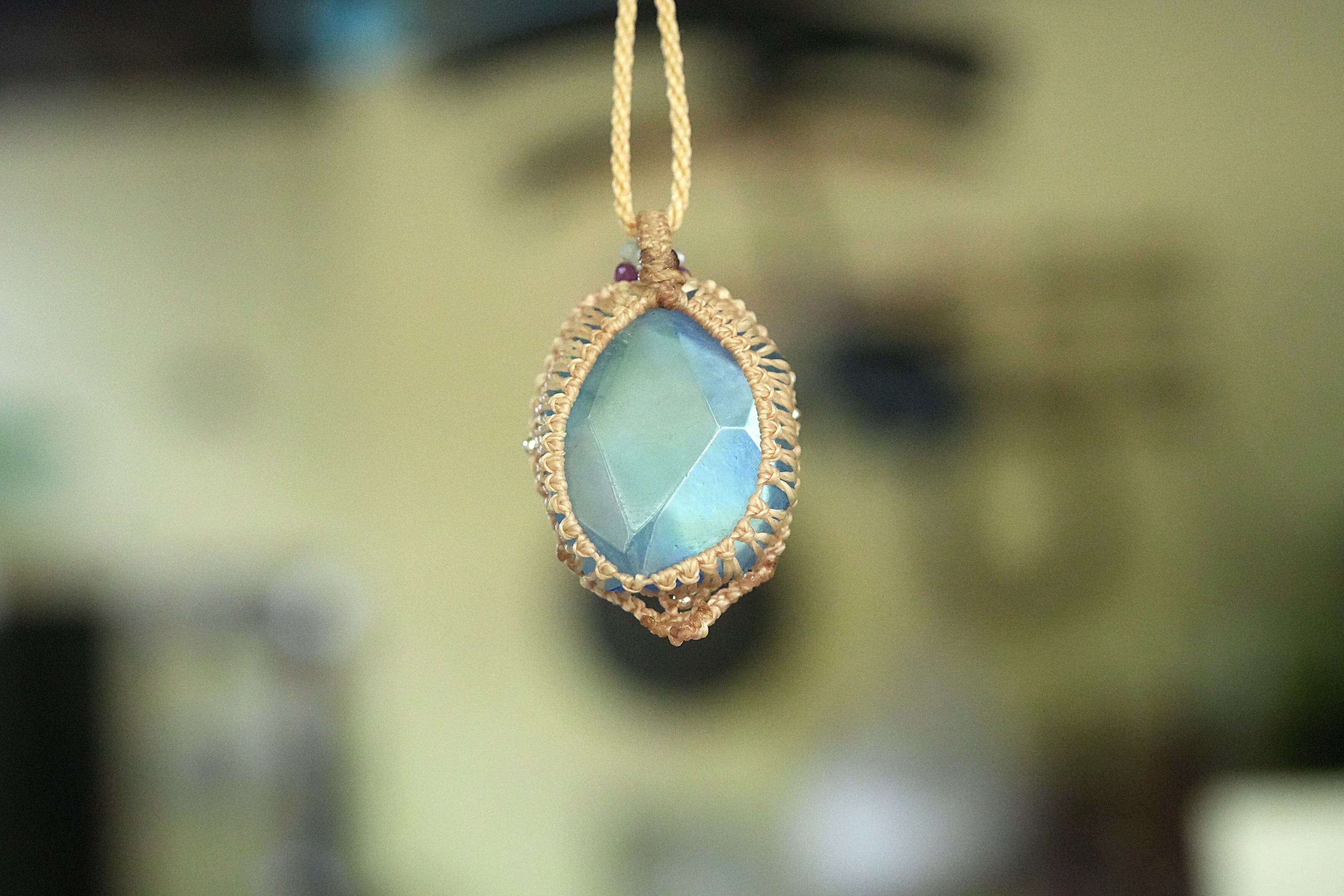◆このたびはキャラメル色の蝋引き糸を使用しマクラメ編み装飾を施しました。