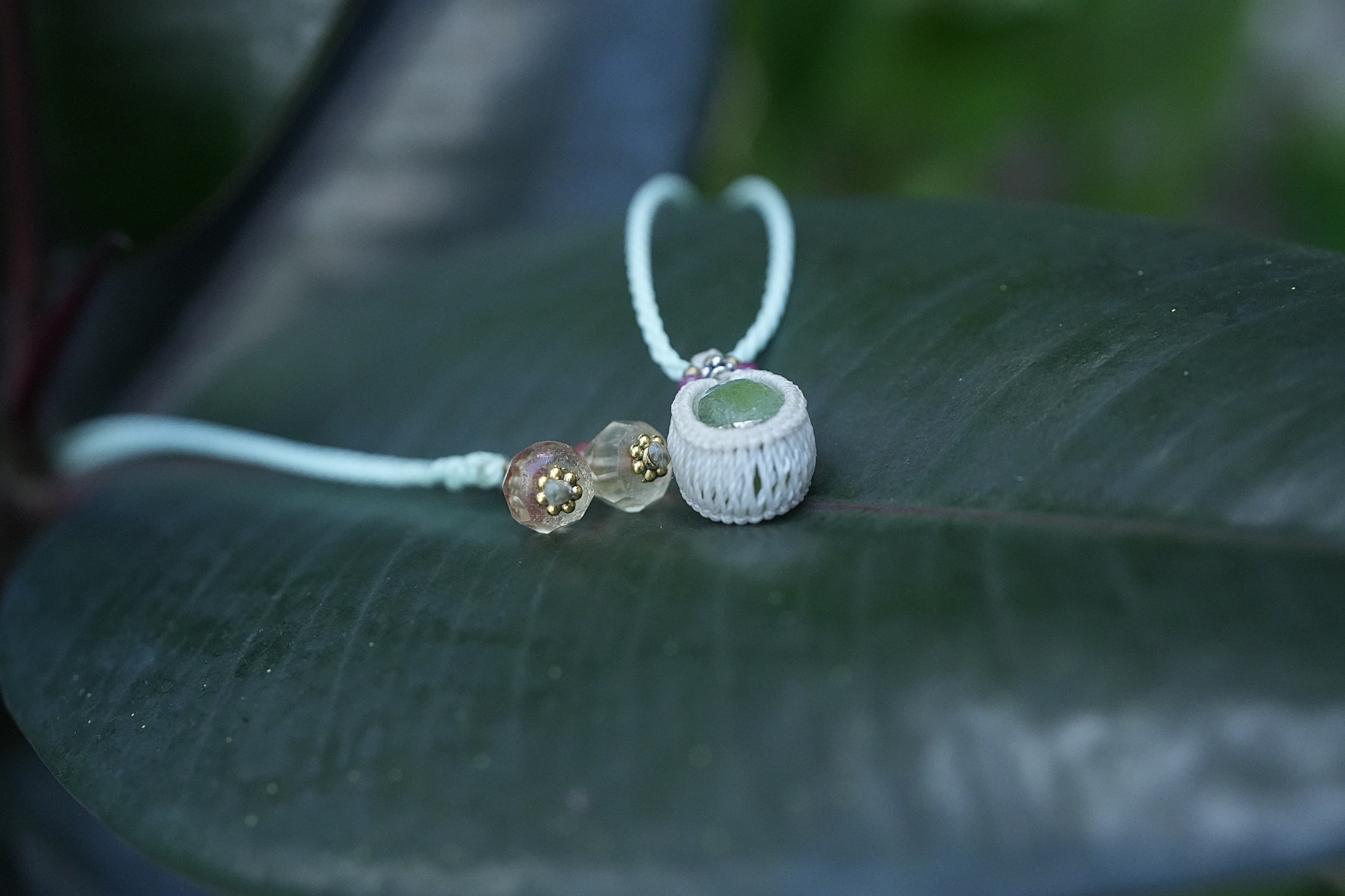 ◆このたびはナチュラルホワイト、カフェオレ、ミント色の蝋引き糸を使用しマクラメ編み装飾を施しました。