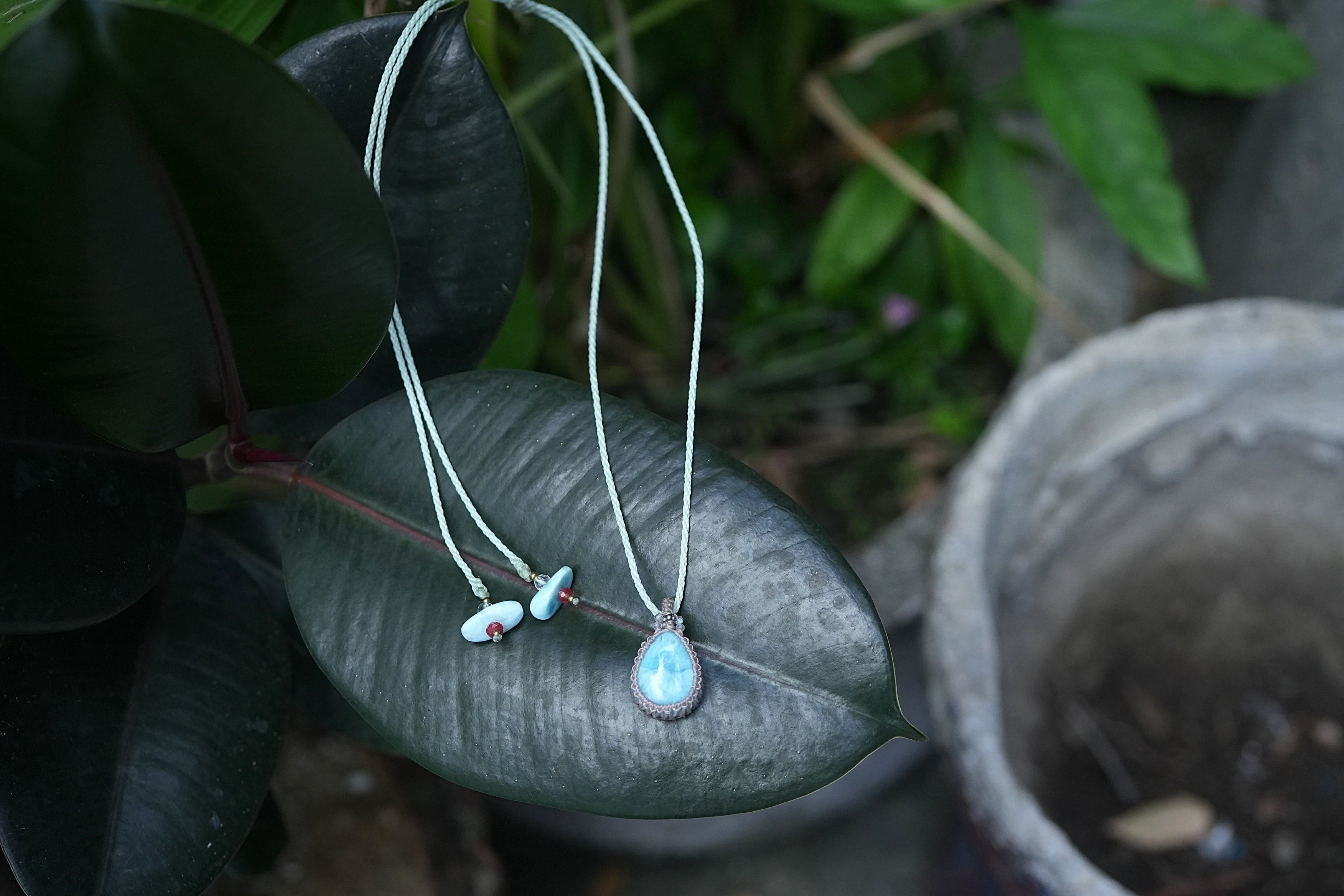 ◆このたびはキナリ、ミント色の蝋引き糸を使用しマクラメ編み装飾を施しました。