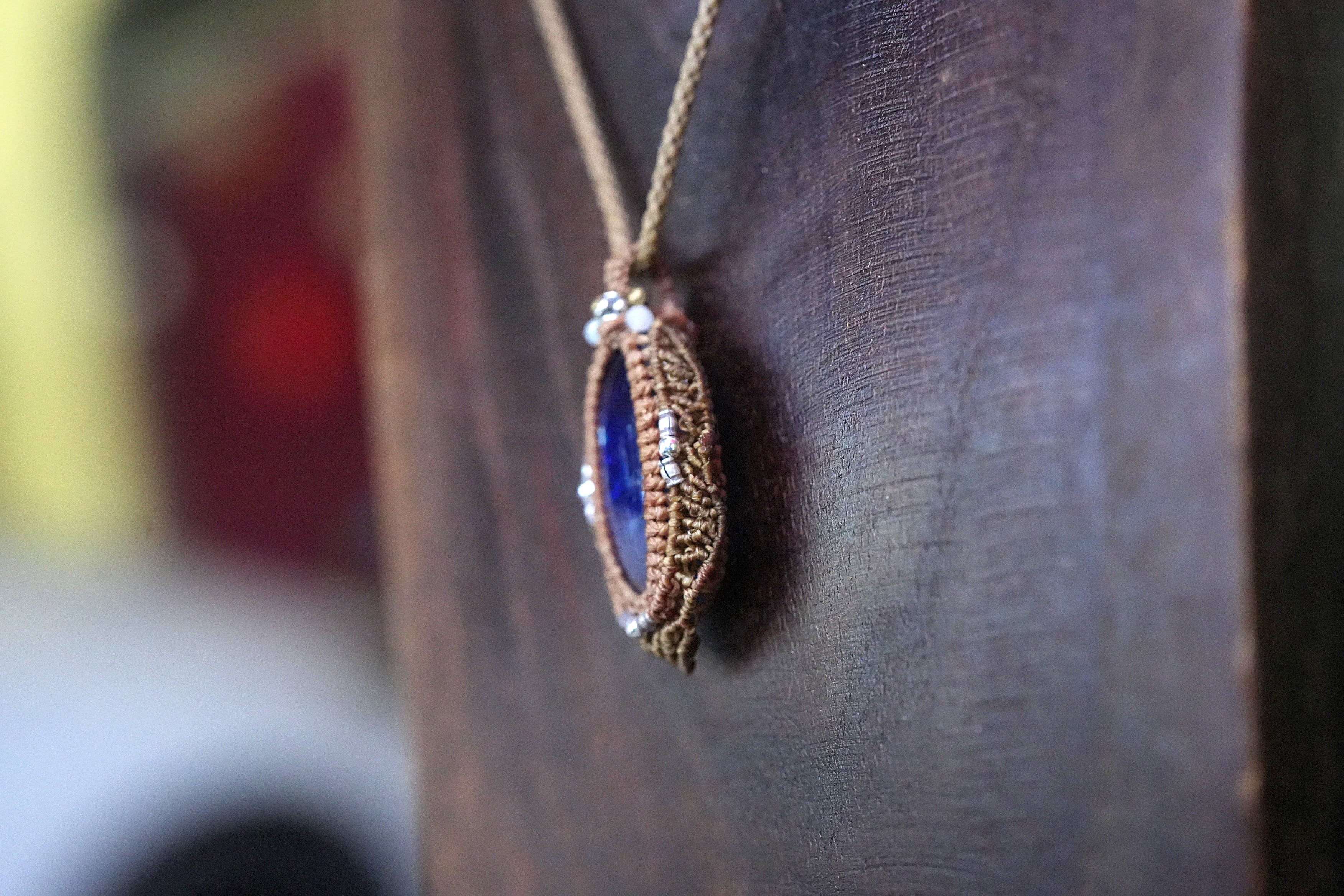 ◆このたびはゴールドブラウン色の蝋引き糸を使用しマクラメ編み装飾を施しました。