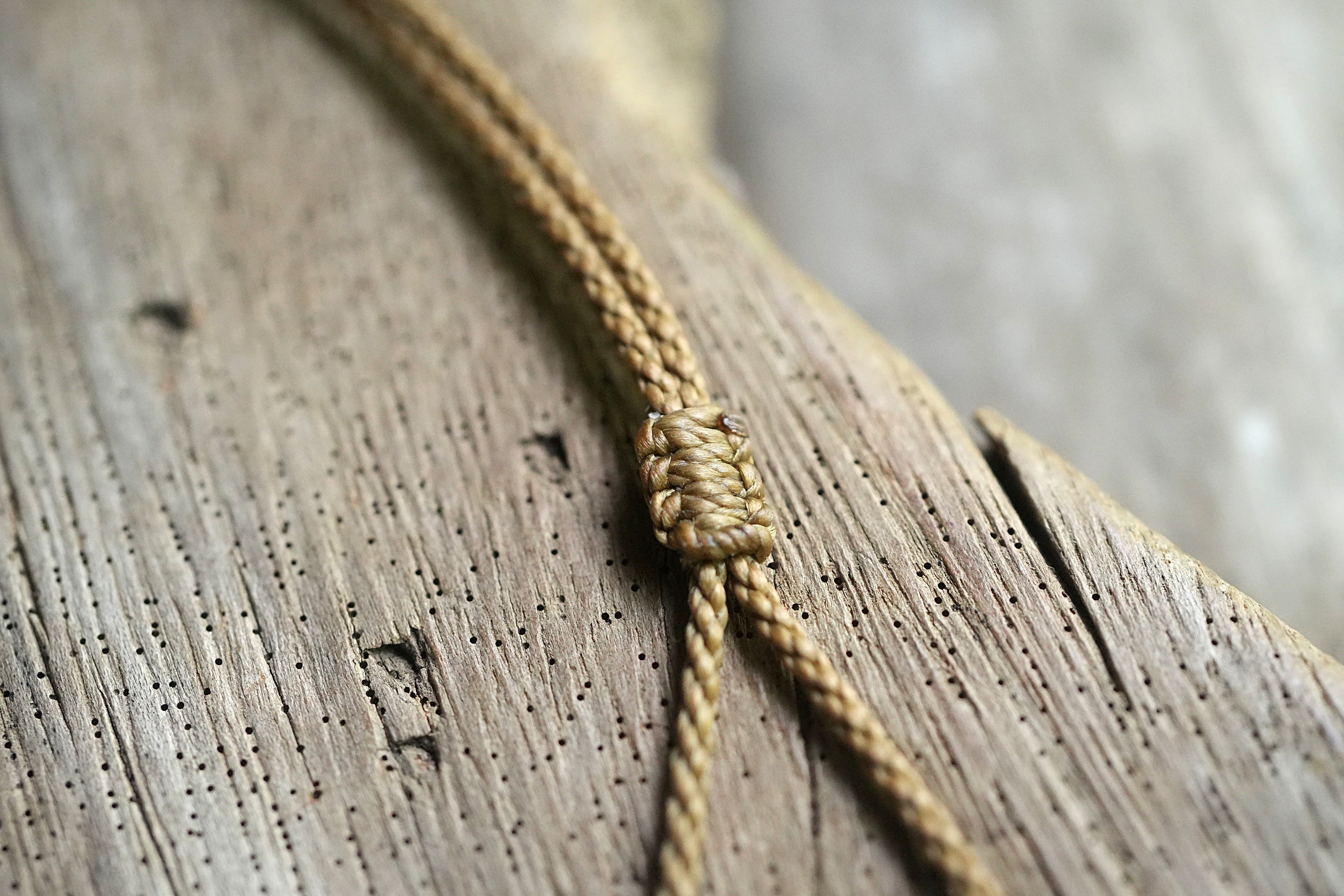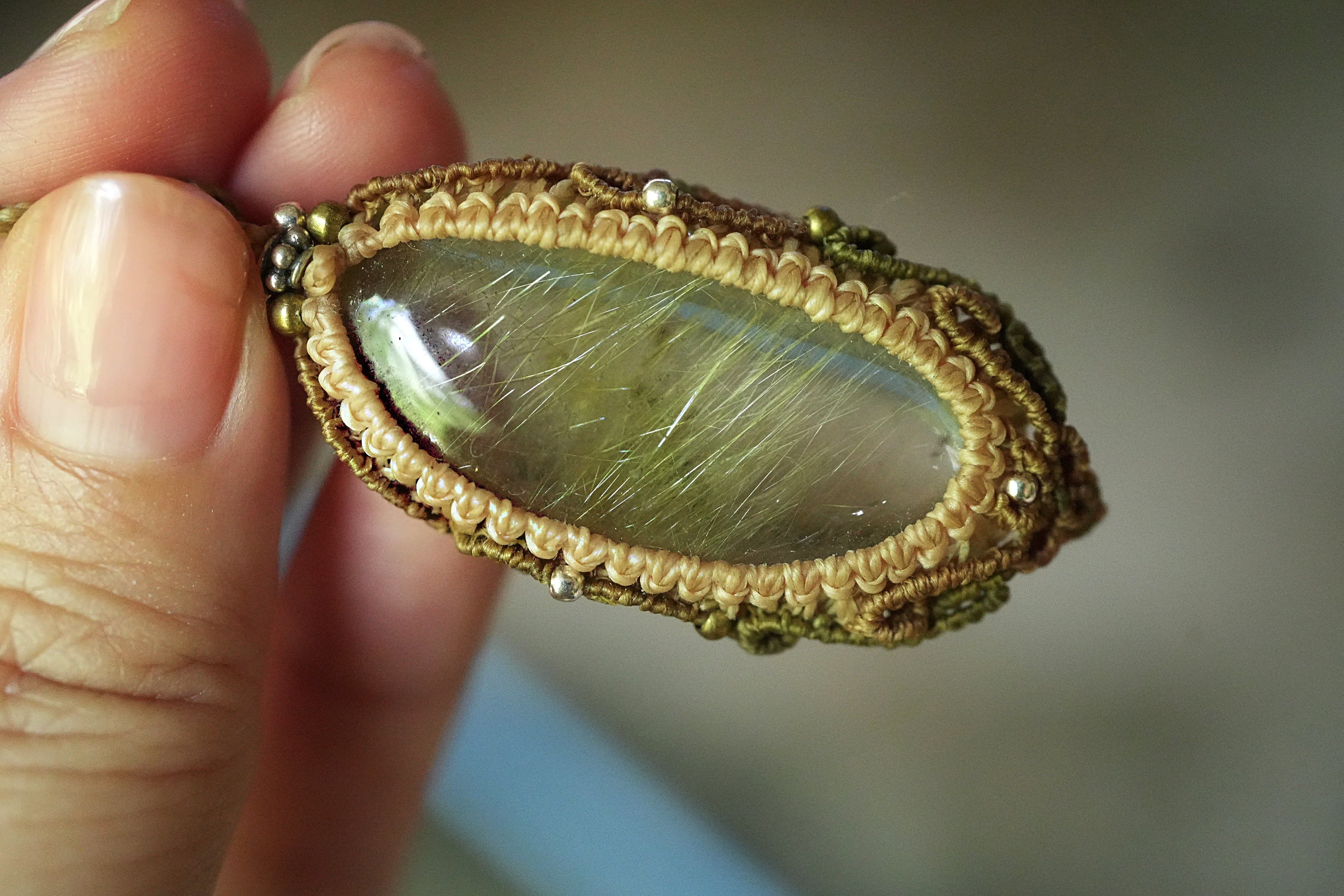 ◆このたびはキャラメル、ゴールドブラウン、オリーブ色の蝋引き糸を使用しマクラメ編み装飾を施しました。