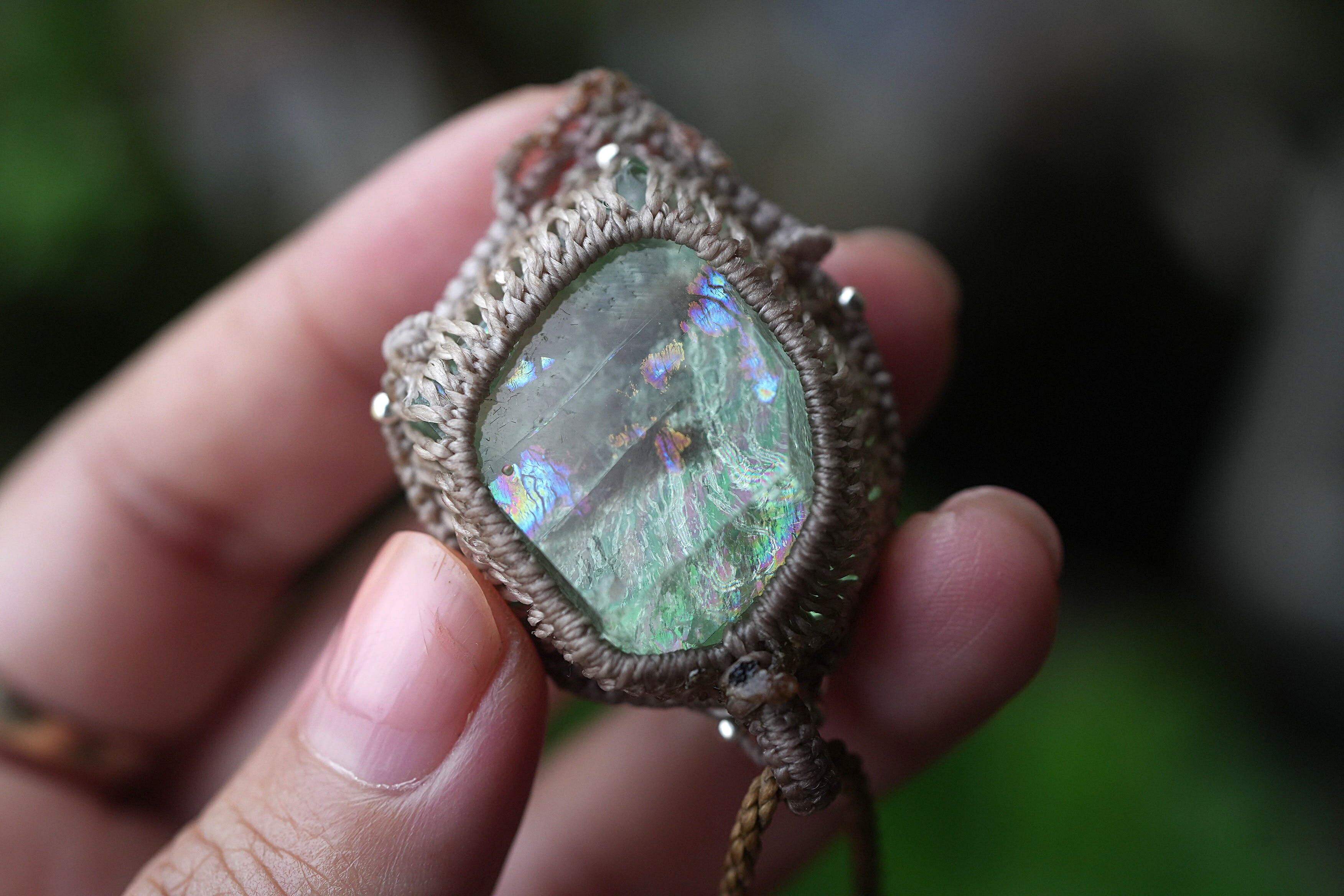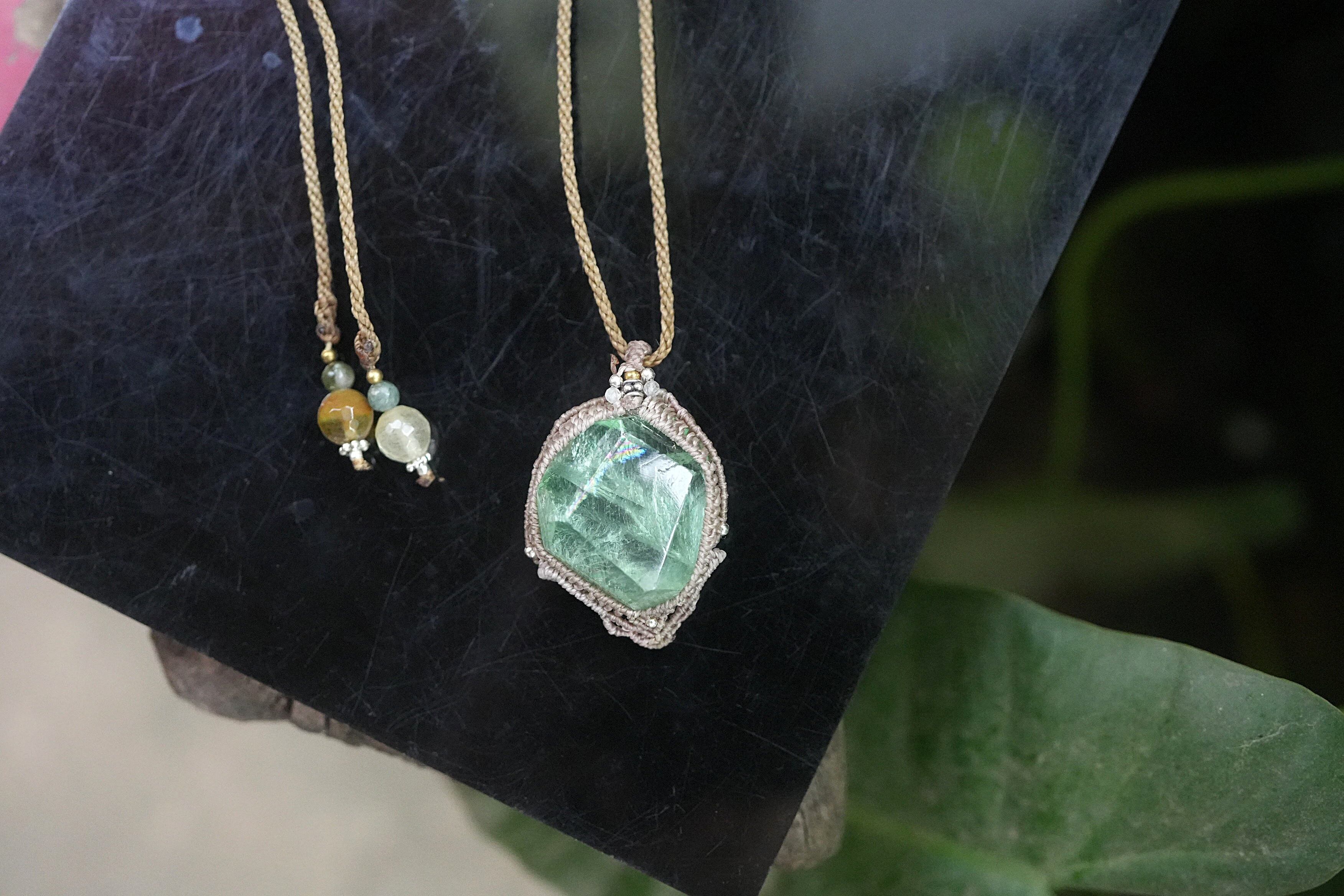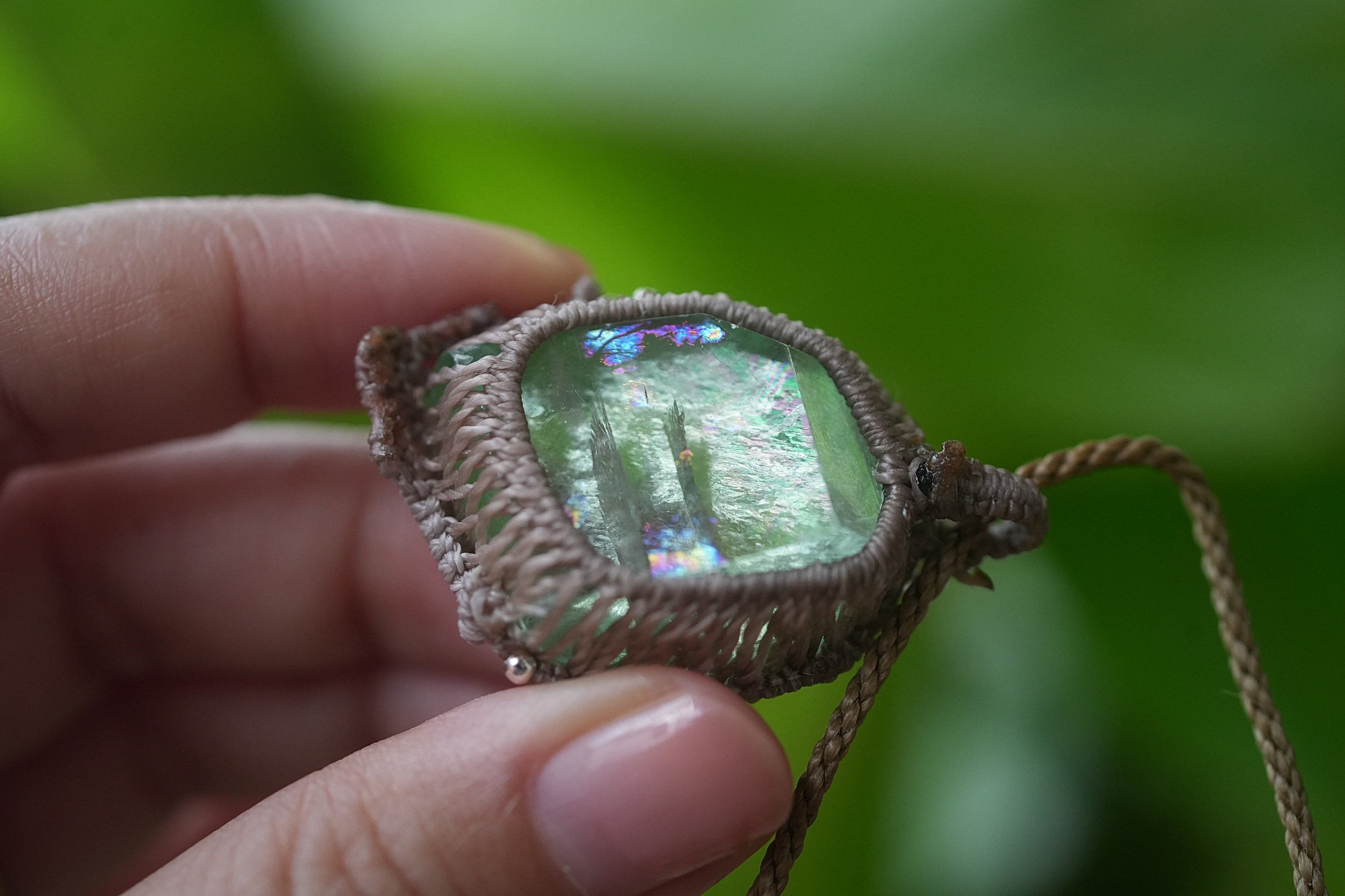 エメラルドグリーン虹原石★フローライト マクラメネックレス2029