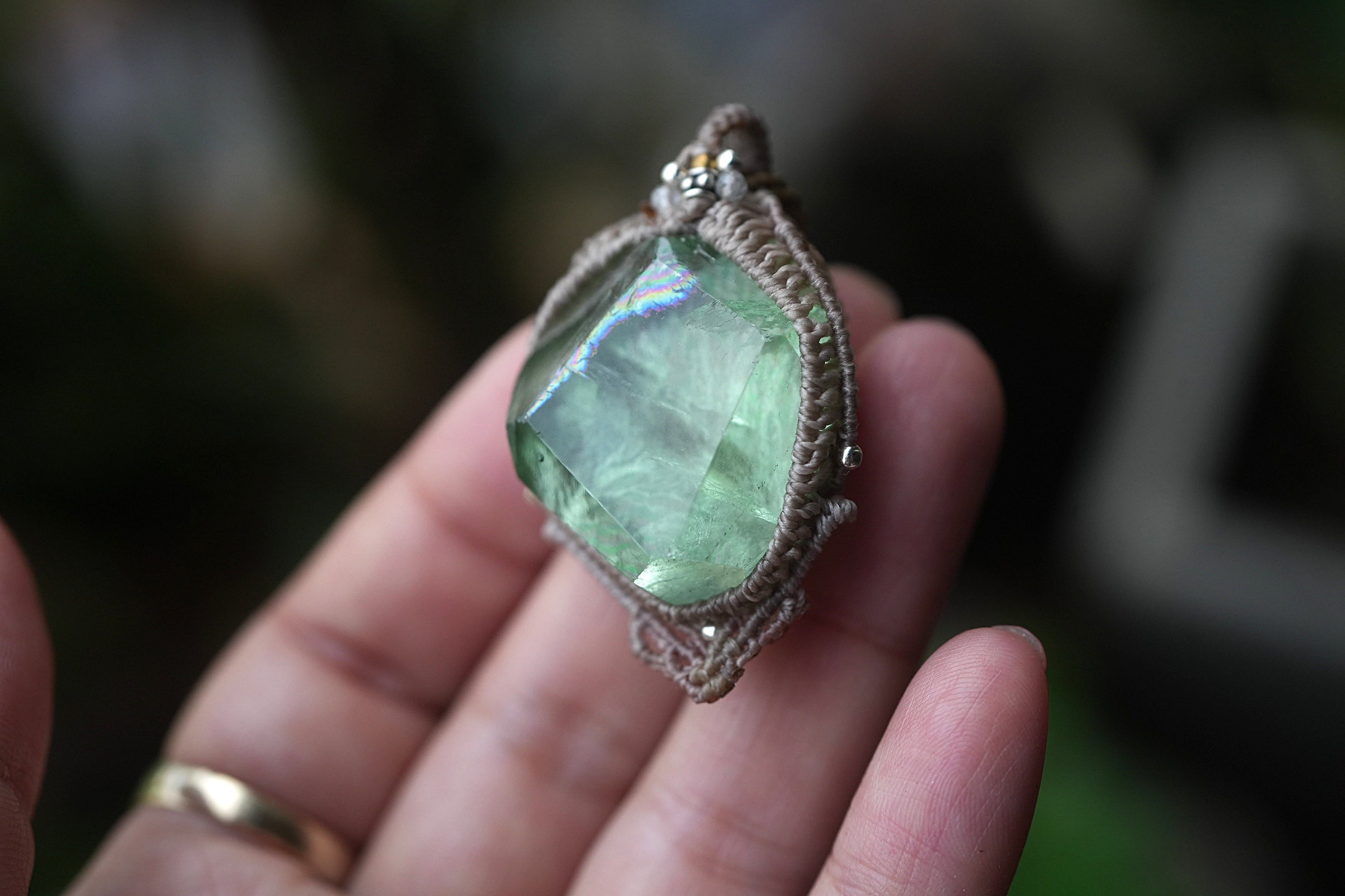 このたびは石の周りを細い糸で細かくマクラメ編み装飾