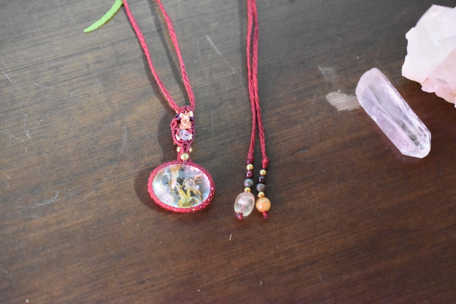 ◆このたびはレッド、差し色としてピスタチオ、キナリカラーの3色の蝋引き糸を使用しマクラメ編み装飾を施しました。