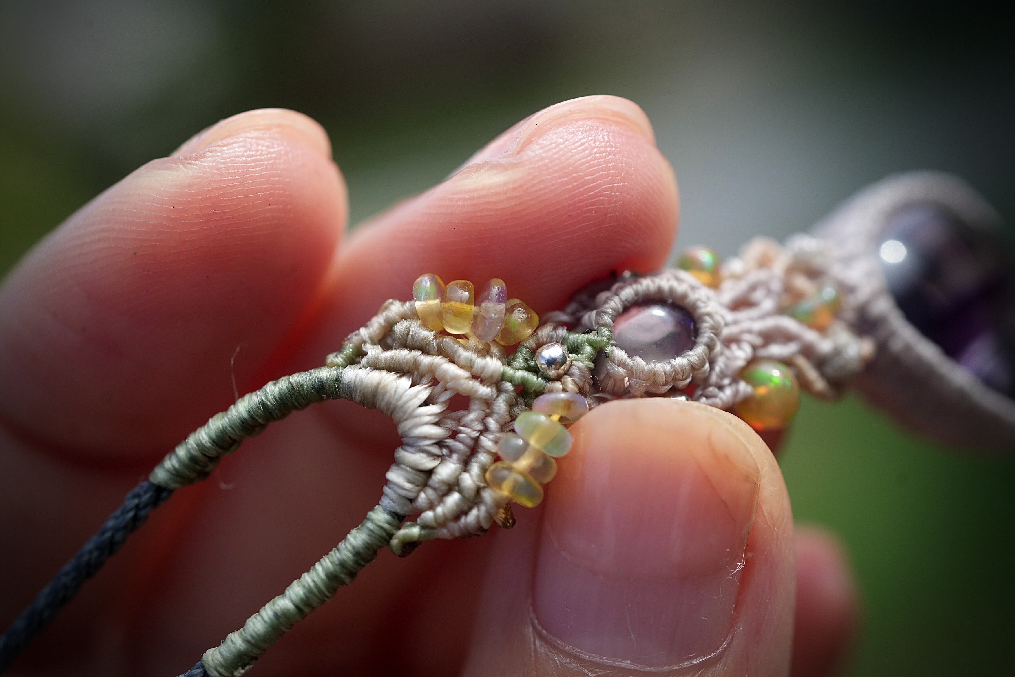 ◆このたびはナチュラルホワイト、シルバー、ヘンプ、ピーコックグリーン、キャラメル色の蝋引き糸を使用しマクラメ編み装飾を施しました。