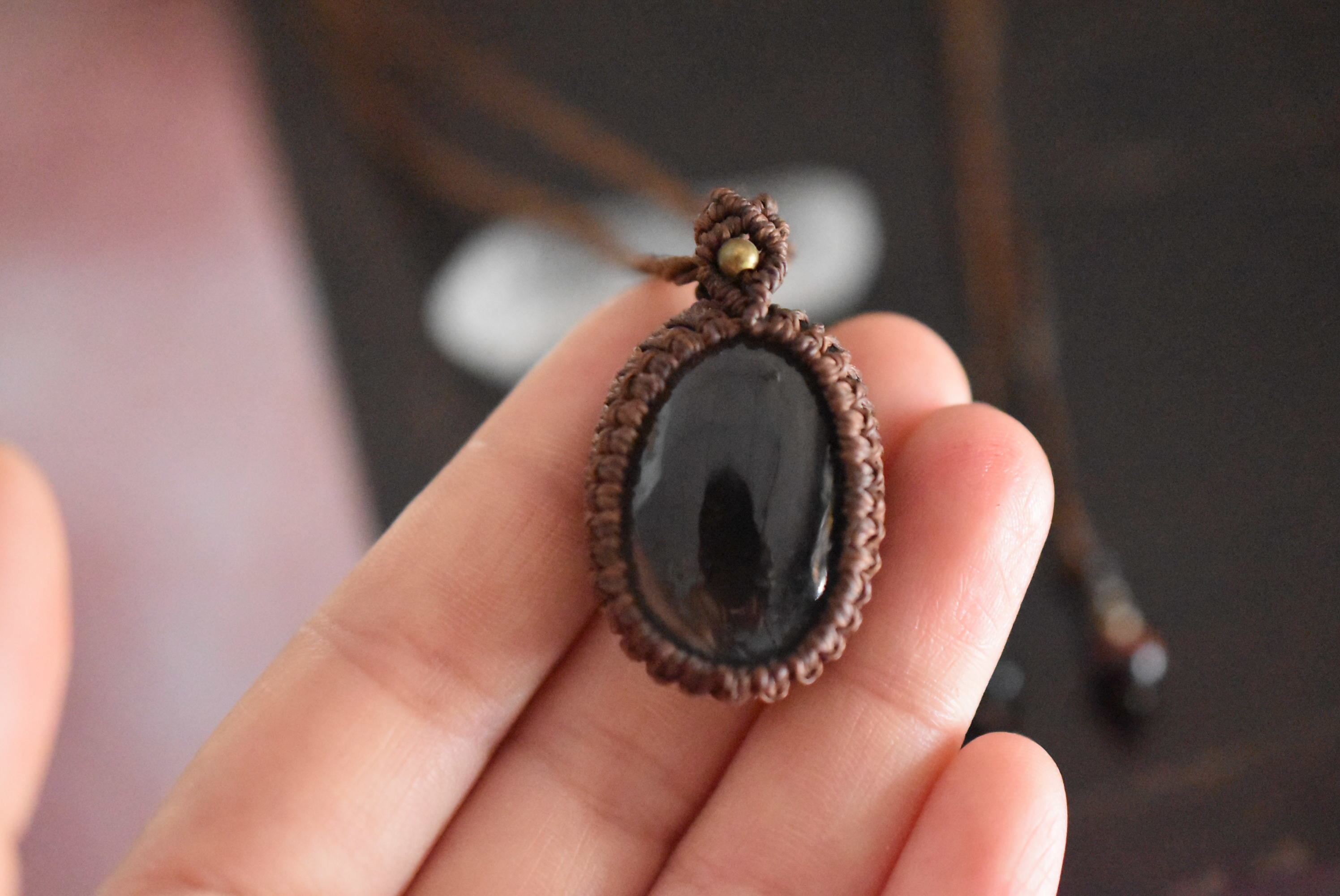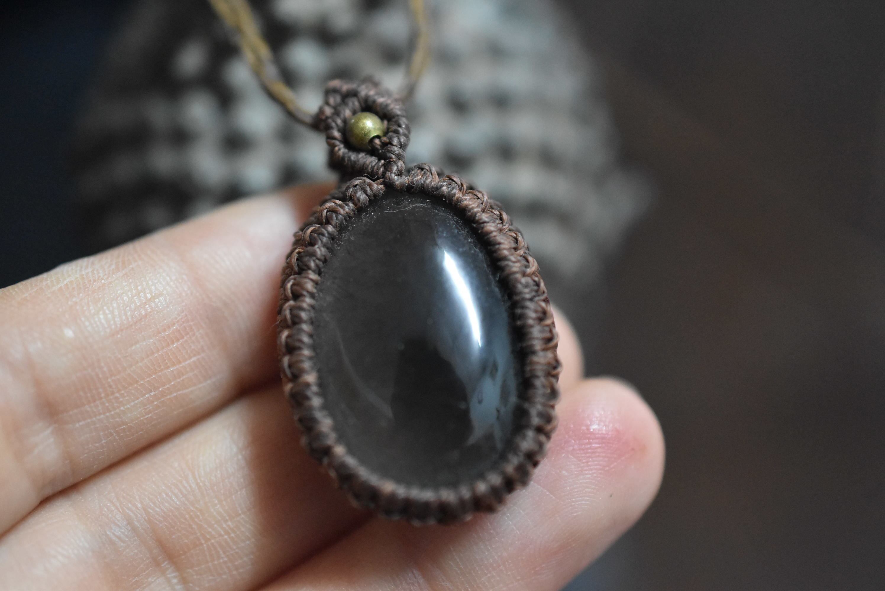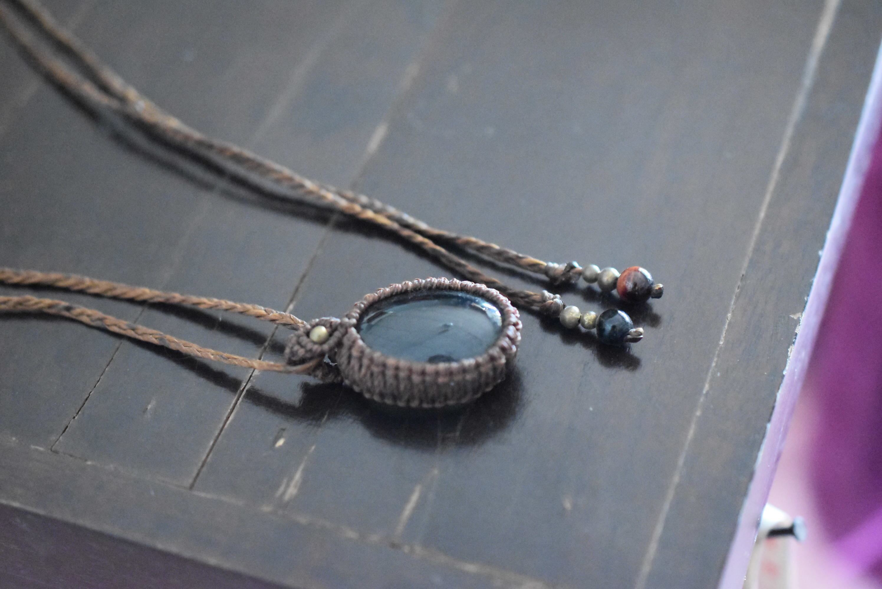 ◆このたびはコーヒーブラウンの蝋引き糸を使用しマクラメ編み装飾を施しました。