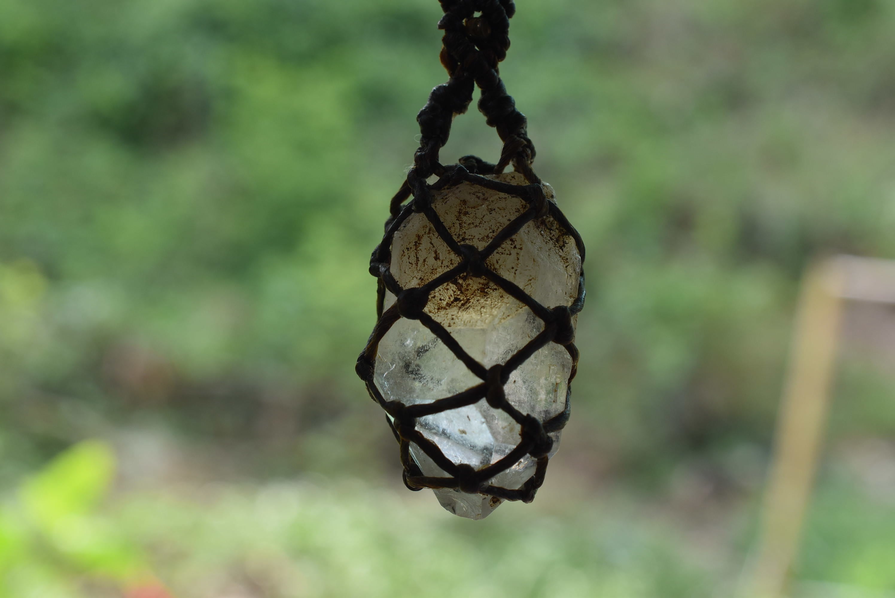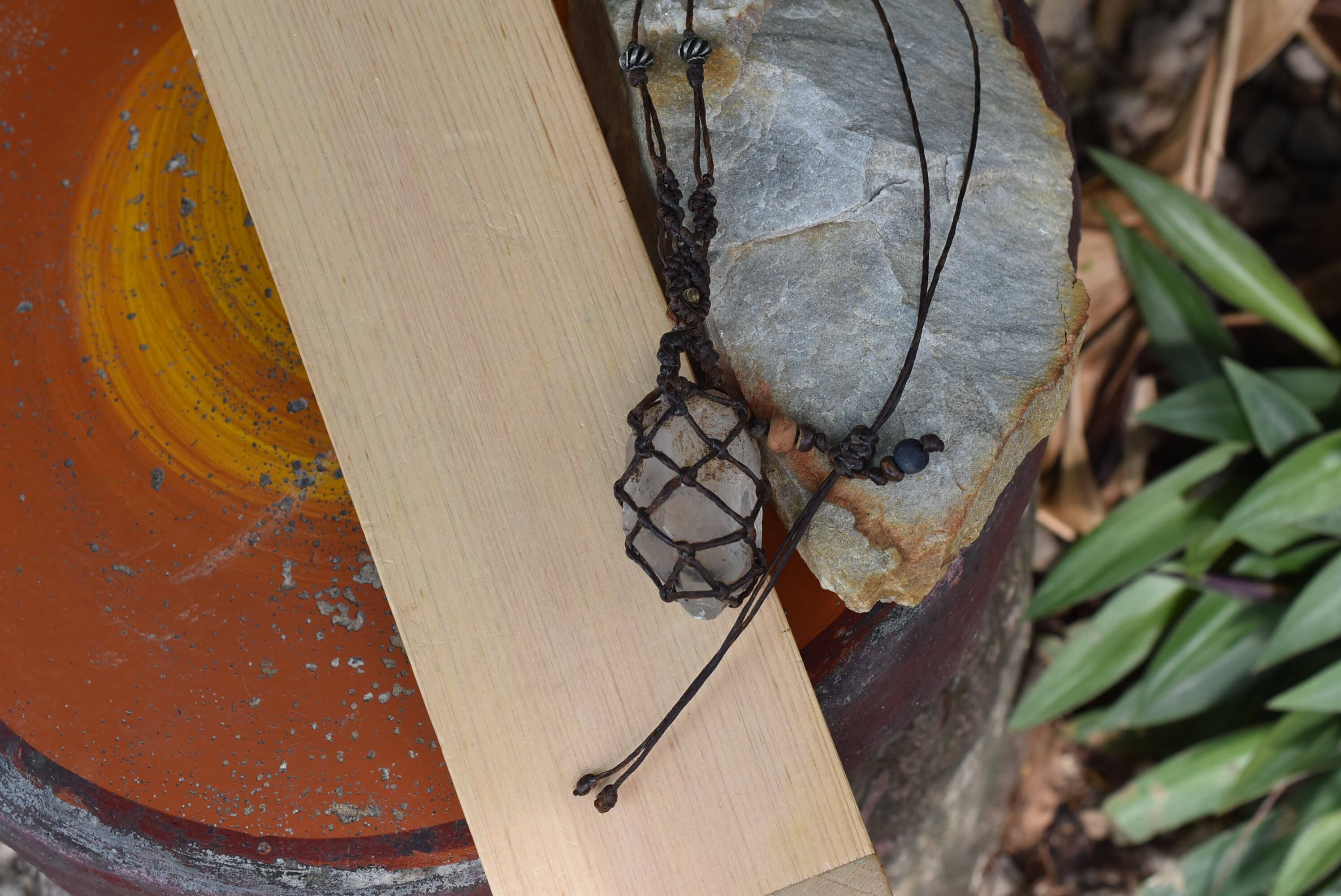 ◆このたびはコーヒーブラウンの蝋引き糸を使用しマクラメ編み装飾を施しました。