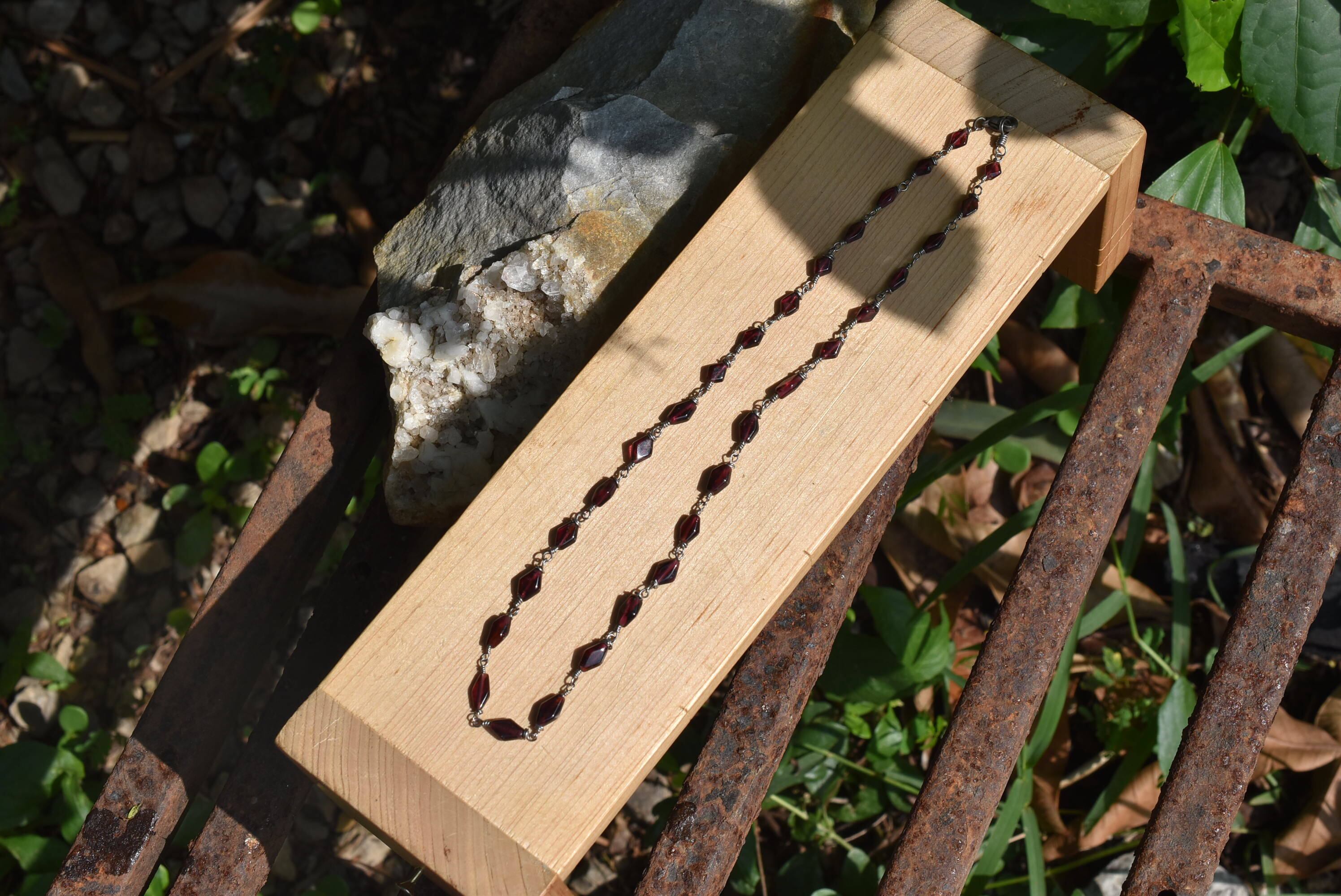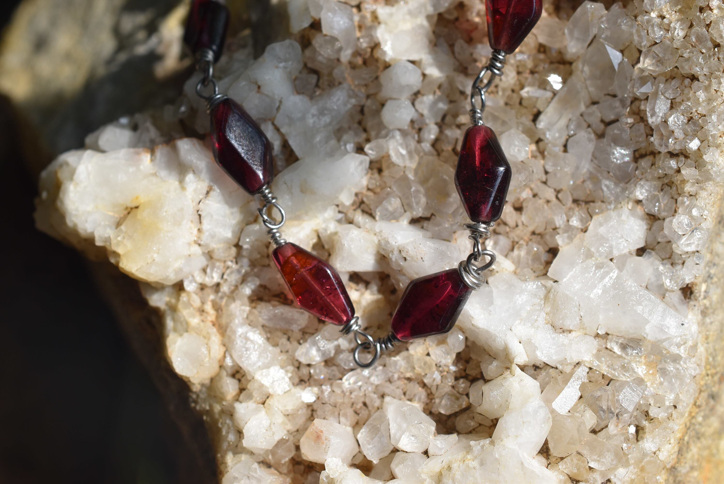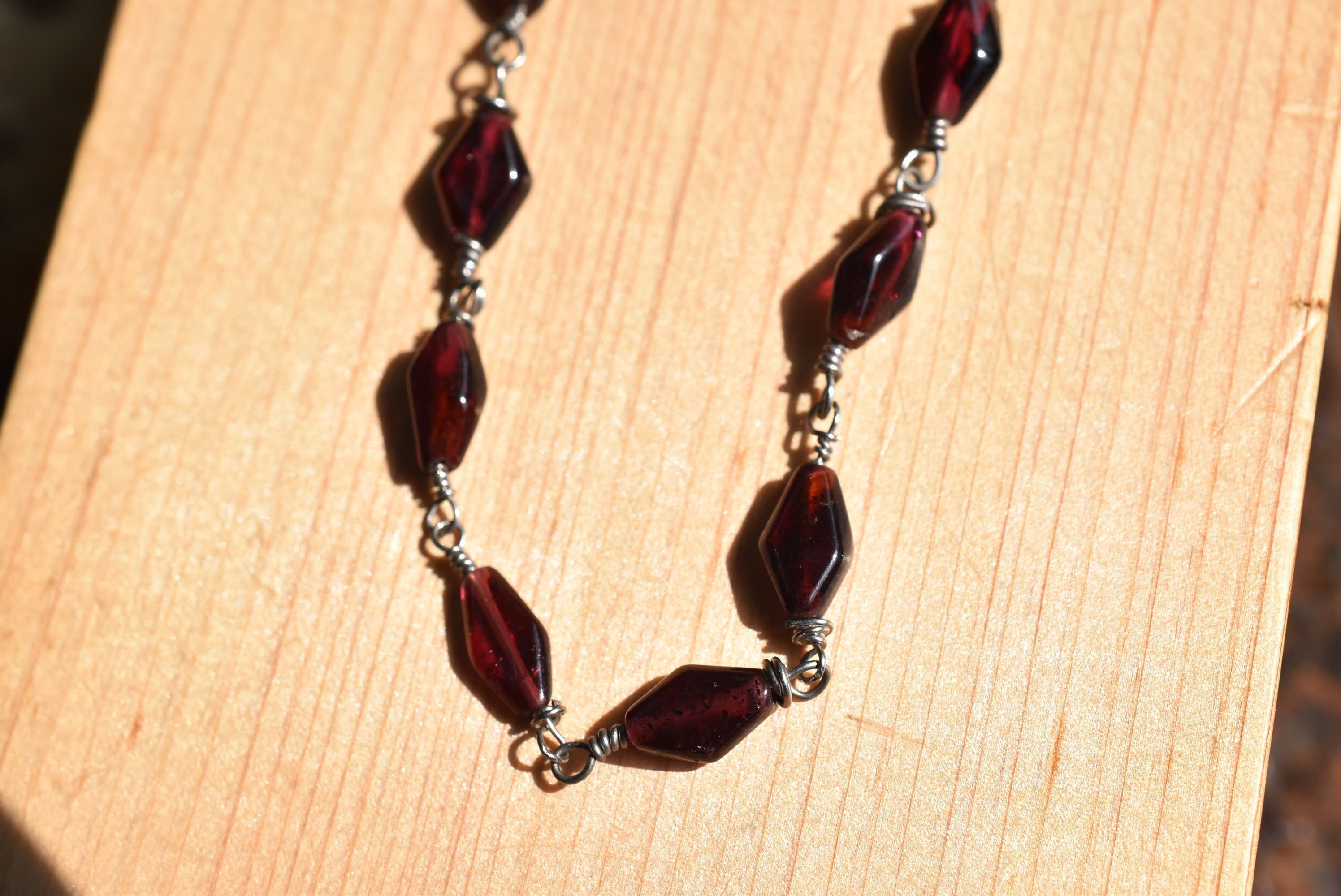 美しいガーネットビーズをひとつひとつワイヤーで結び、