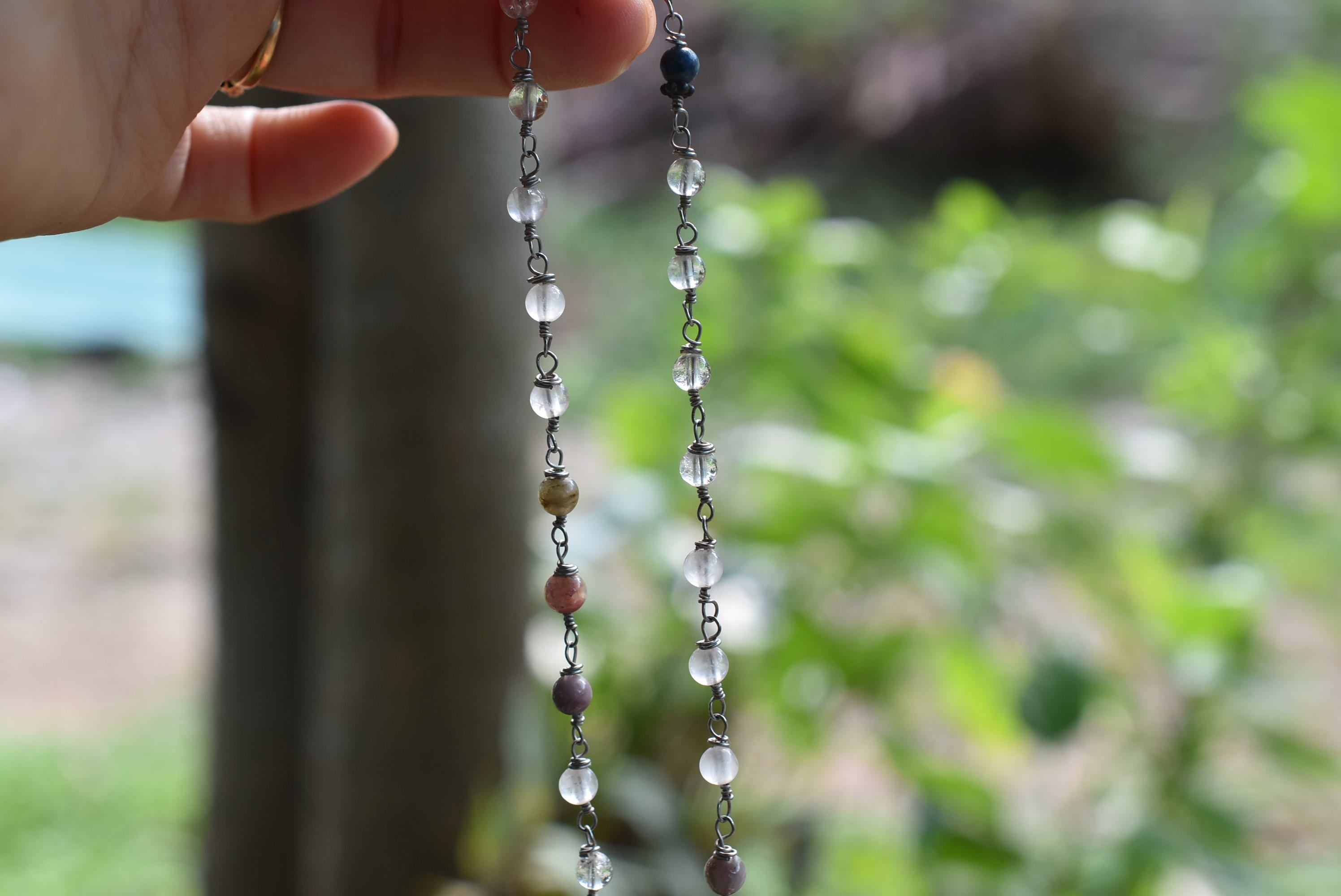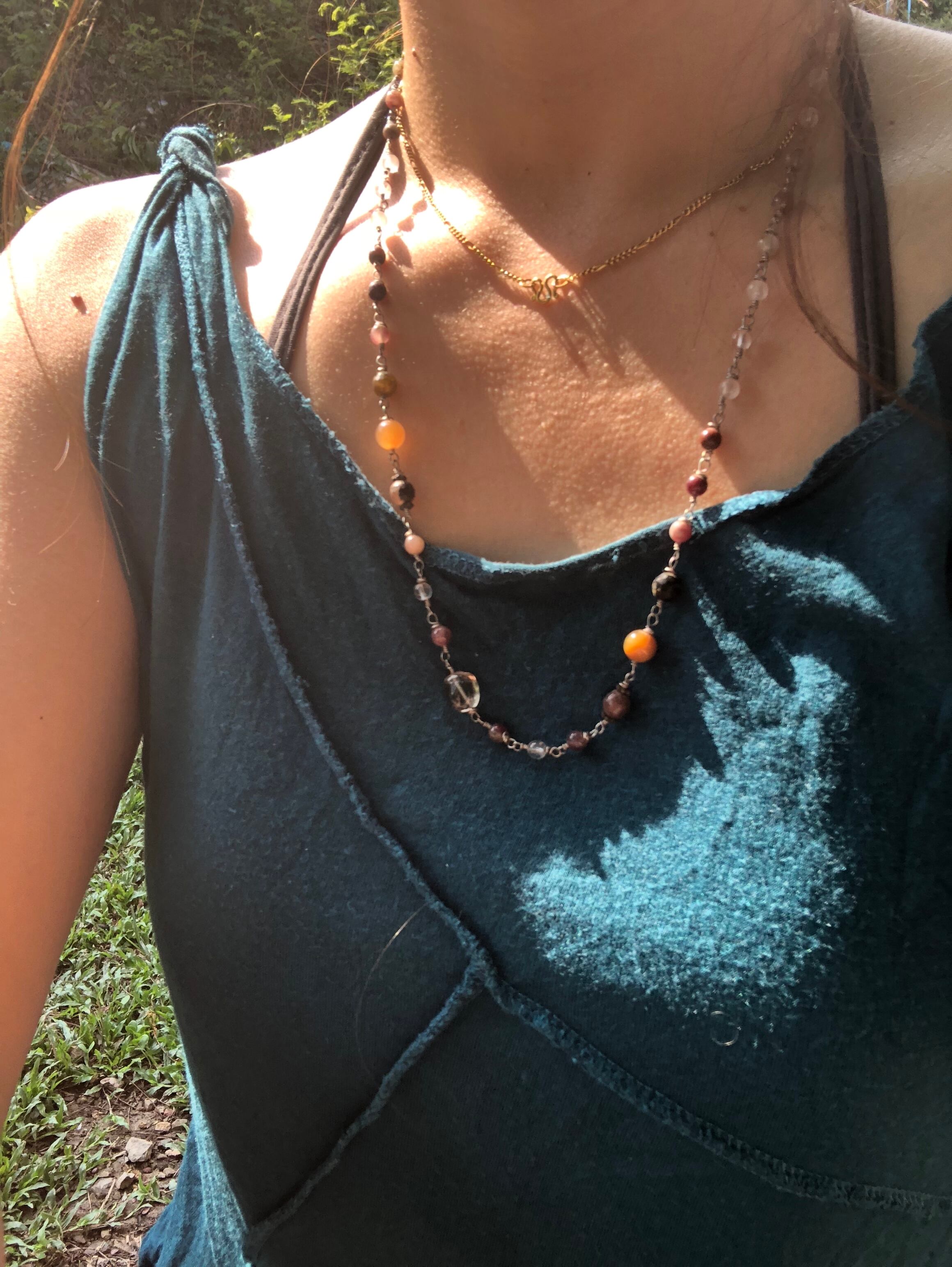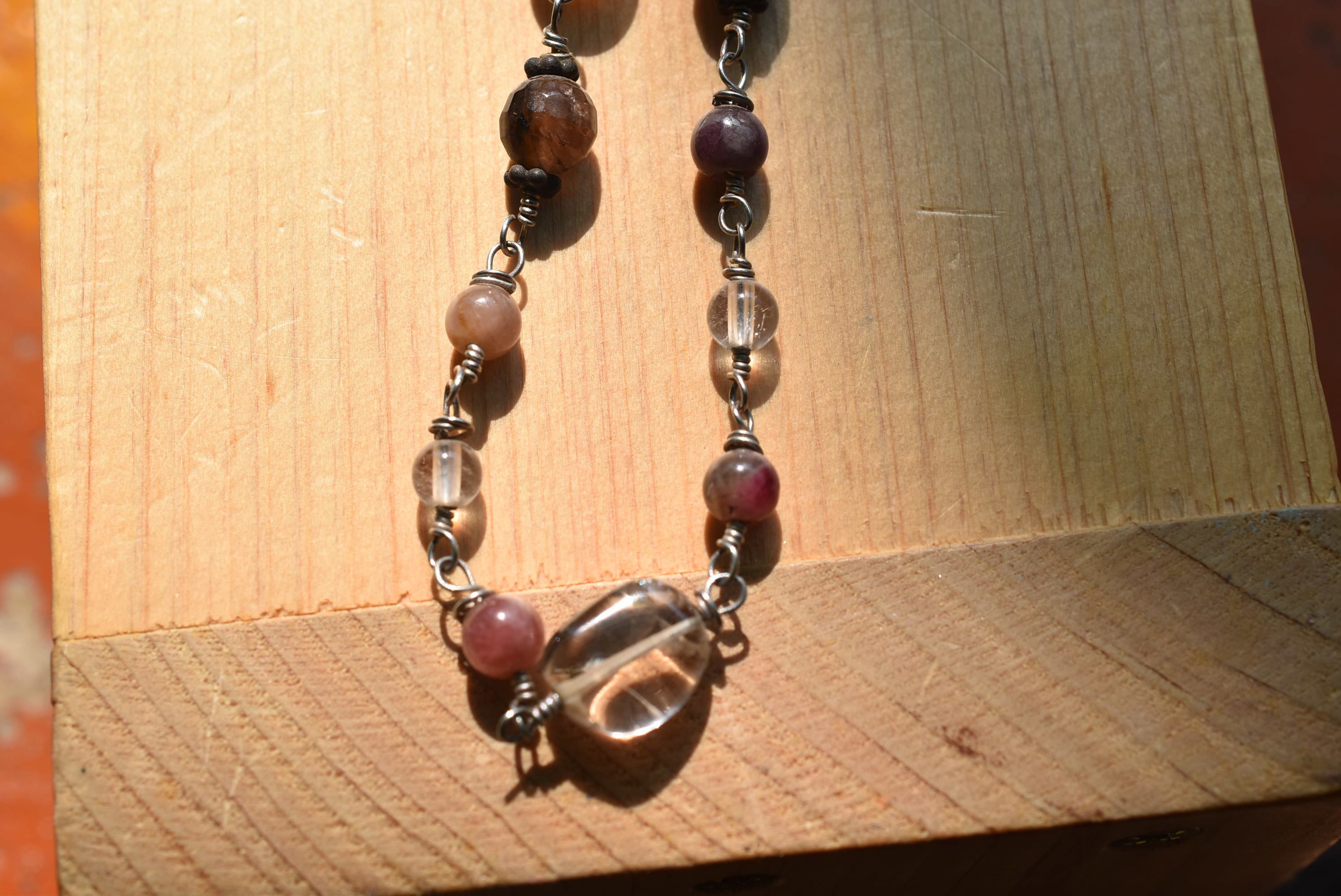 クリアな水晶ビーズ、トルマリン、イエロージェイド、ローズクォーツ、ラピスラズリ..それらをワイヤーでひと粒ずつしっかりと結び、アンティーク調のネックレスに仕上げました