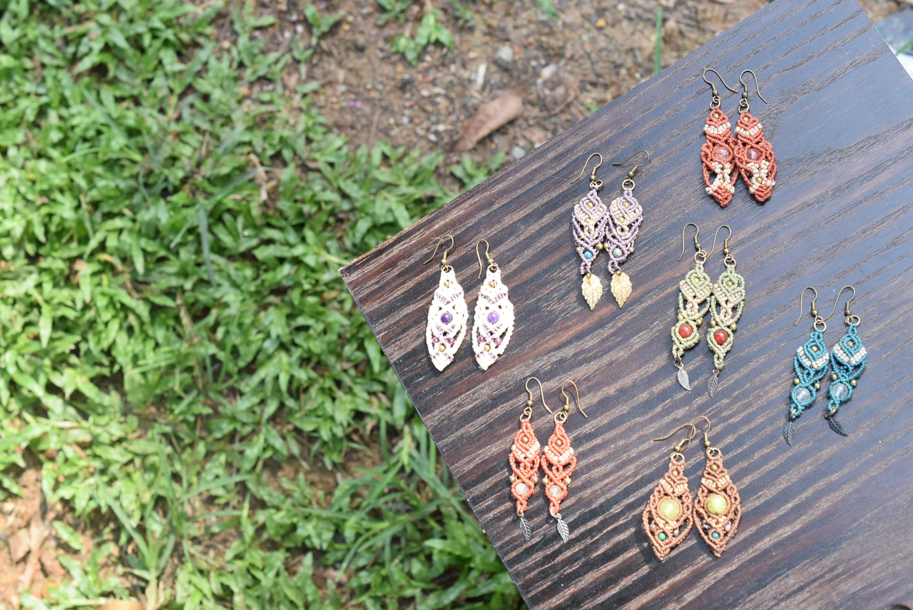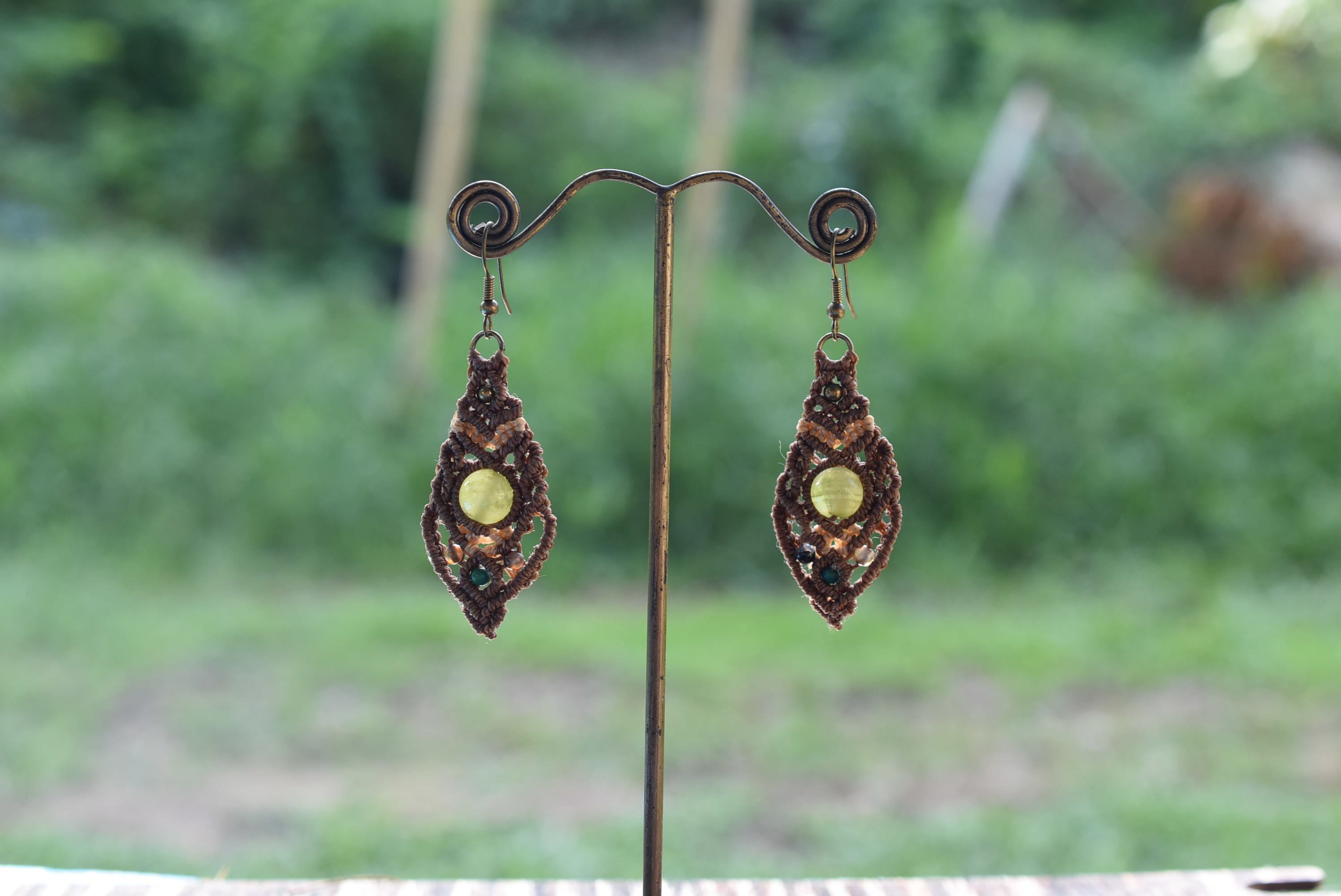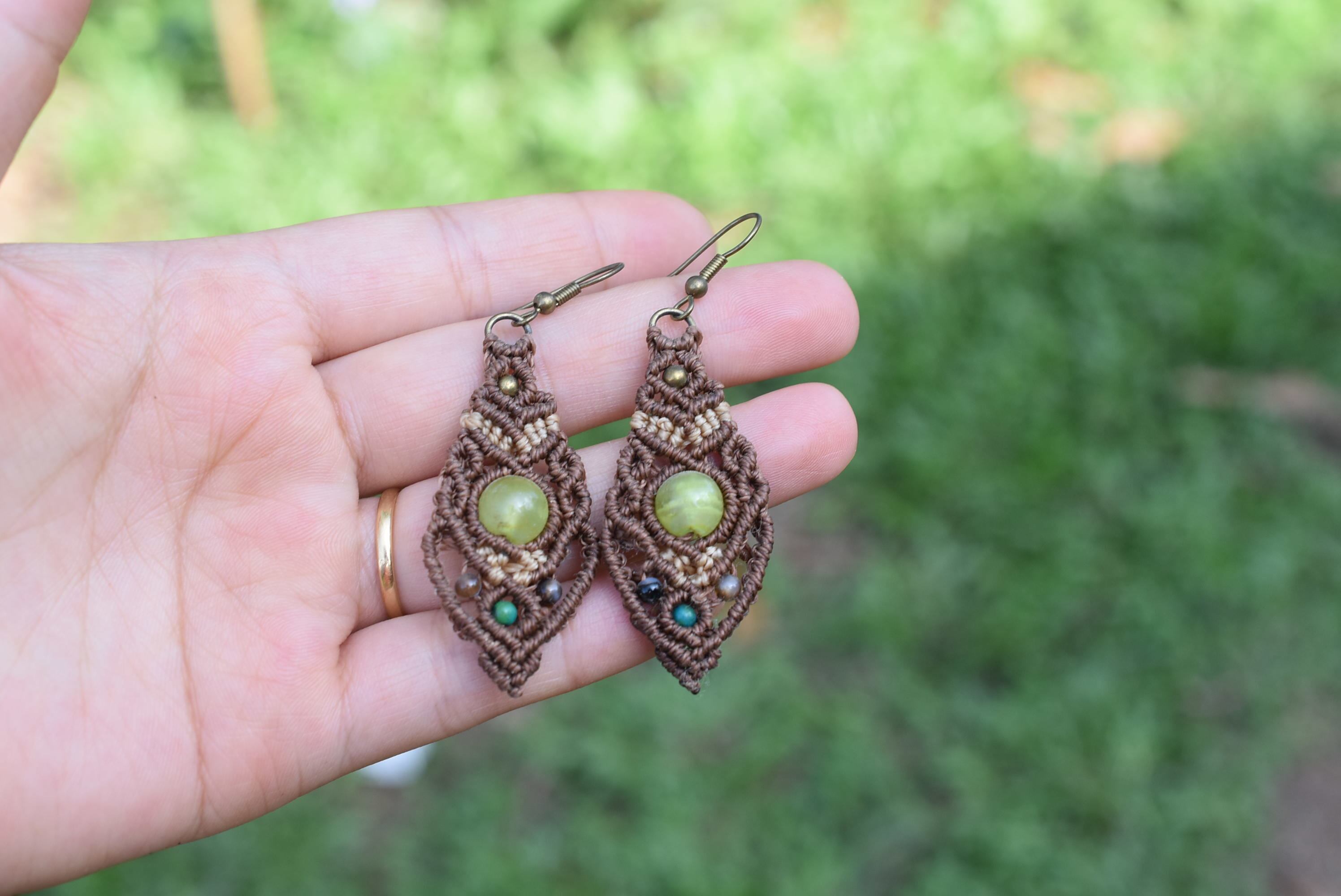 天然石アラゴナイトビーズと小さな天然石ビーズを組み合わせてマクラメ編み装飾を施し、ピアスを制作しました。