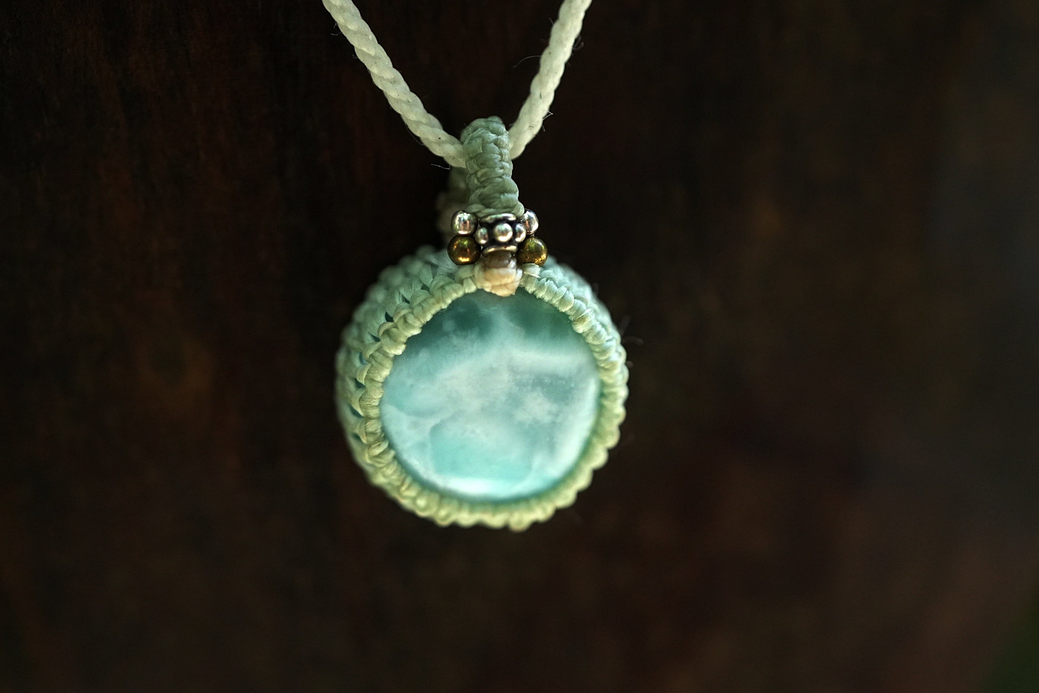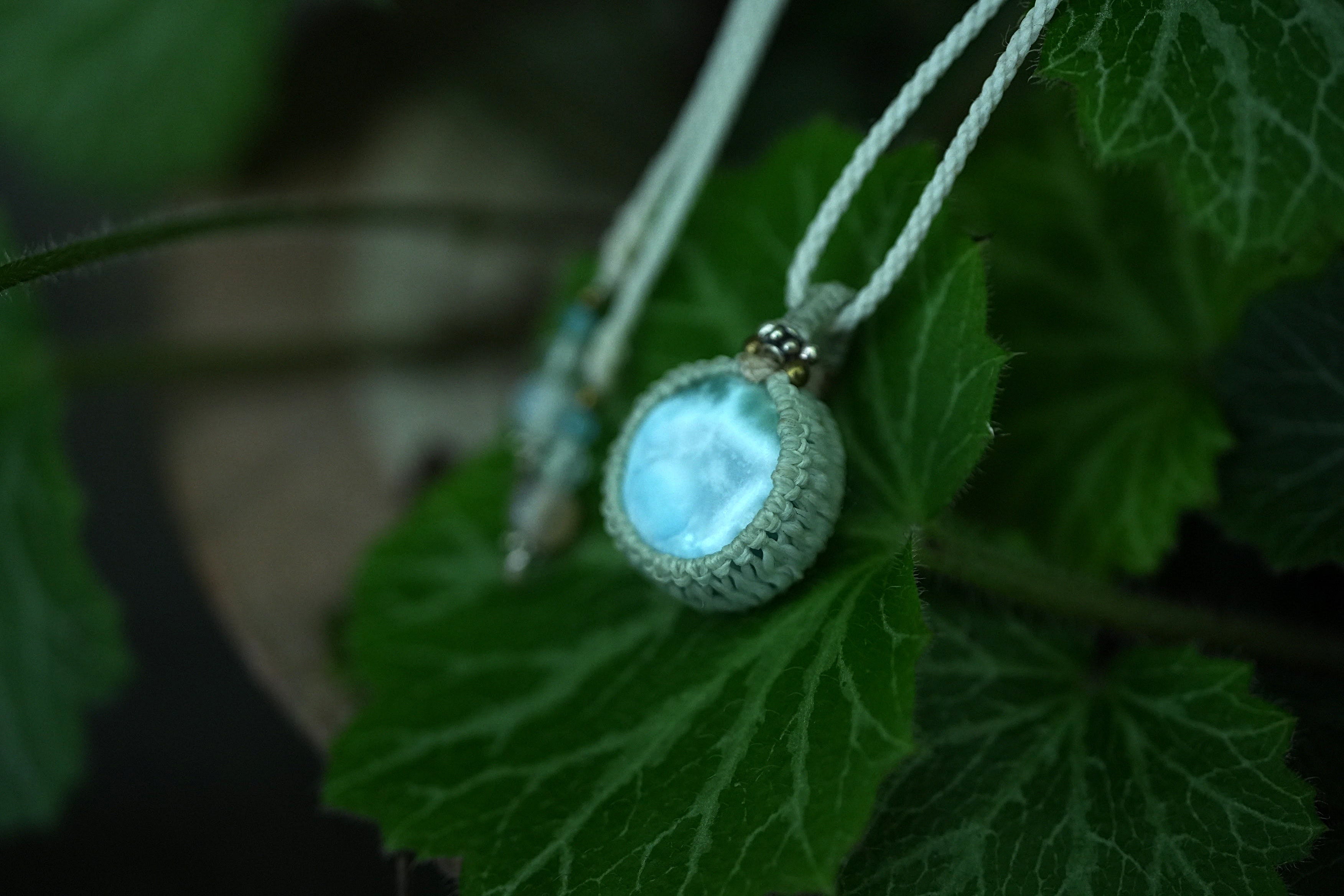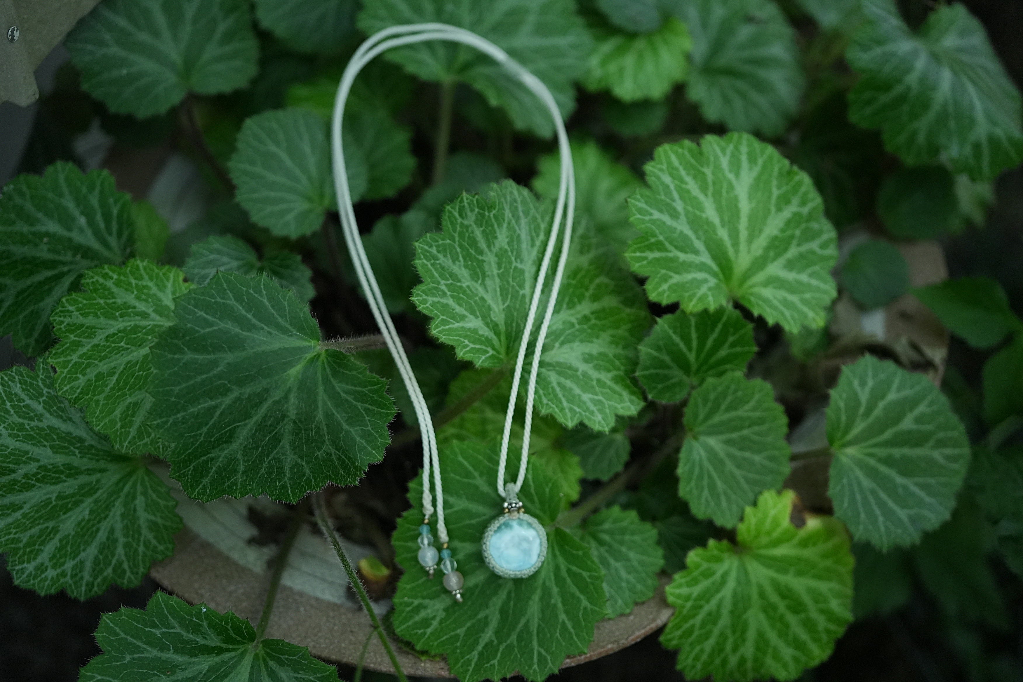 ◆このたびはミント、ホワイト色の蝋引き糸を使用しマクラメ編み装飾を施しました。