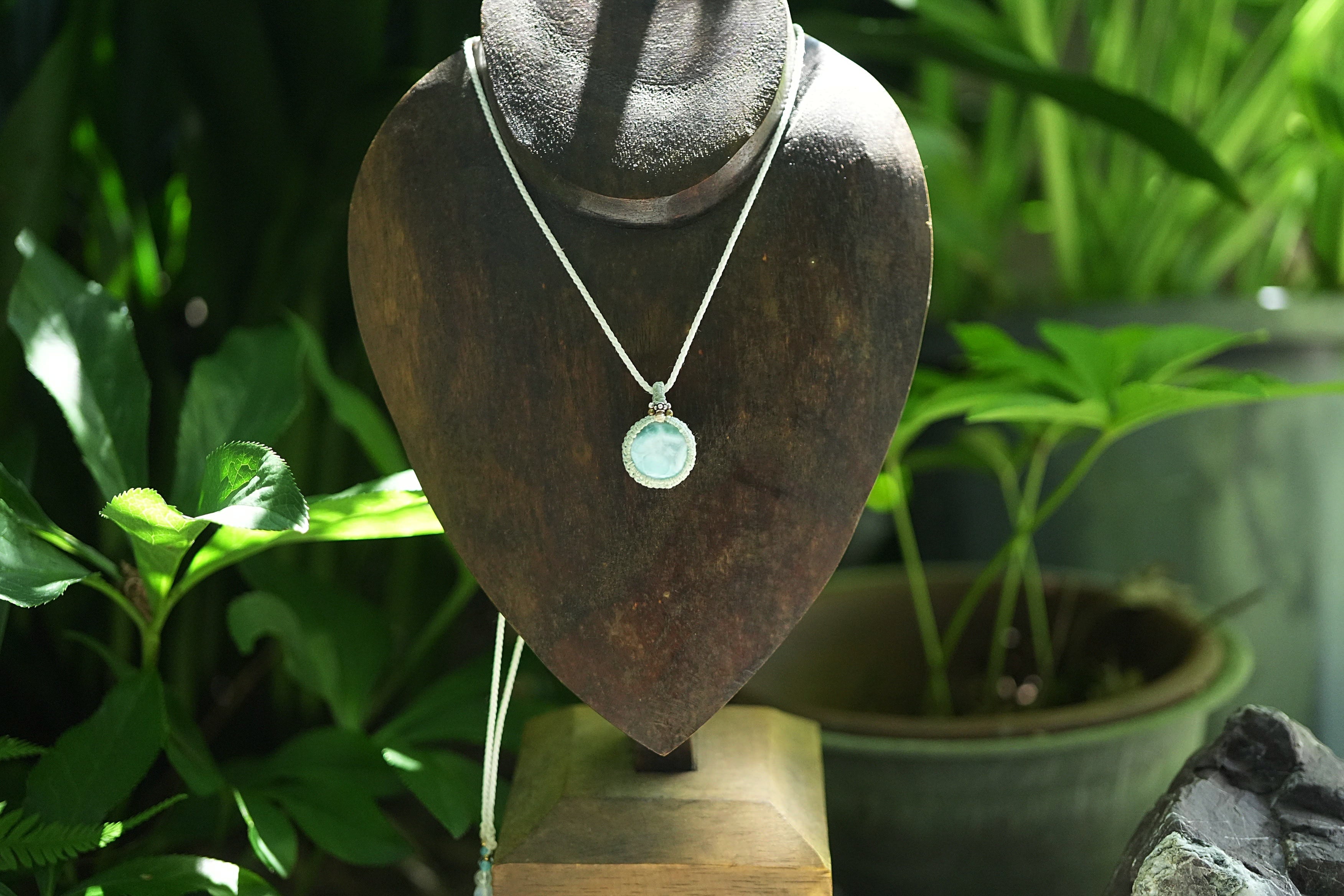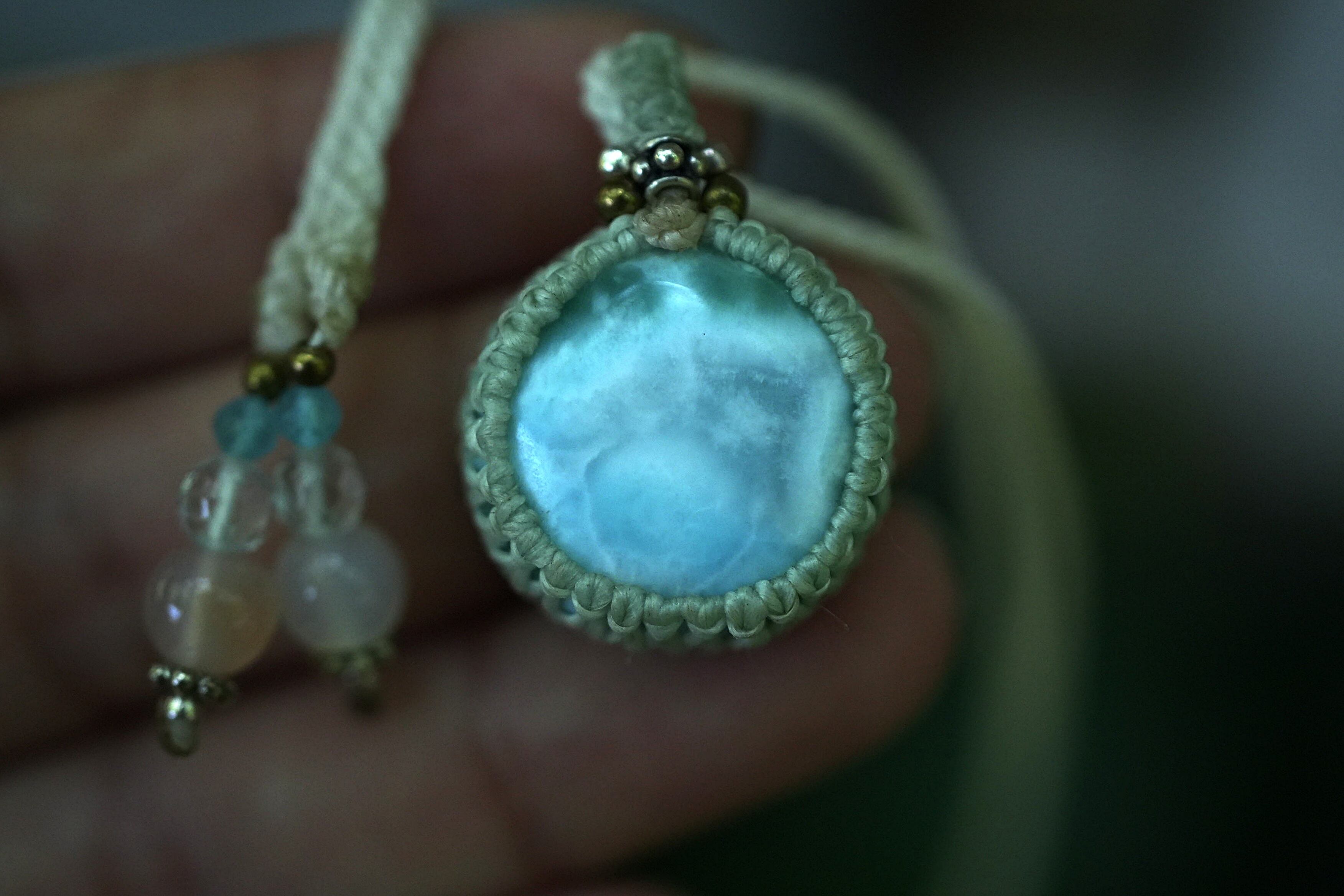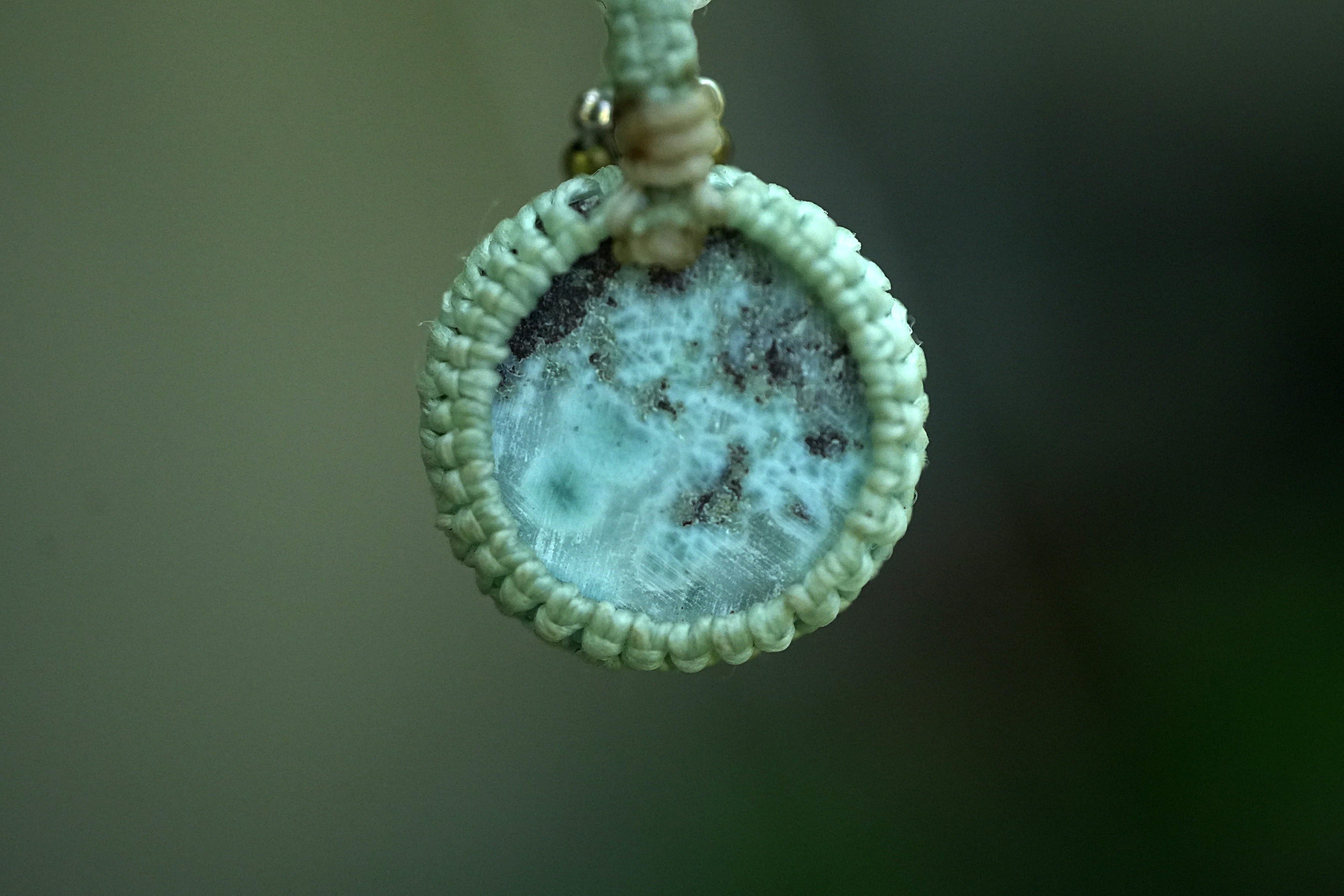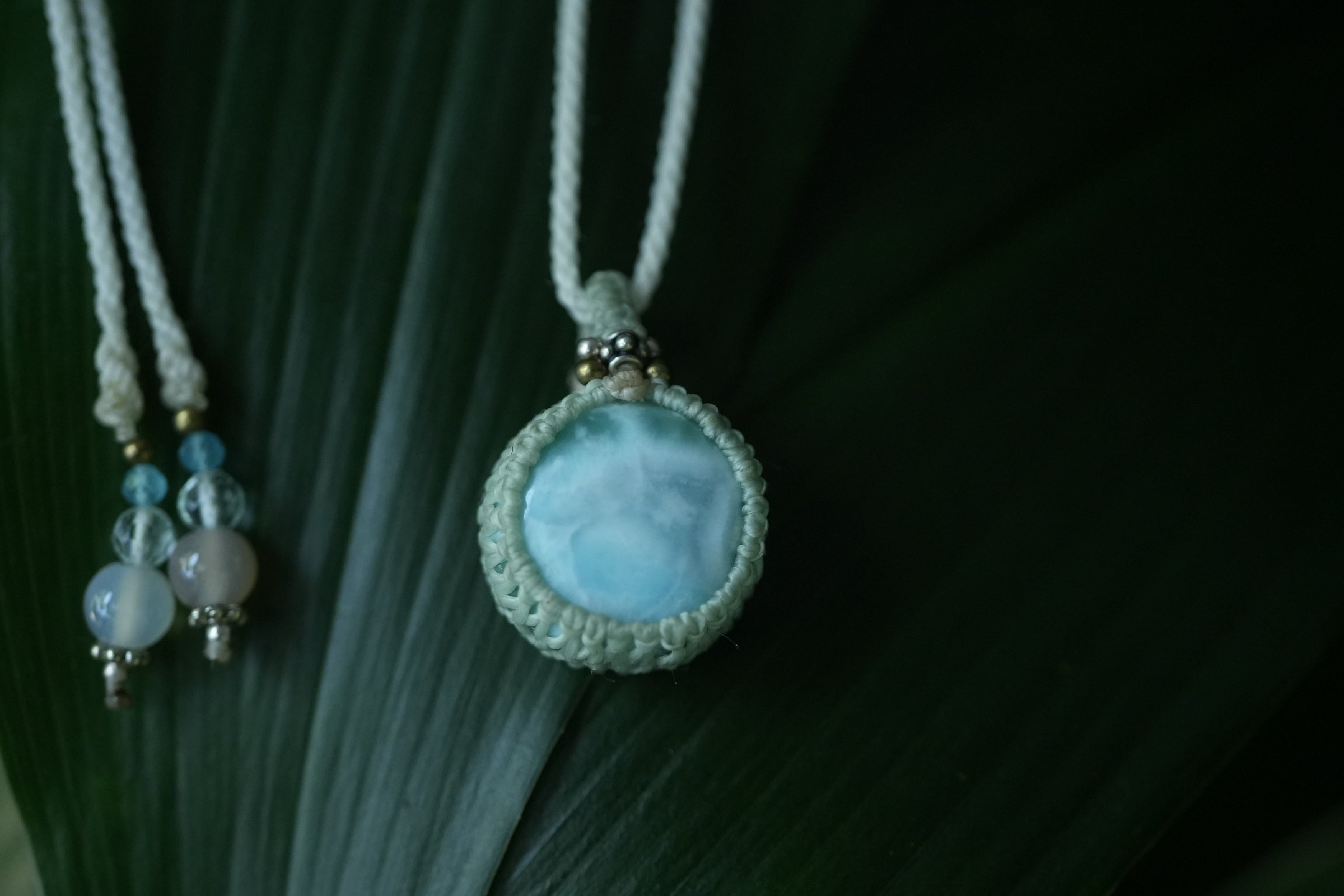 ◆このたびはミント、ホワイト色の蝋引き糸を使用しマクラメ編み装飾を施しました。