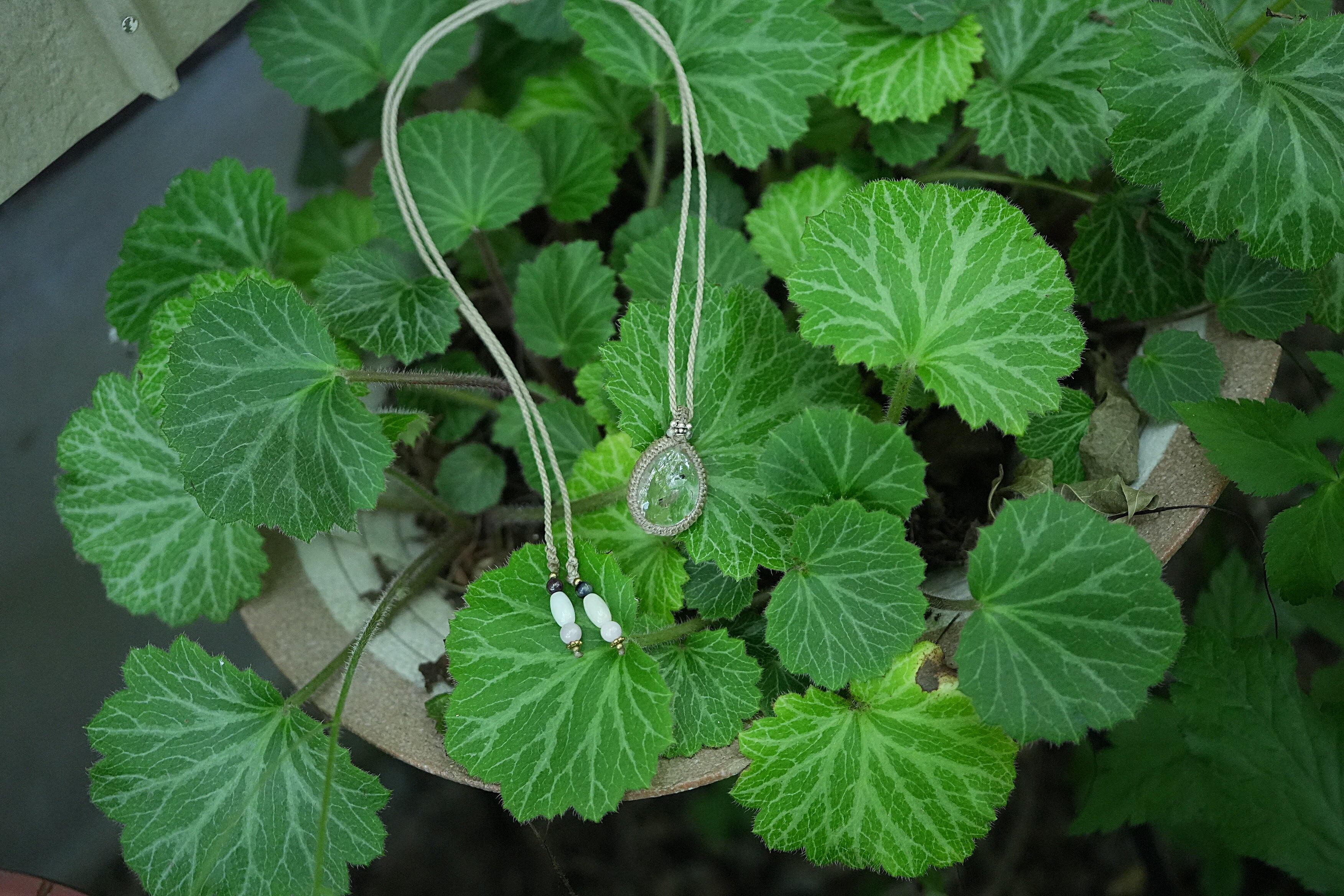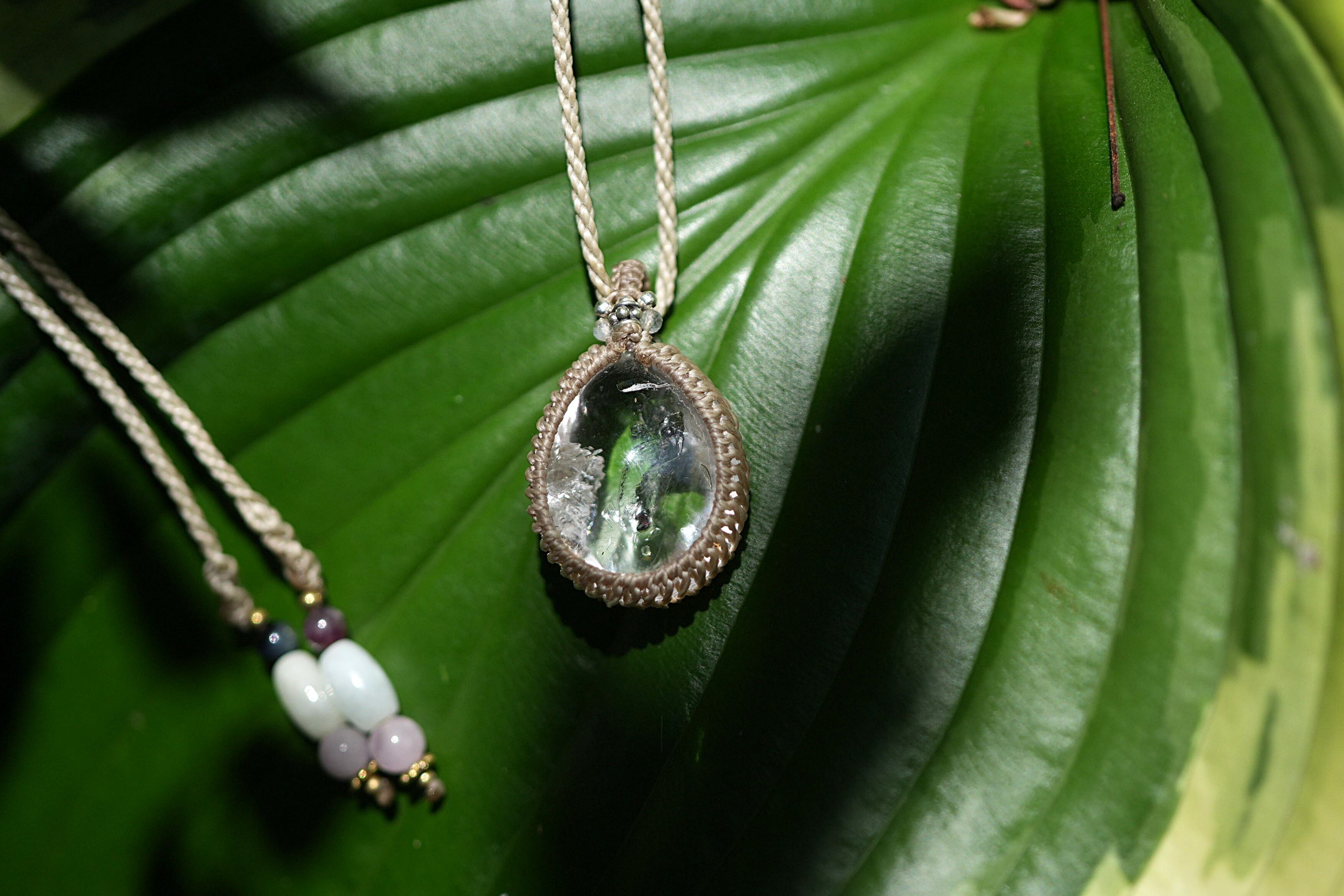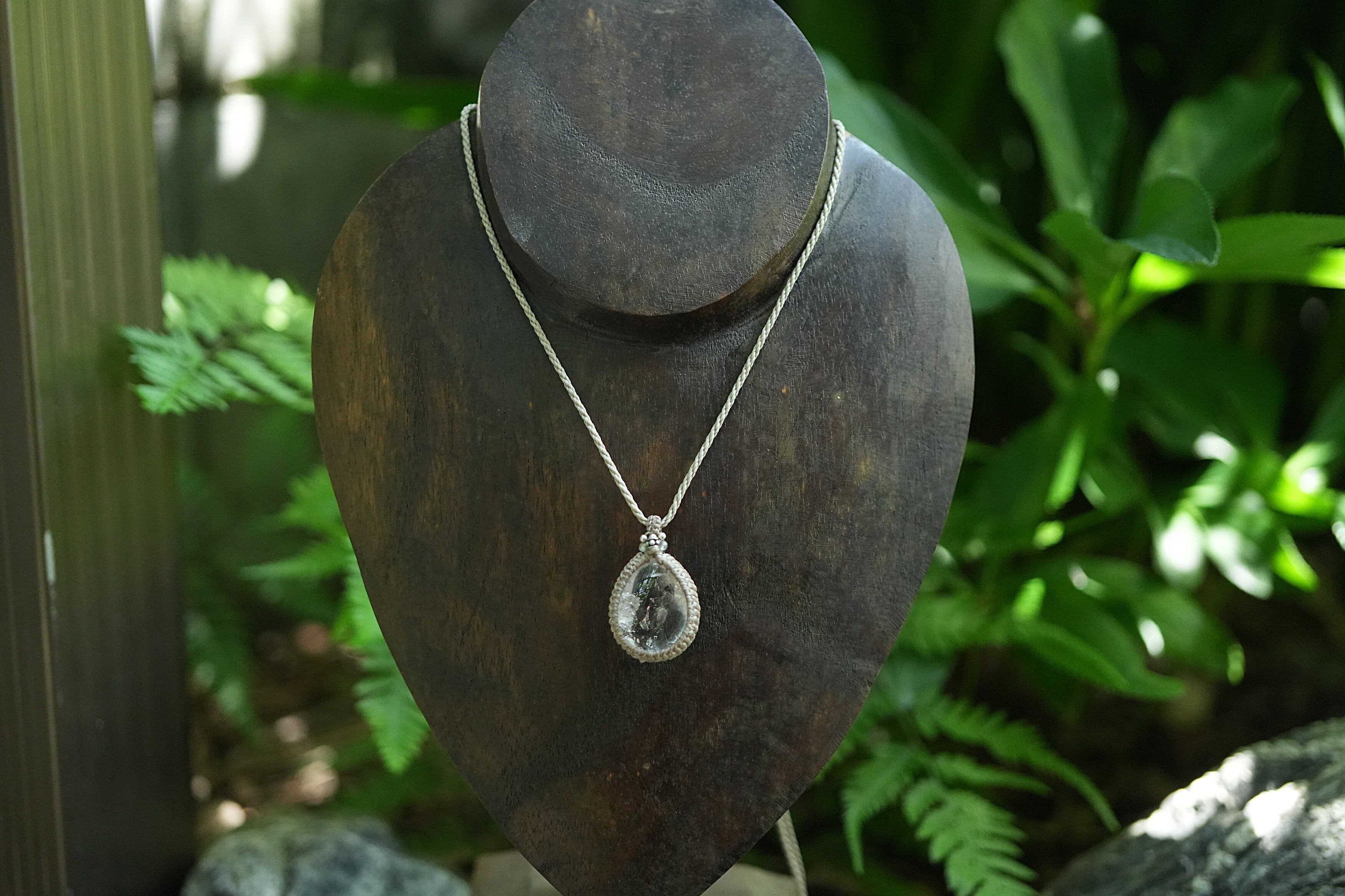 悩ましい水入り水晶をシンプルにマクラメネックレスに仕上げました。