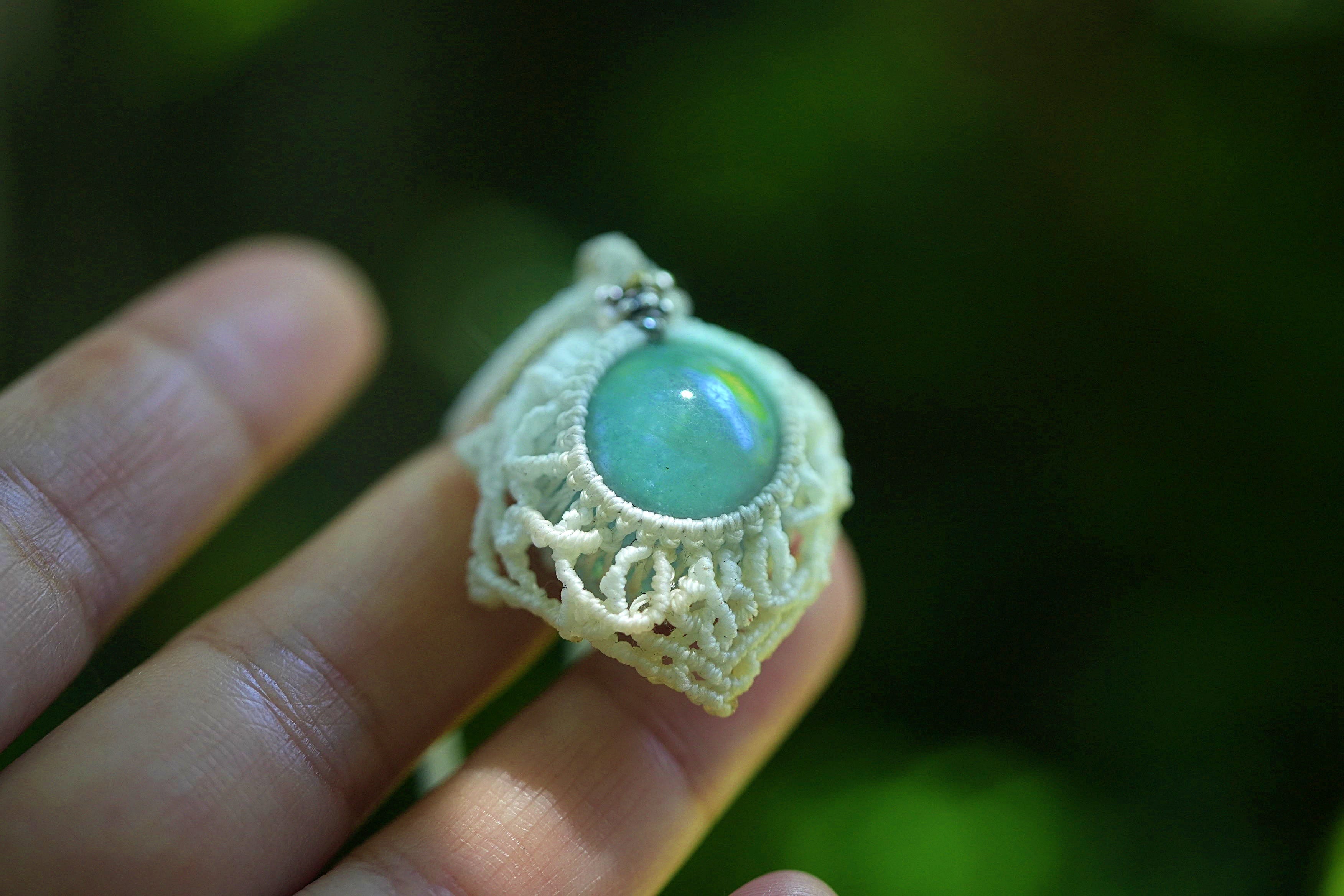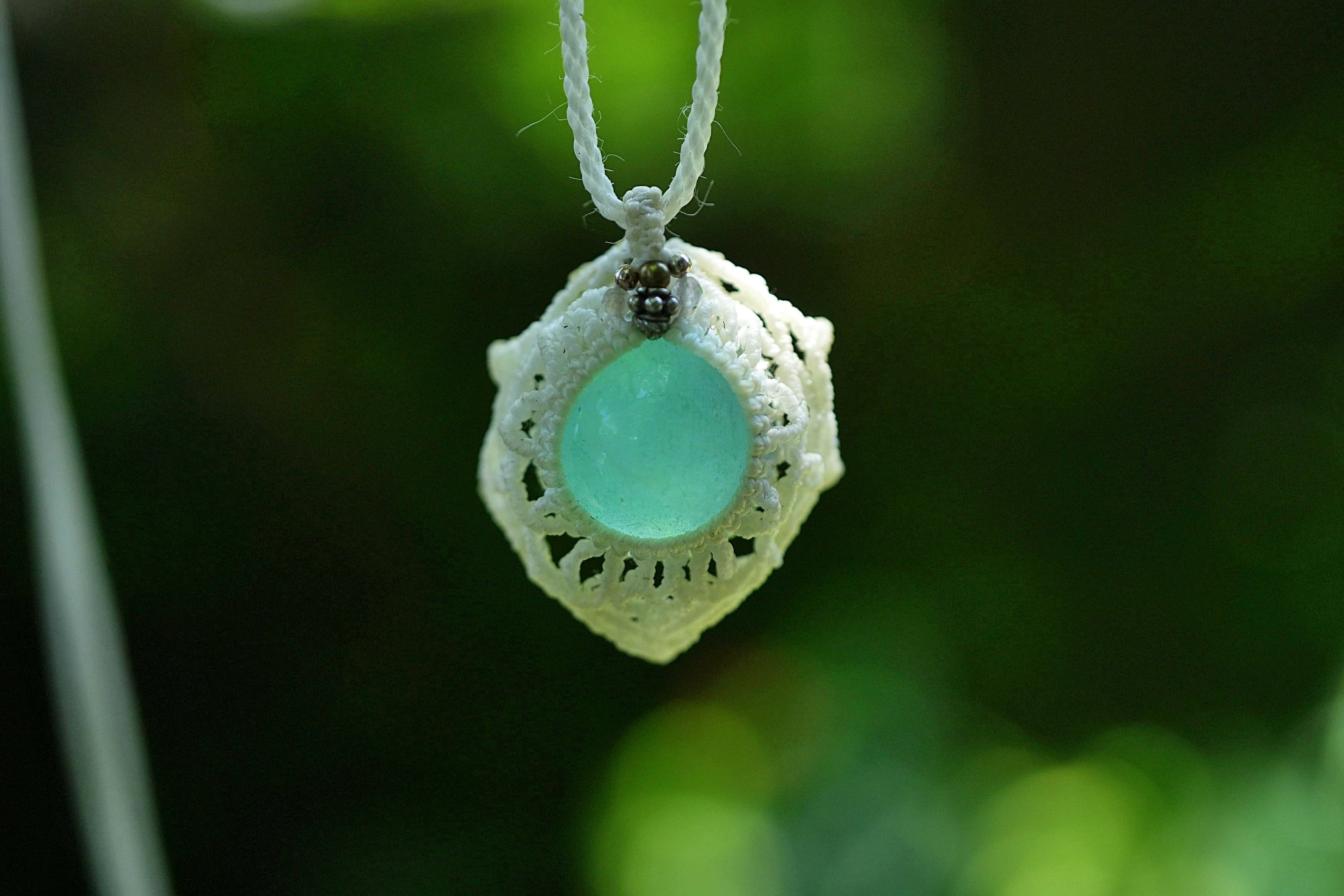 ◆このたびはホワイト色の蝋引き糸を使用しマクラメ編み装飾を施しました。