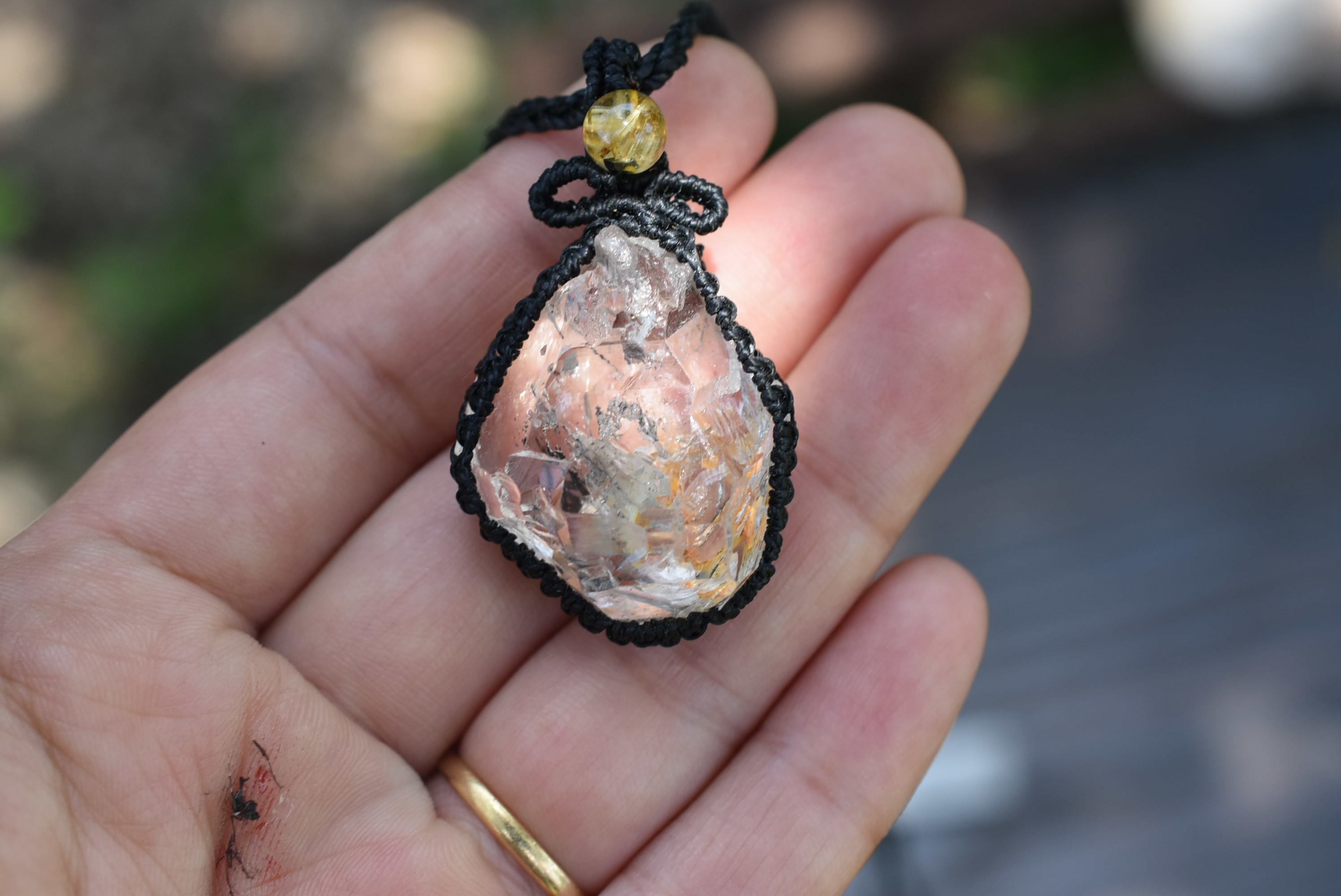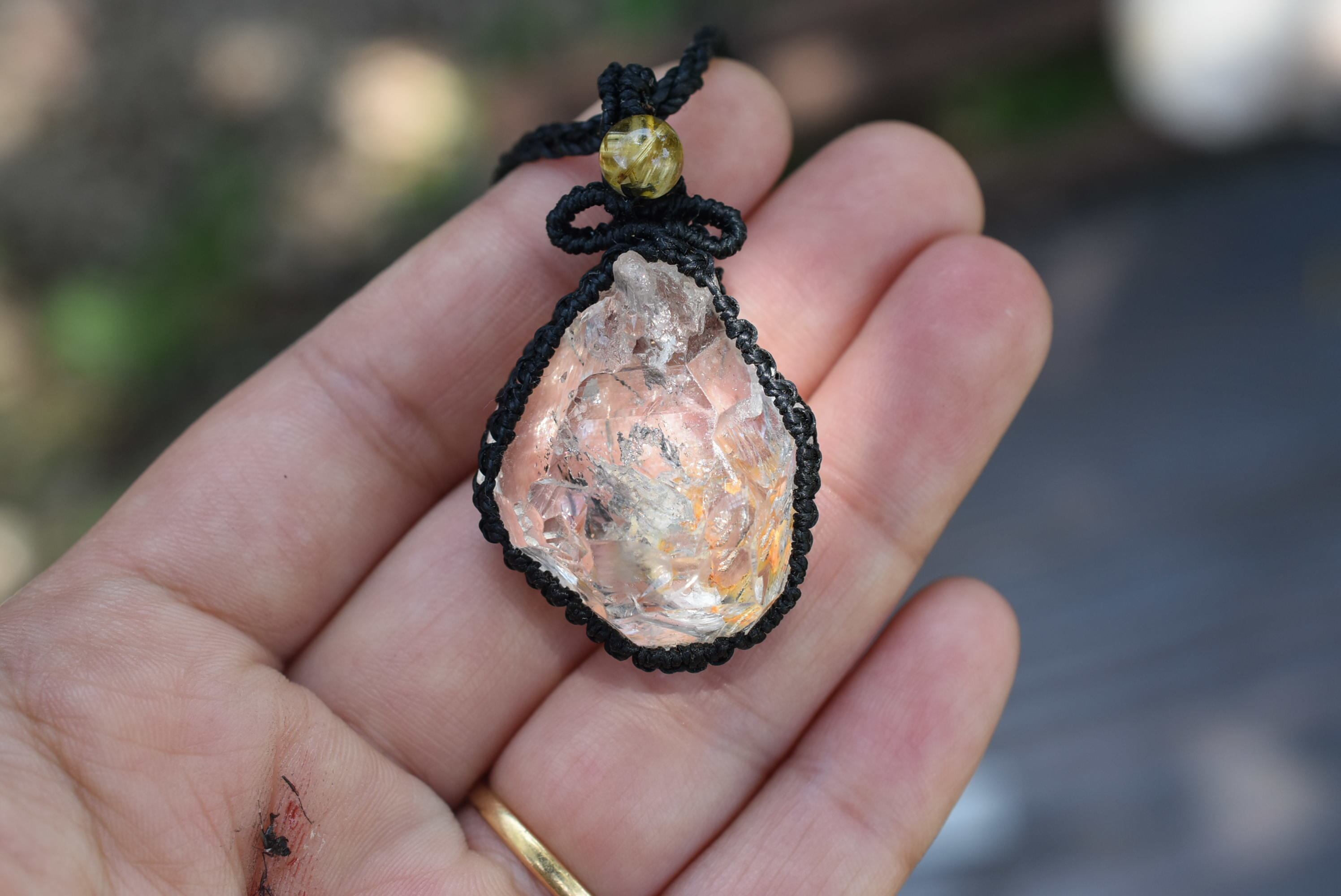 この石をゴールデンルチルクォーツビーズとともにシンプルにマクラメ編み装飾を施しました。