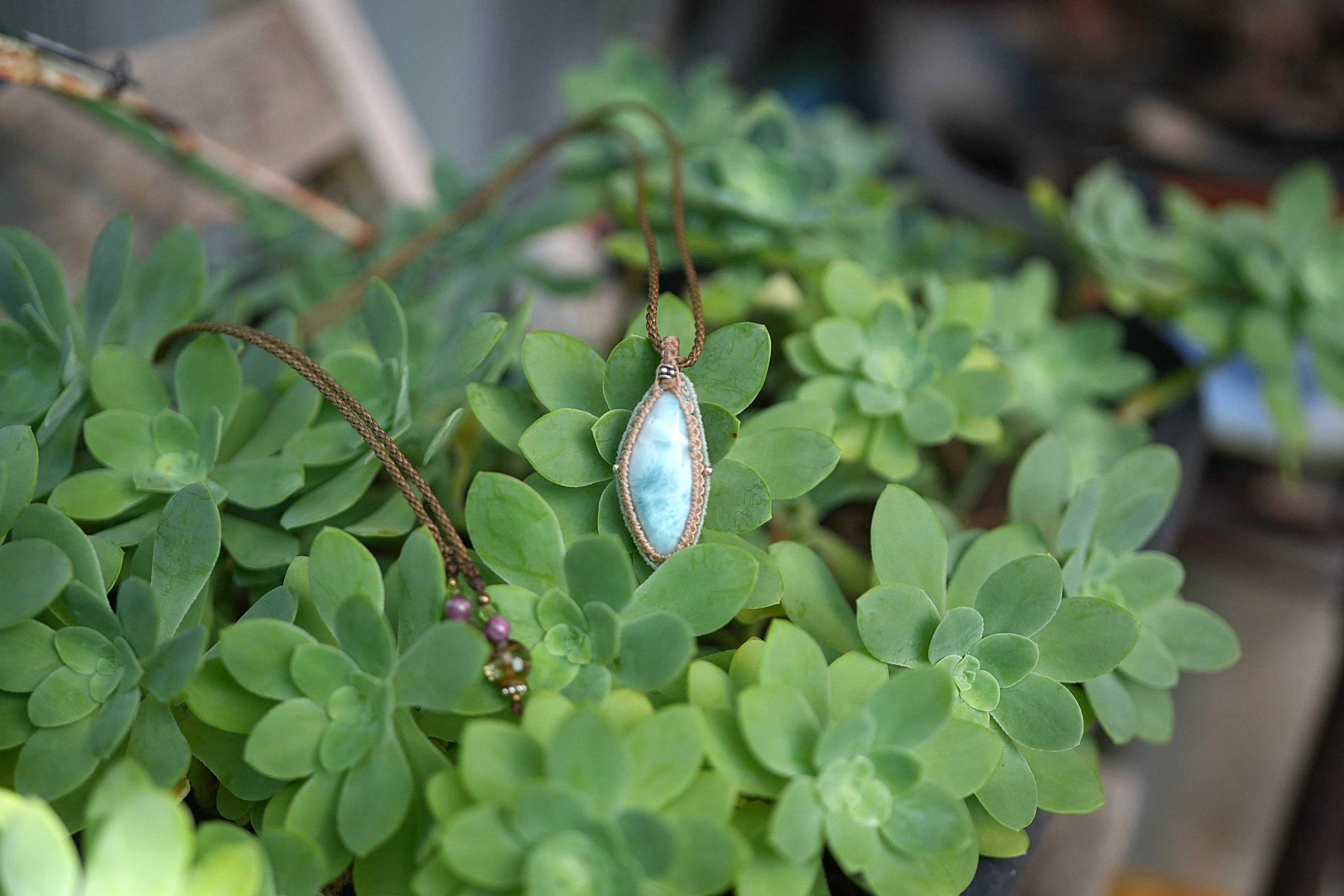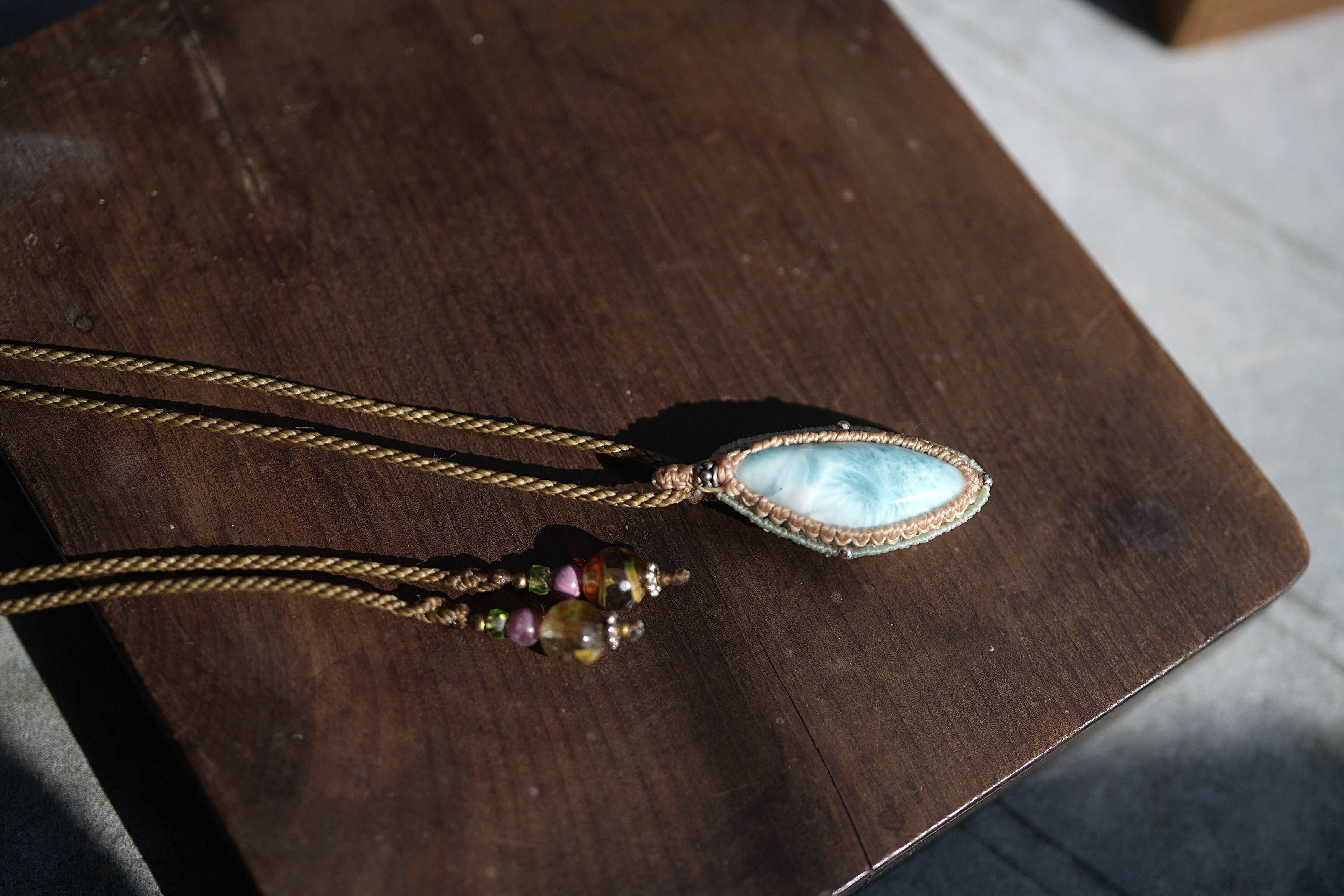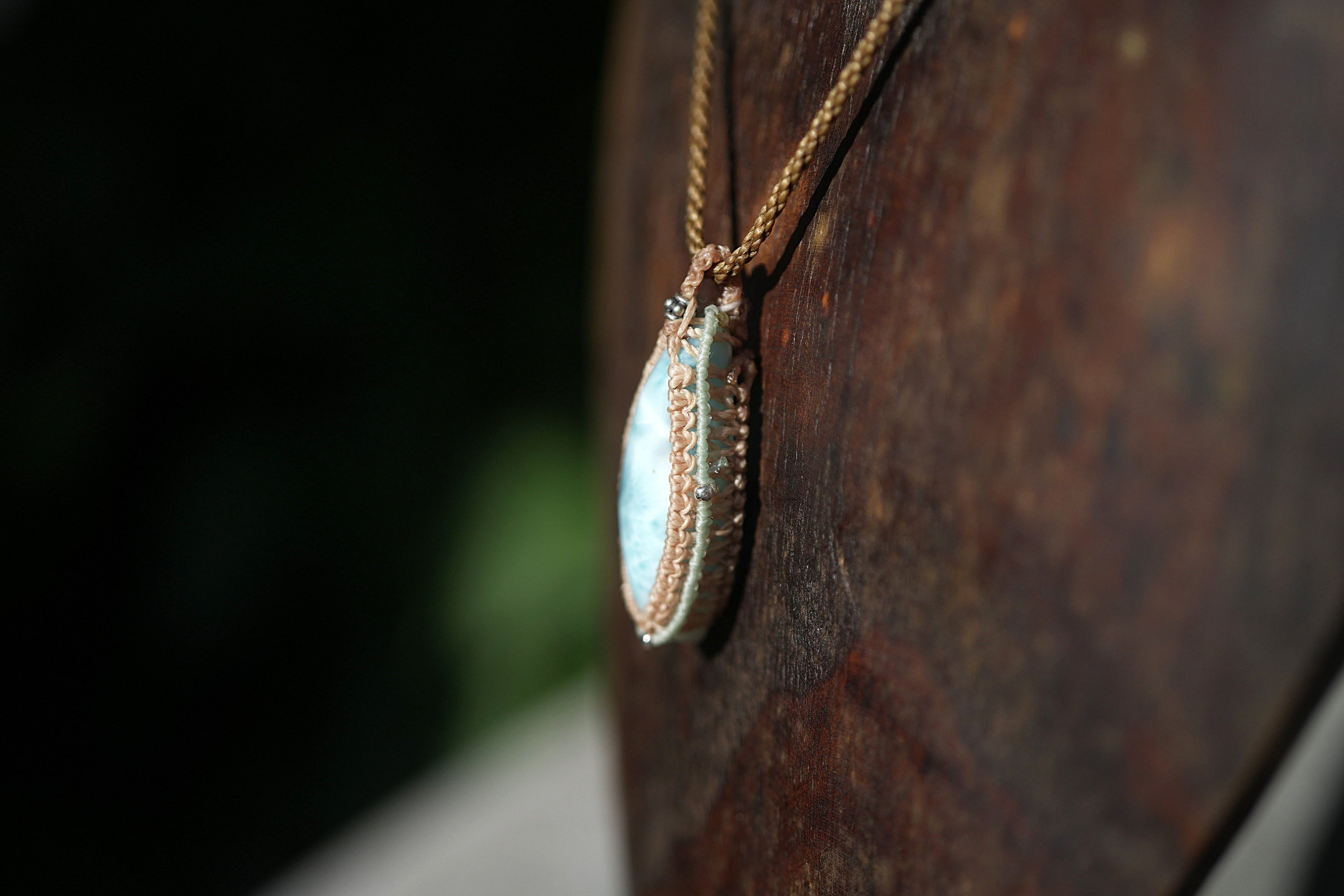 ◆このたびはキャラメル、ミント、ゴールドブラウン色の蝋引き糸を使用しマクラメ編み装飾を施しました。