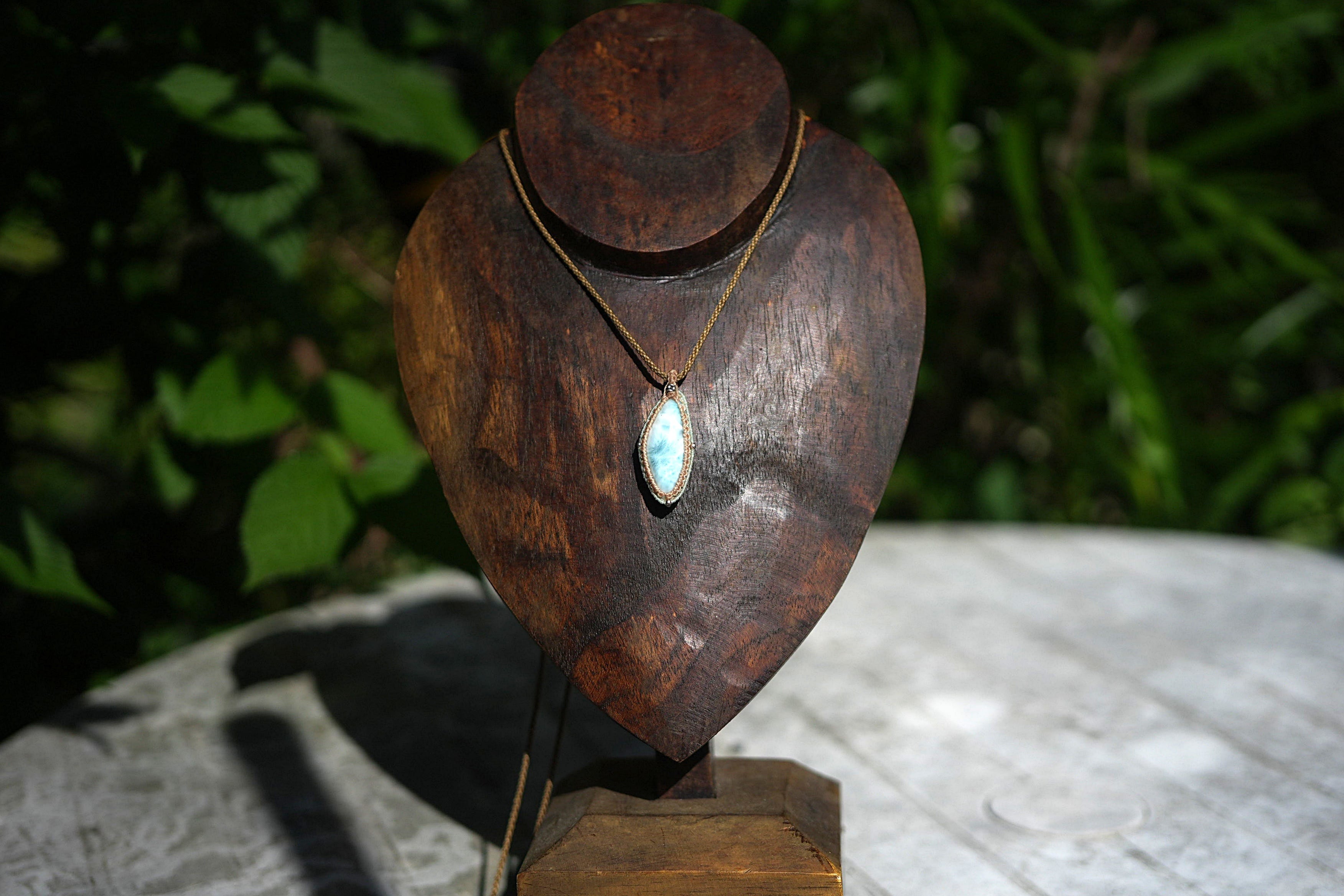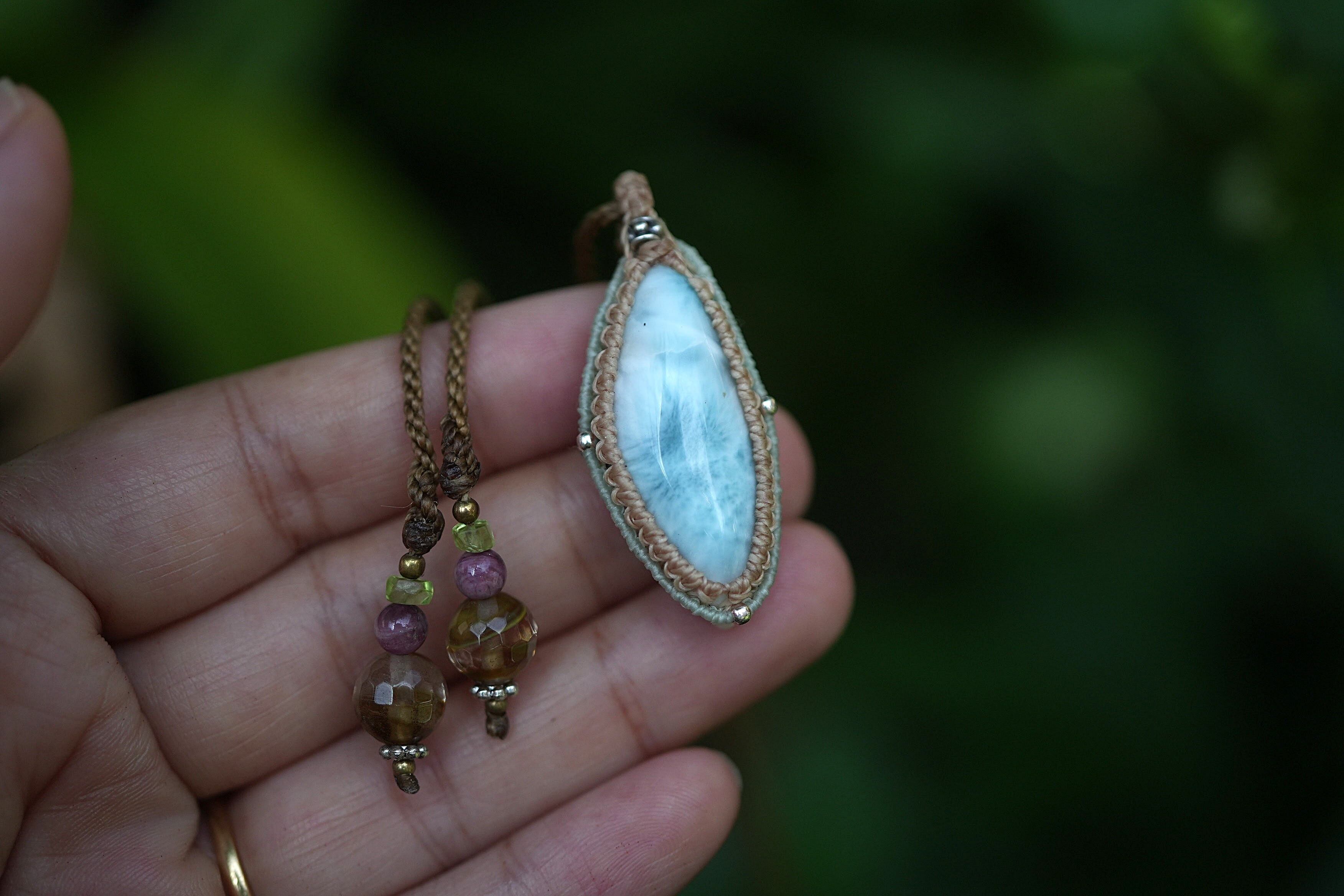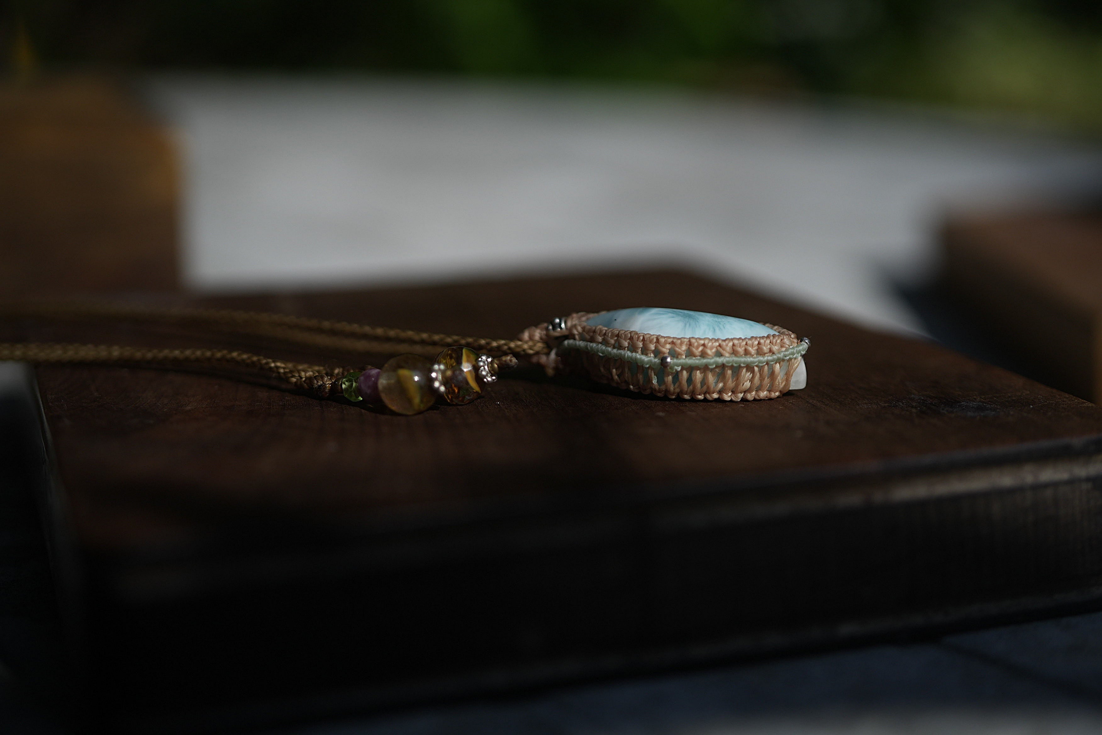 ◆このたびはキャラメル、ミント、ゴールドブラウン色の蝋引き糸を使用しマクラメ編み装飾を施しました。