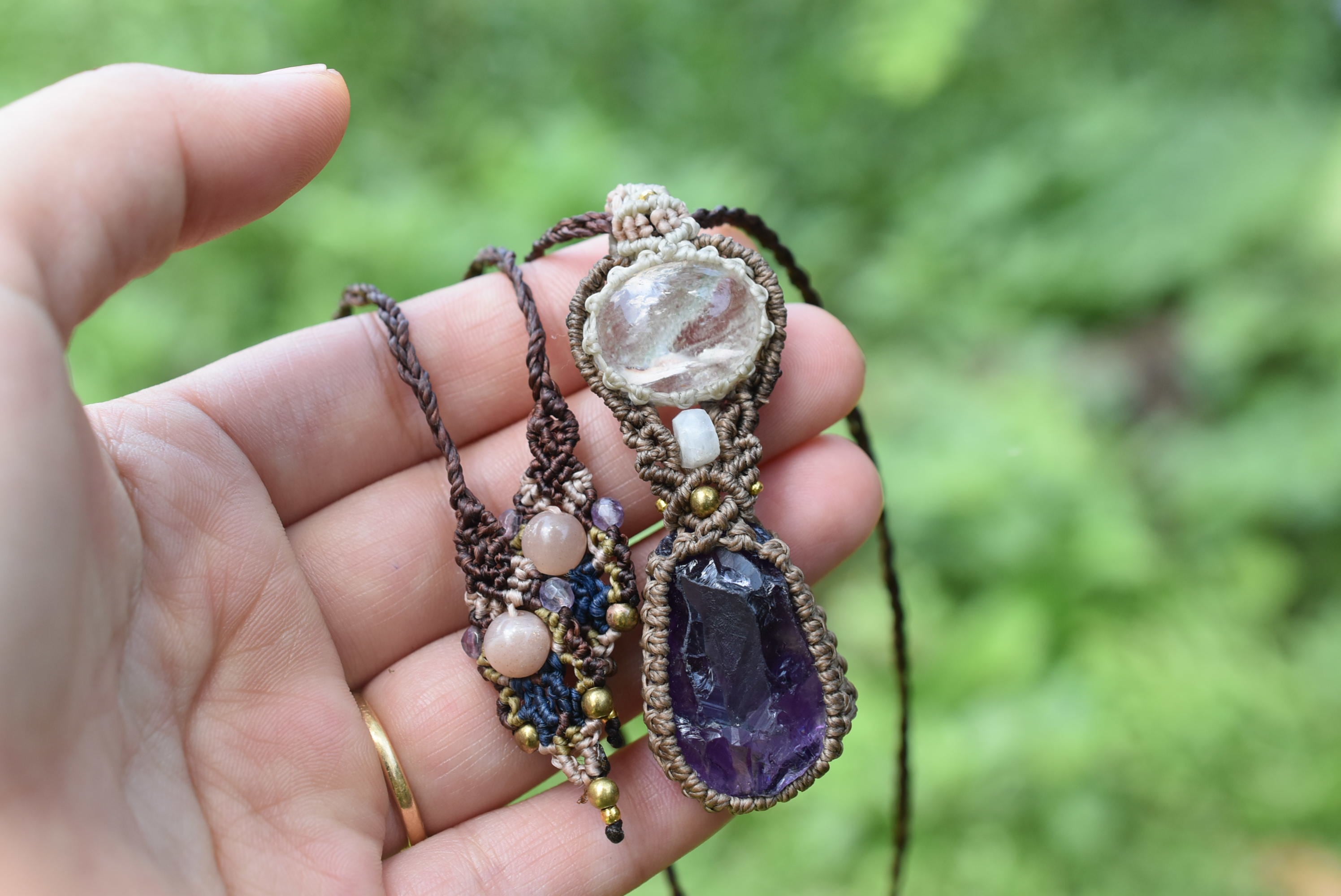 このたびはピンクの美しい朝焼けのような霧がかったガーデンクォーツと神秘的な石の象徴でもあるディープな色味を持つアメジスト原石 2つをひとつにしてマクラメ編み装飾を施し、ペンダントに仕上げました。