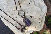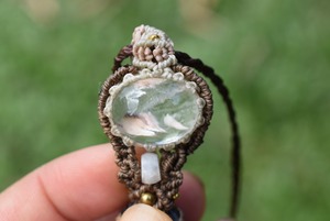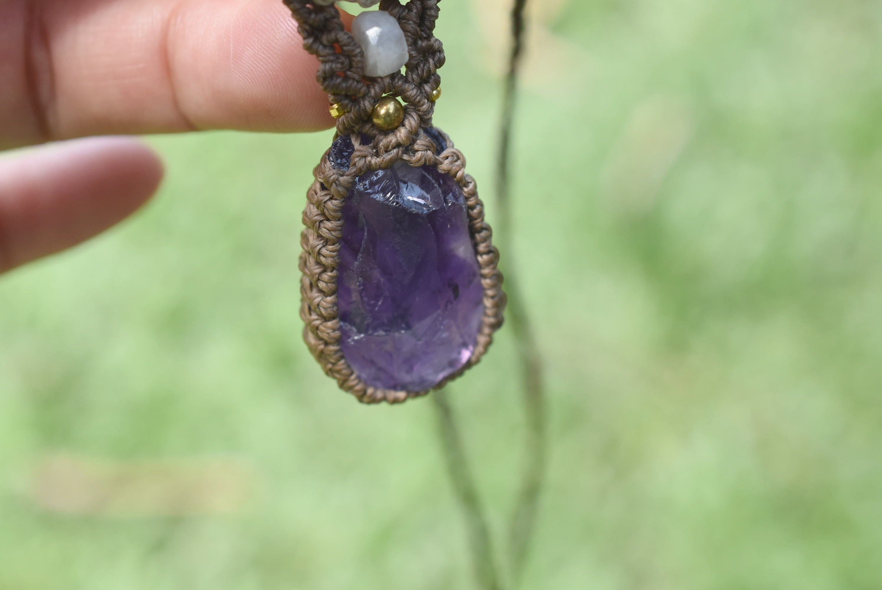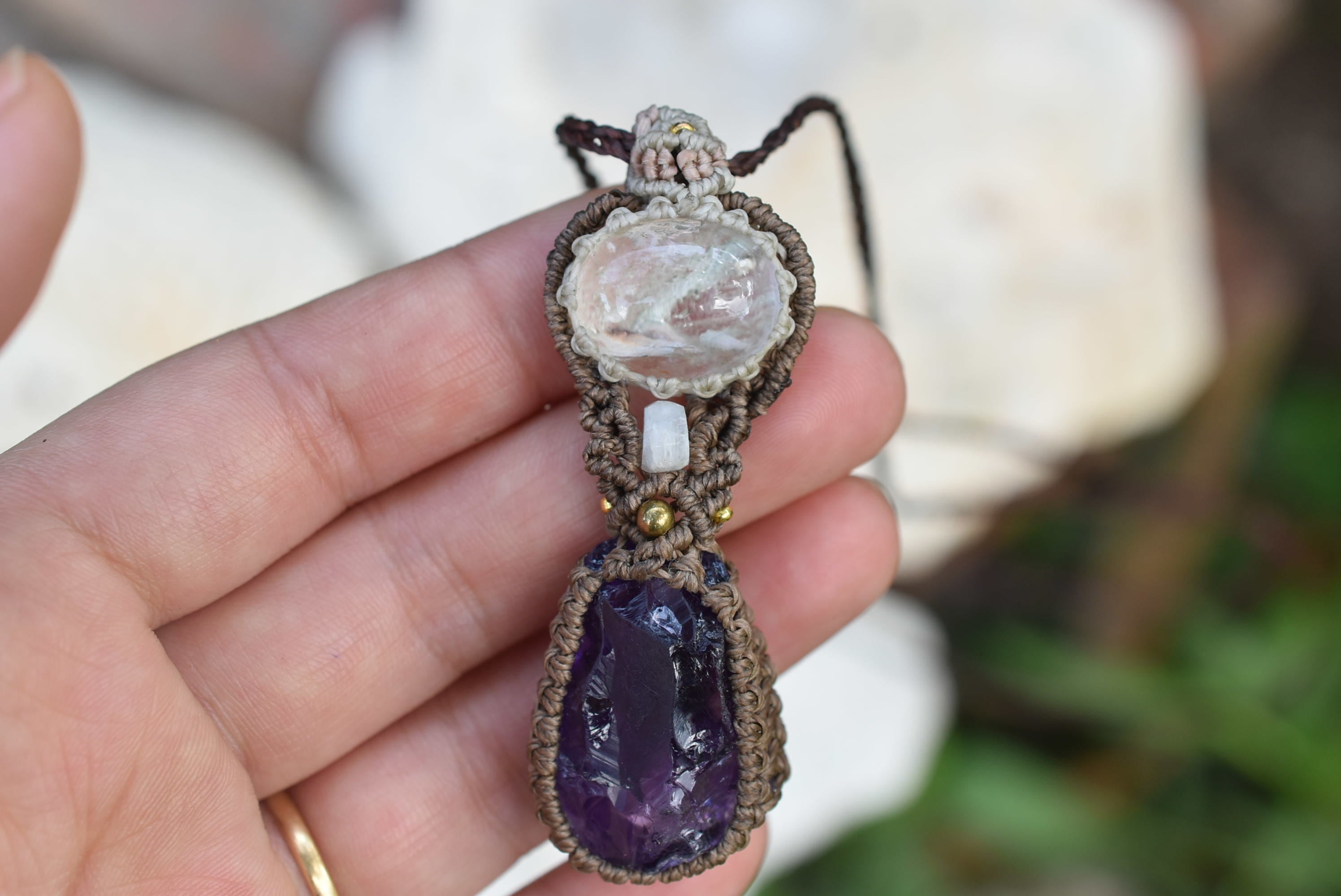 背守りとなる紐の先には愛らしさが際立つピンクのムーンストーンと、エレガントな雰囲気を持つダイアモンドカットされたアメジスト、真鍮ビーズを使用しマクラメ編み装飾を施しました。 オーガニックでエレガントな雰囲気をミックスさせた天然石ペンダントに仕上げました。