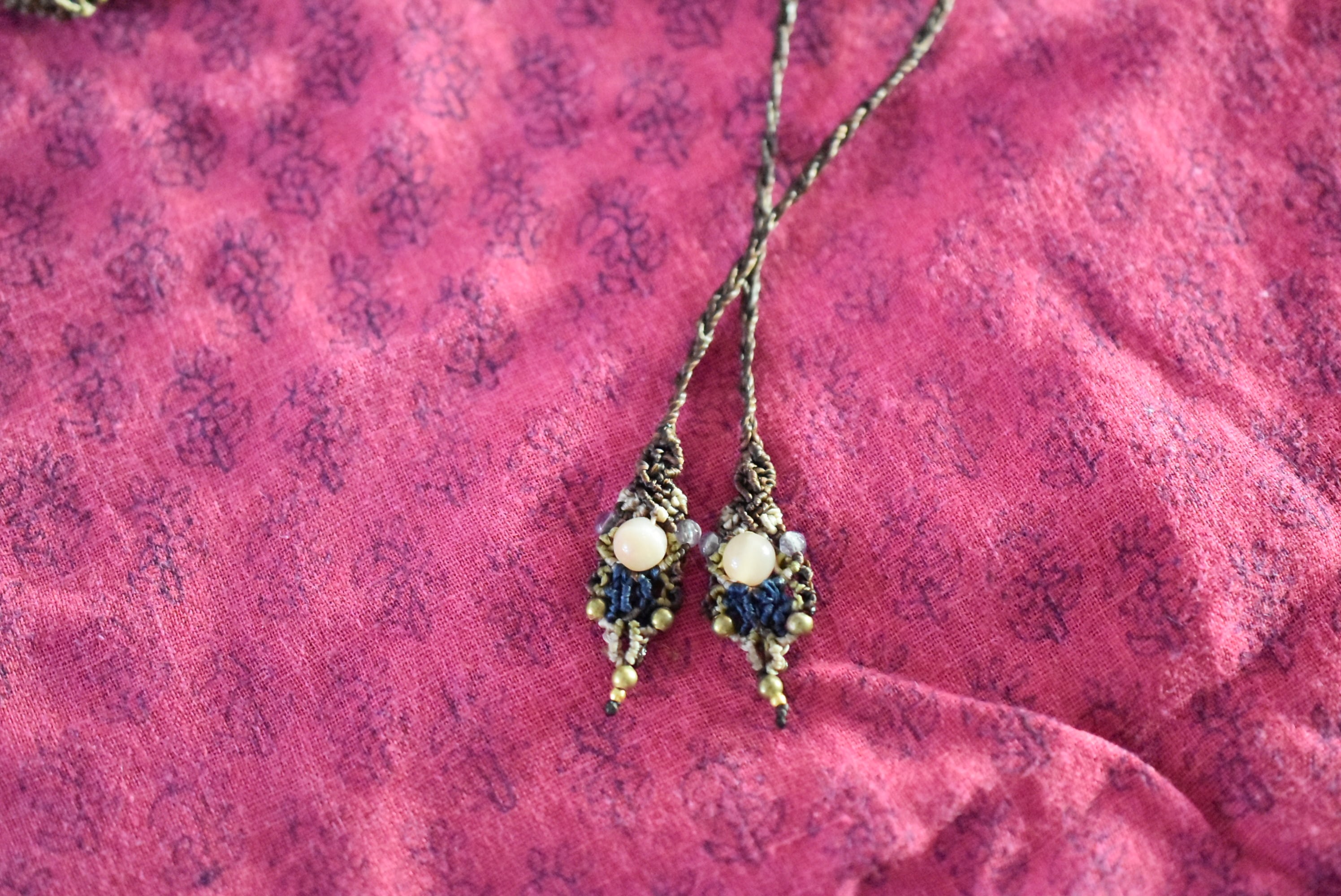 ◆このたびはテディベアブラウン、コーヒーブラウン、キナリ、差し色とピンクベージュ、インディゴブルー、オリーブの6色の蝋引き糸を使用しマクラメ編み装飾を施しました。