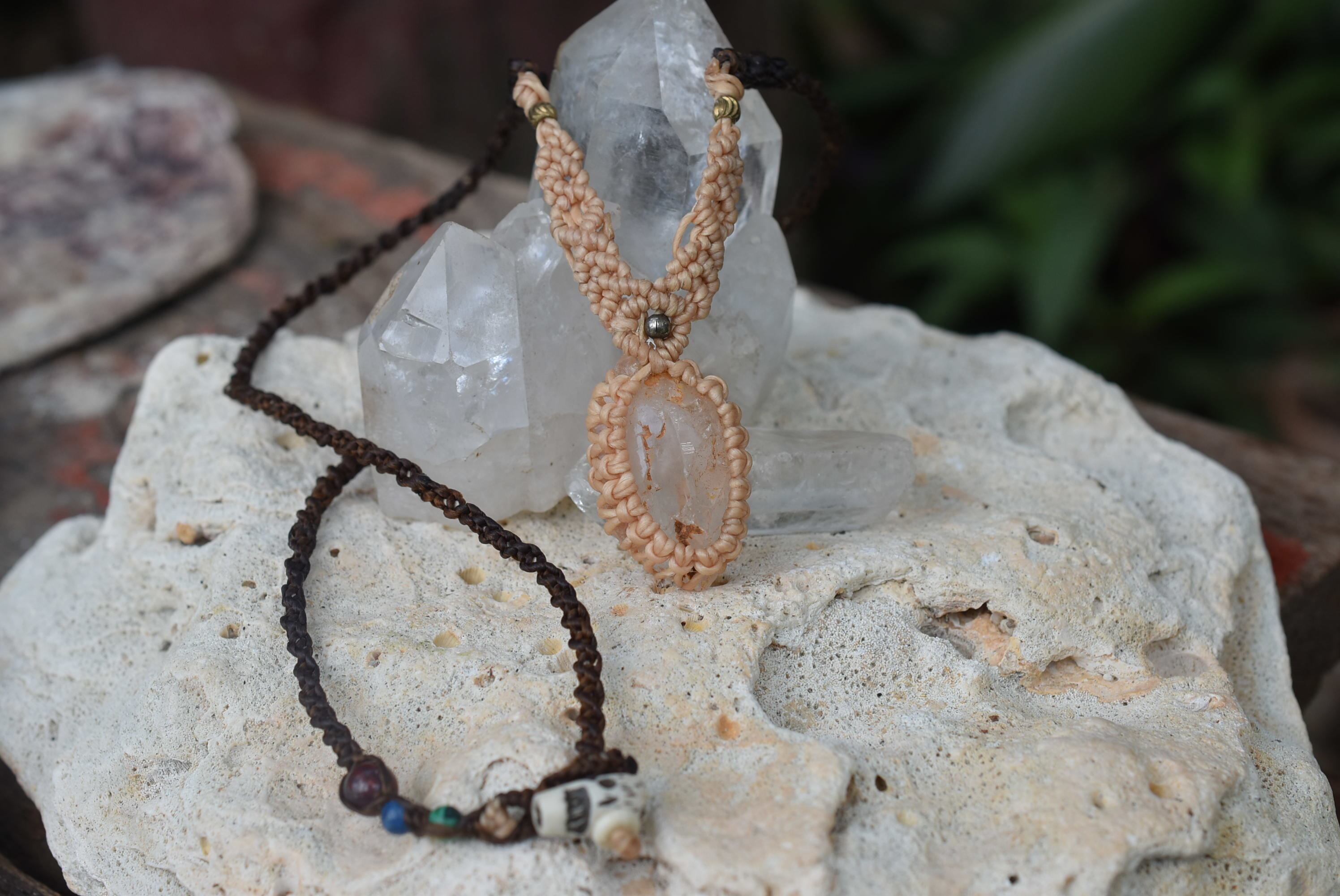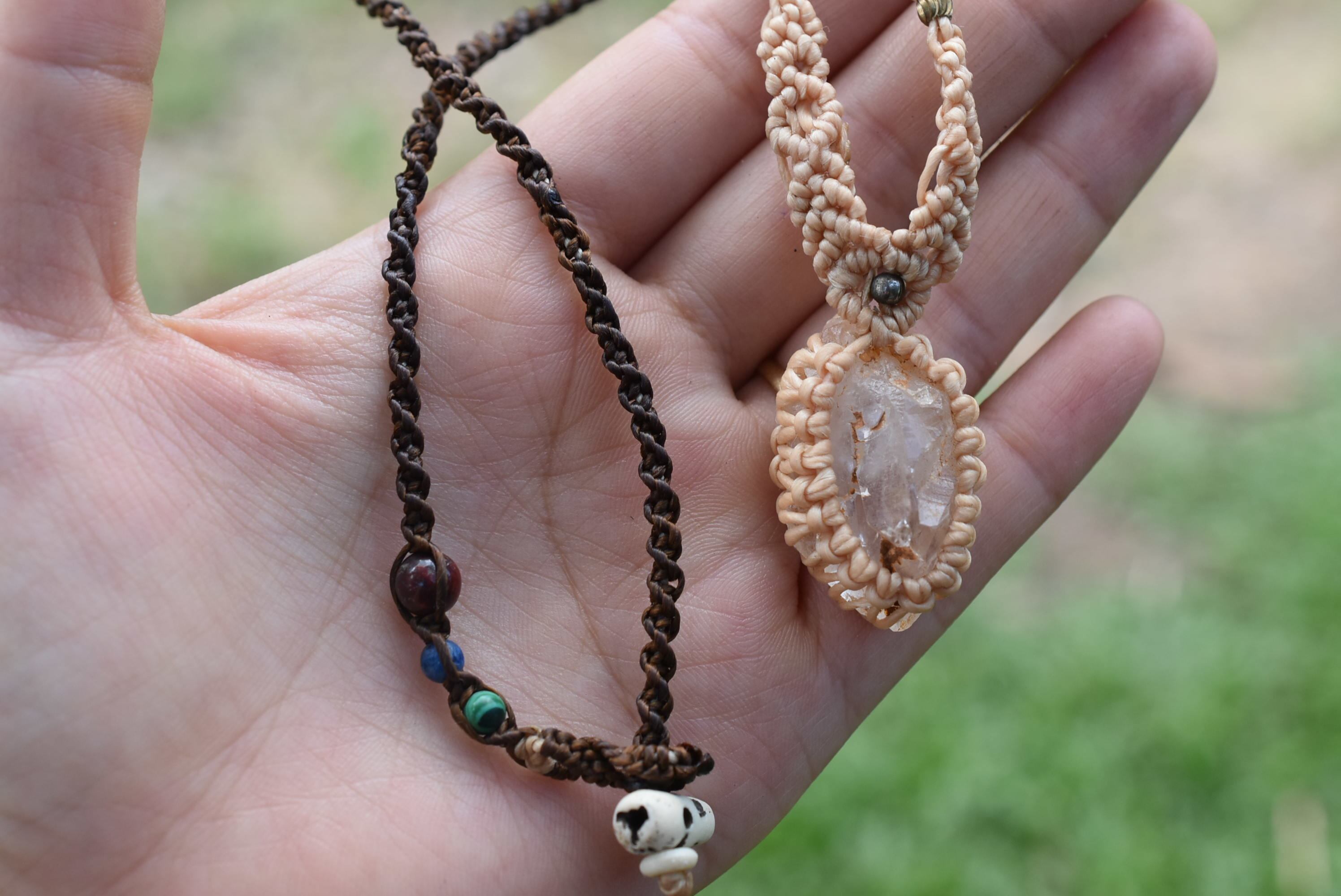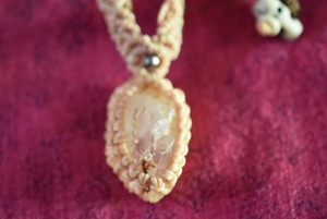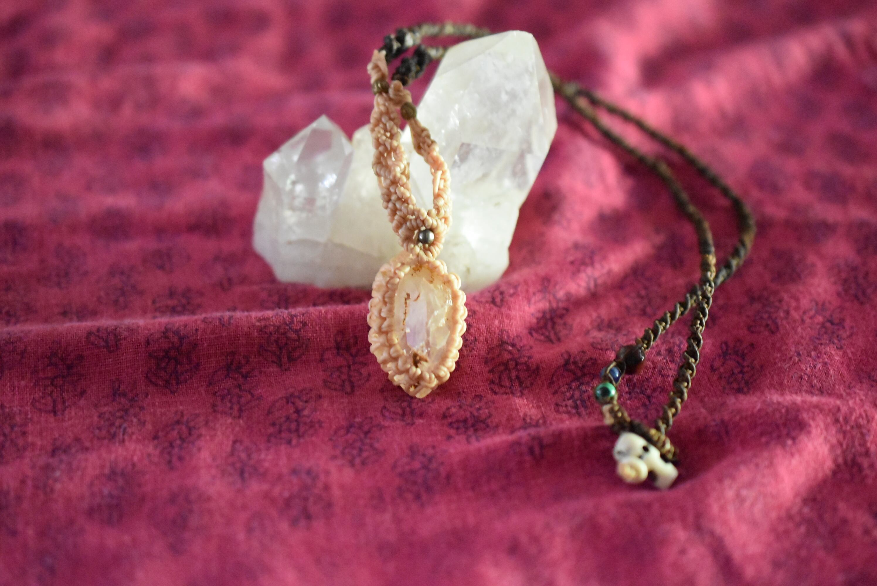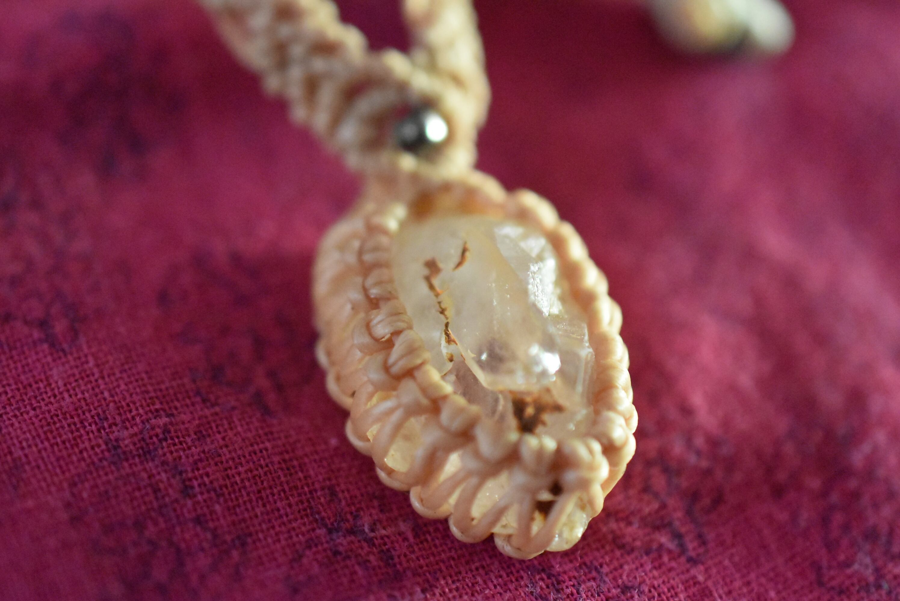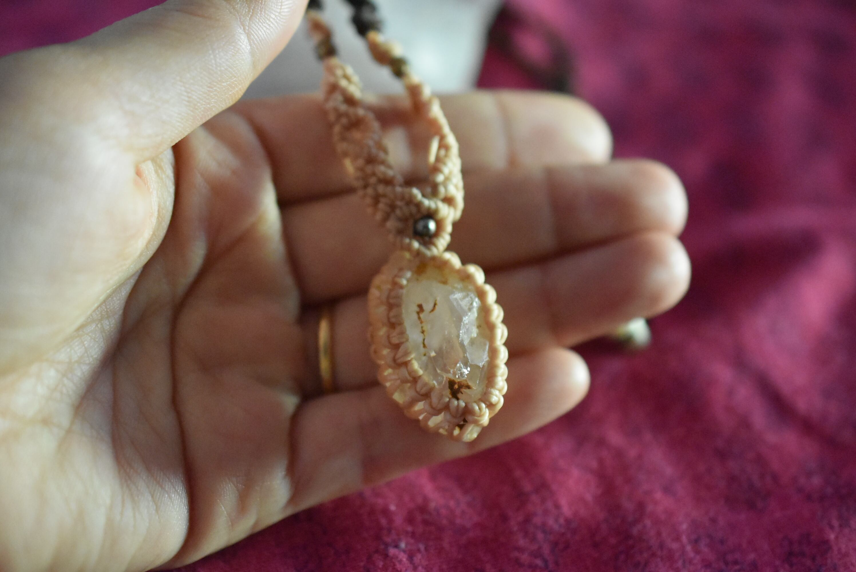 このたびは透明感あるクリスタルをトライバル調にマクラメ編み装飾を施し、ネックレスに仕上げました。