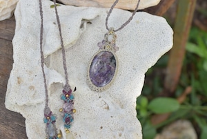透明感溢れるムーンストーンビーズやアメジストとのコンビネーションがチャロアイトと共に胸元を彩ることをイメージして制作しました。