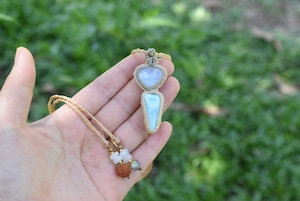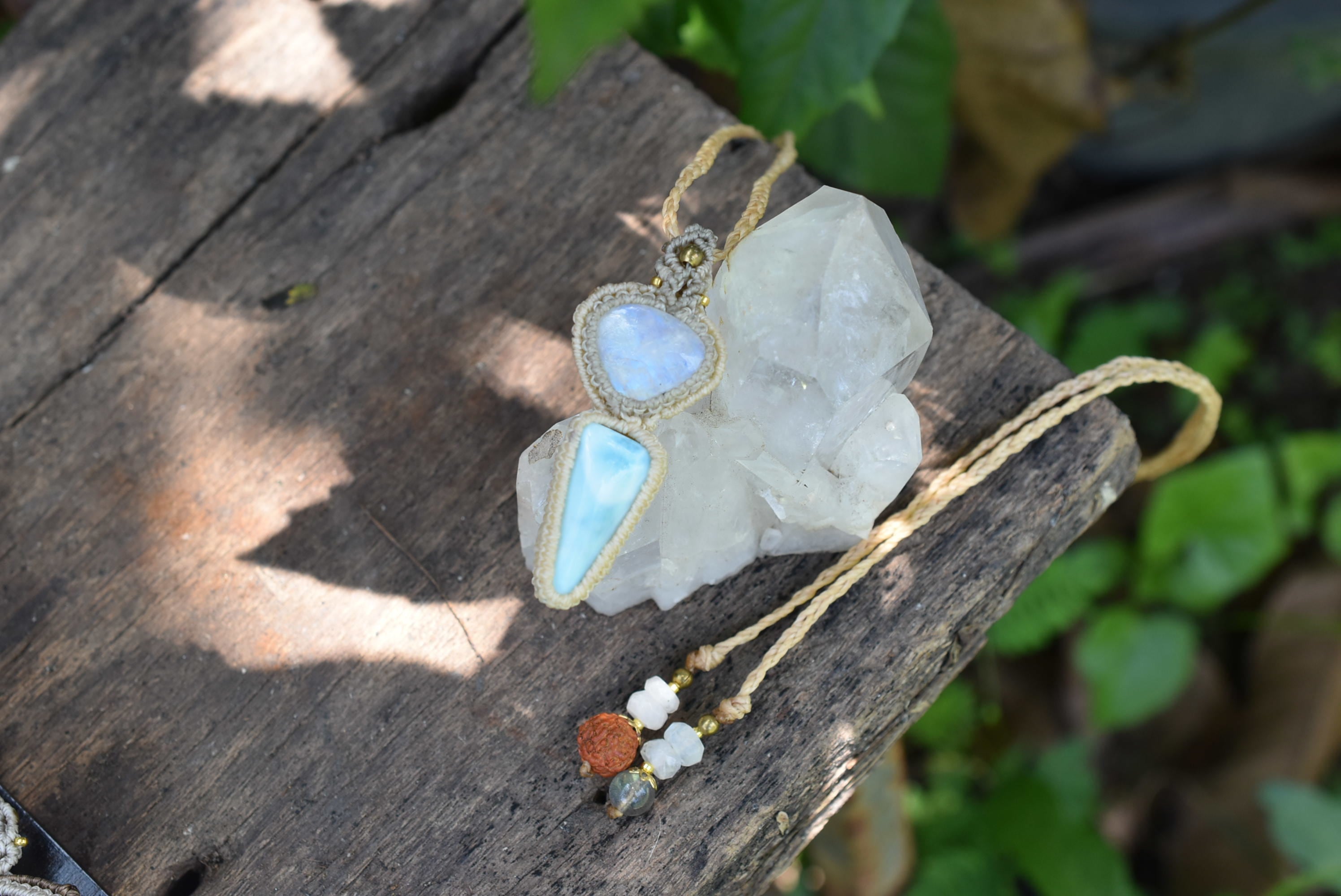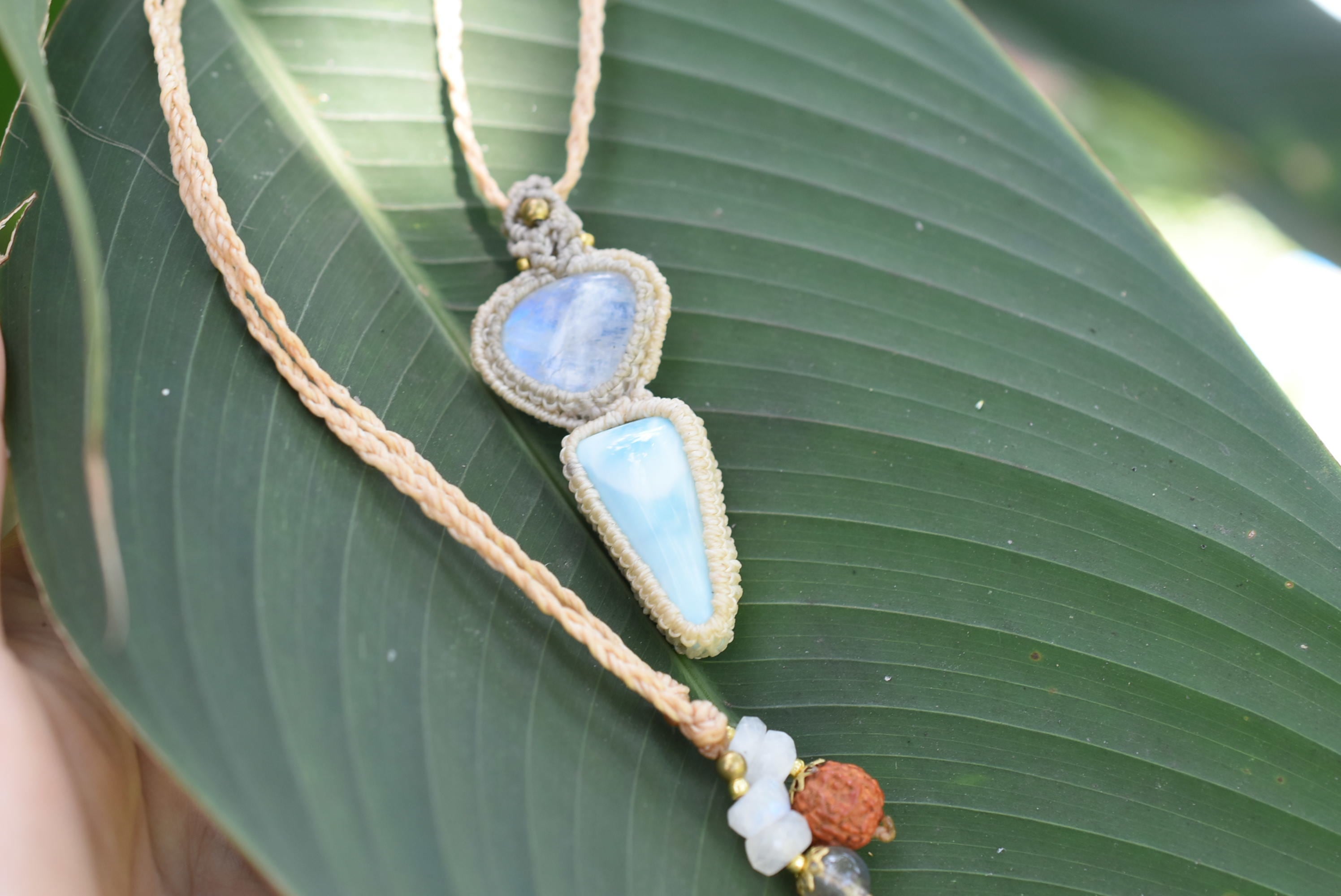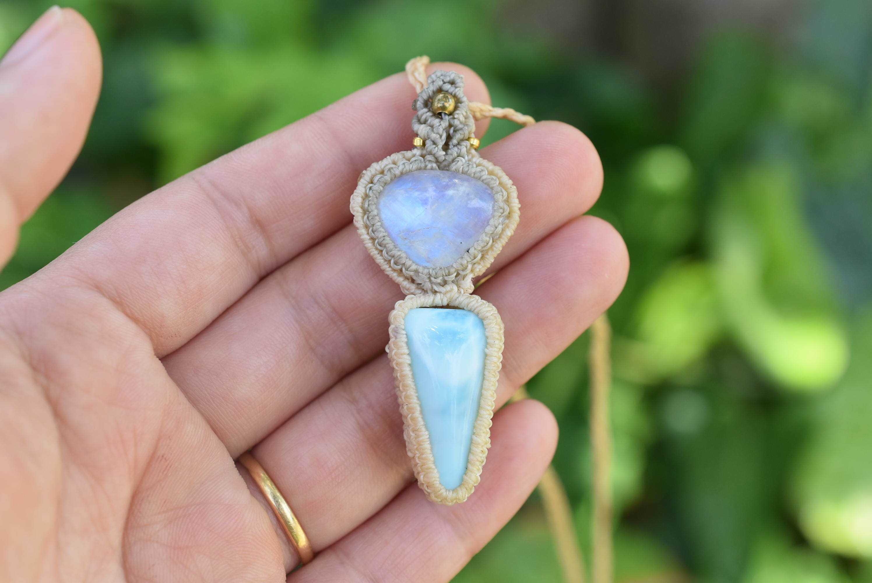 このたび、小ぶりながらも美しいブルームーンストーンと上質なラリマーを組み合わせてコンパクトなペンダントにマクラメ編み装飾を施しました。
