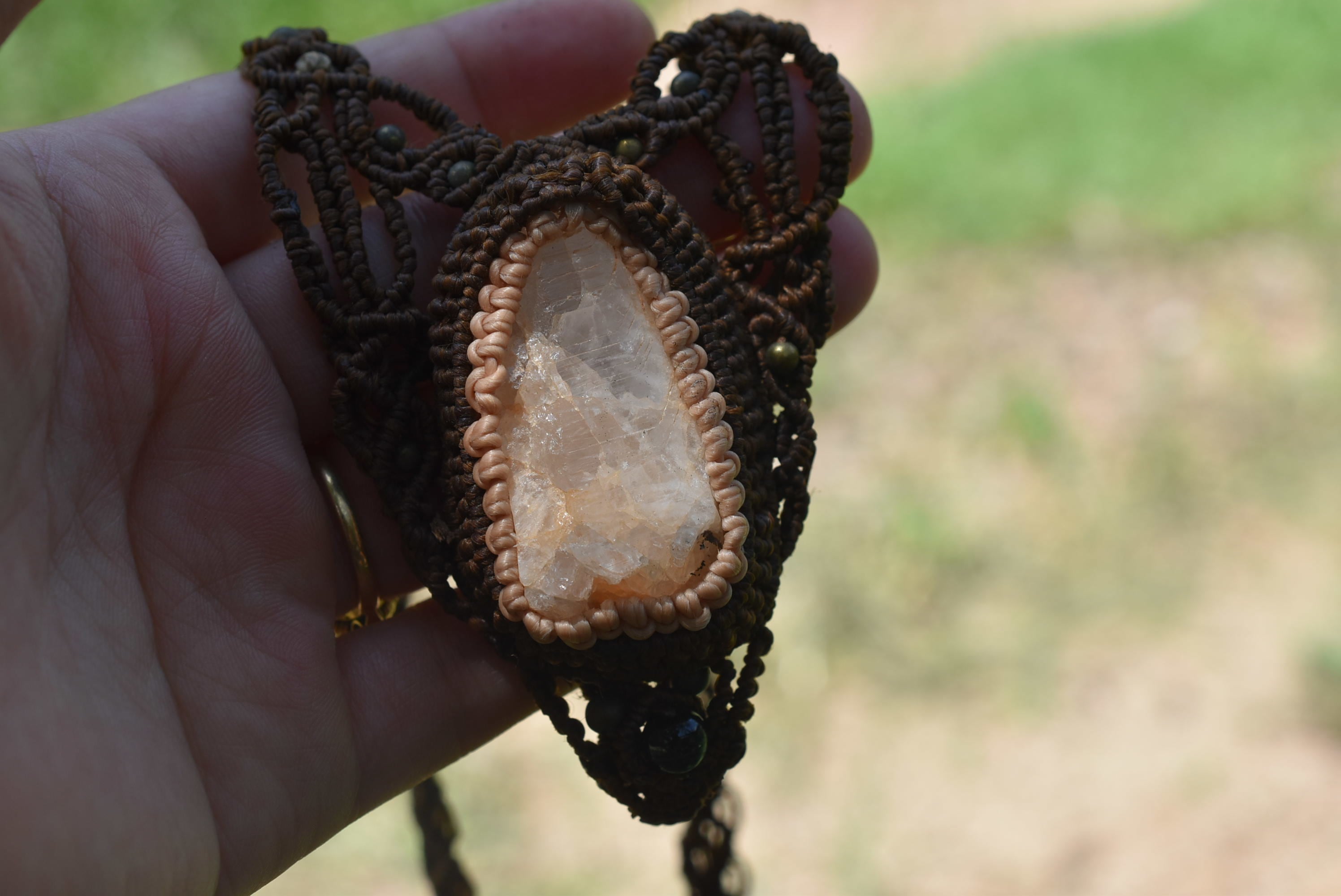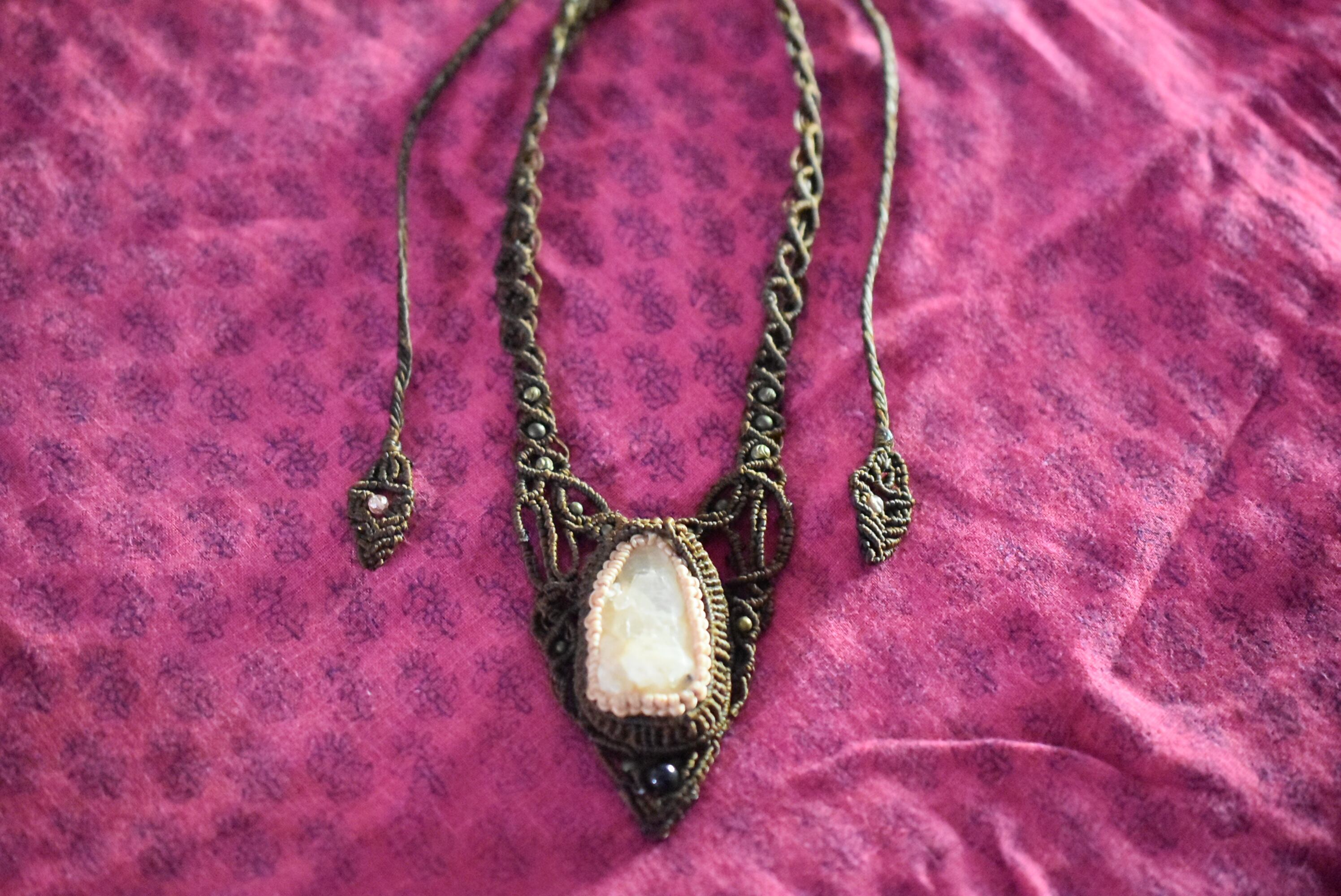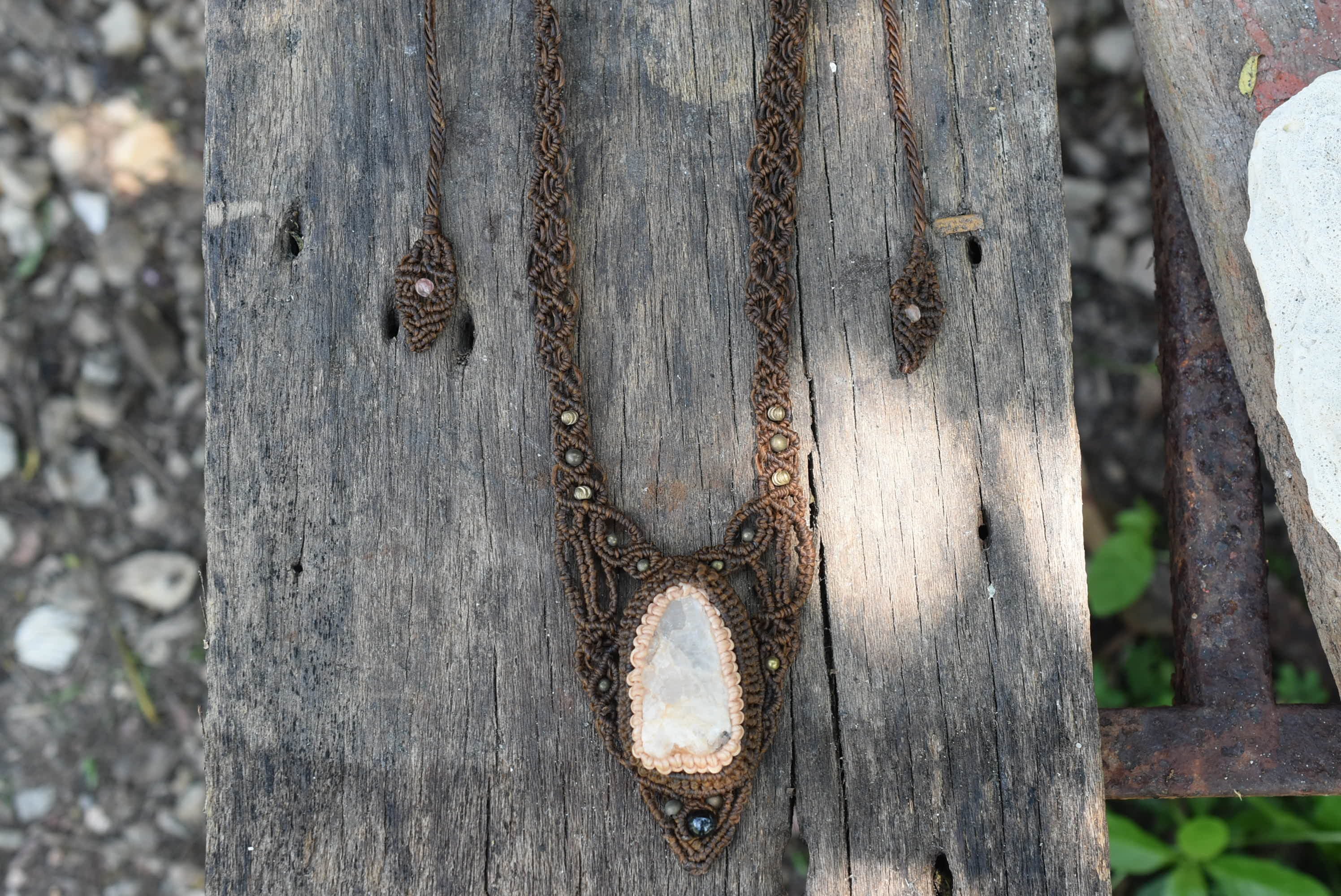 独特なクリスタル原石をネックレスにマクラメ編み装飾を施して仕上げました。