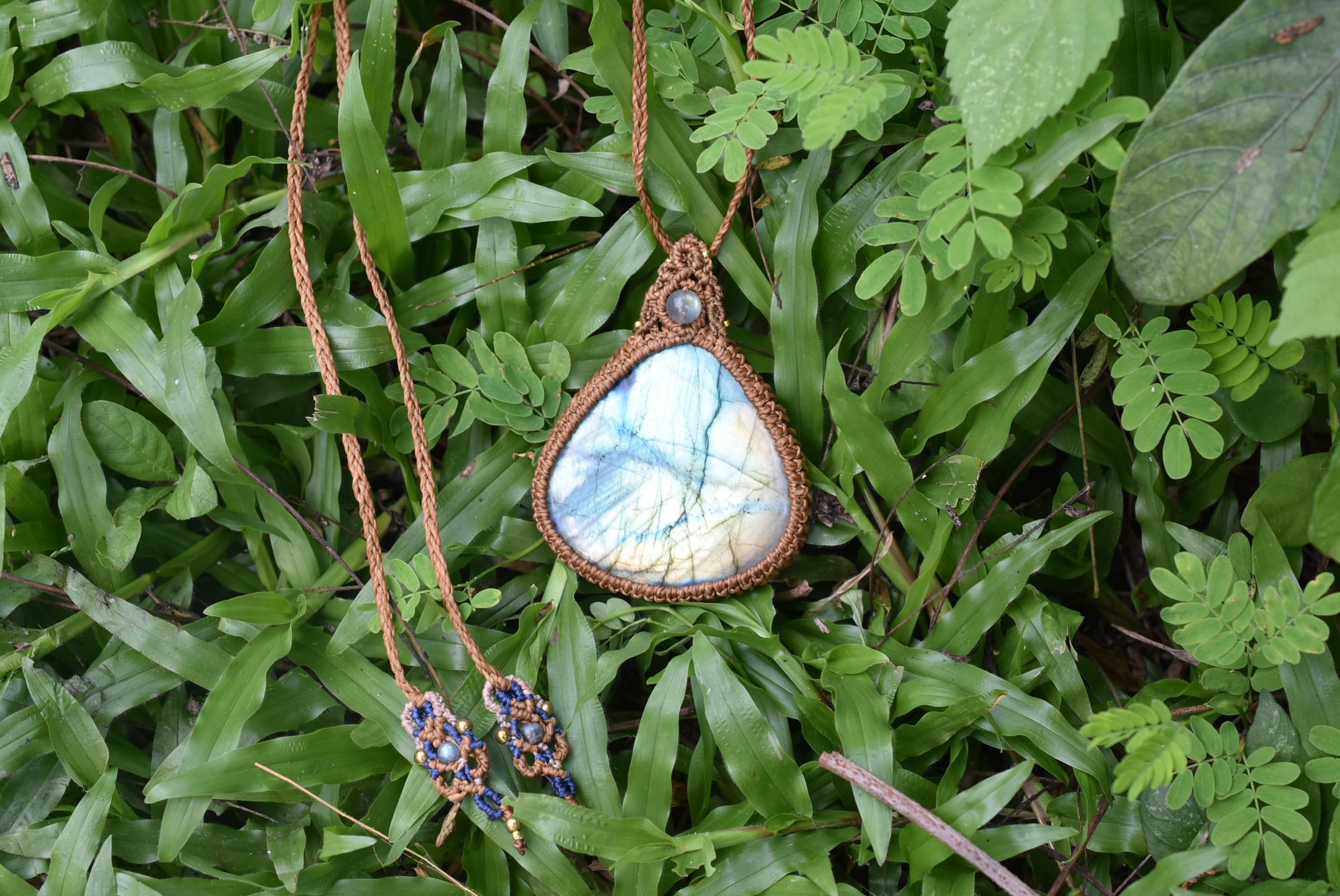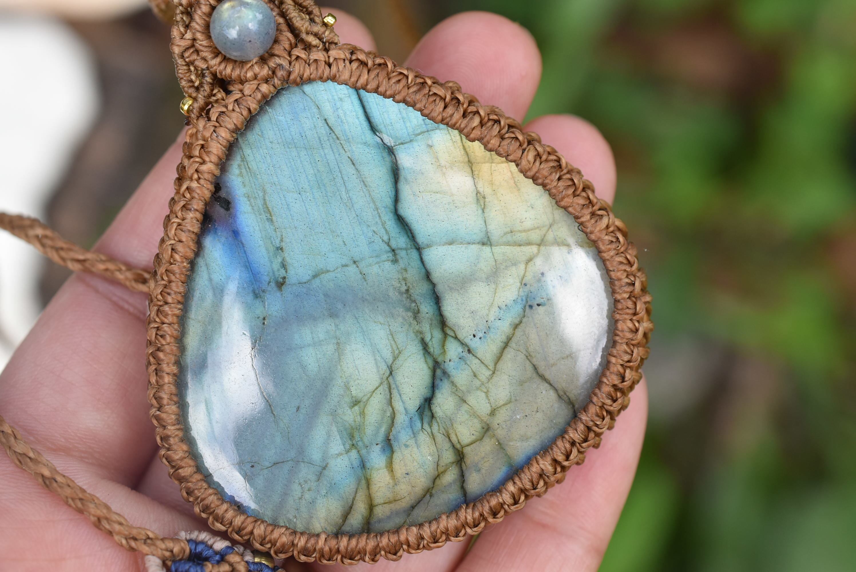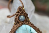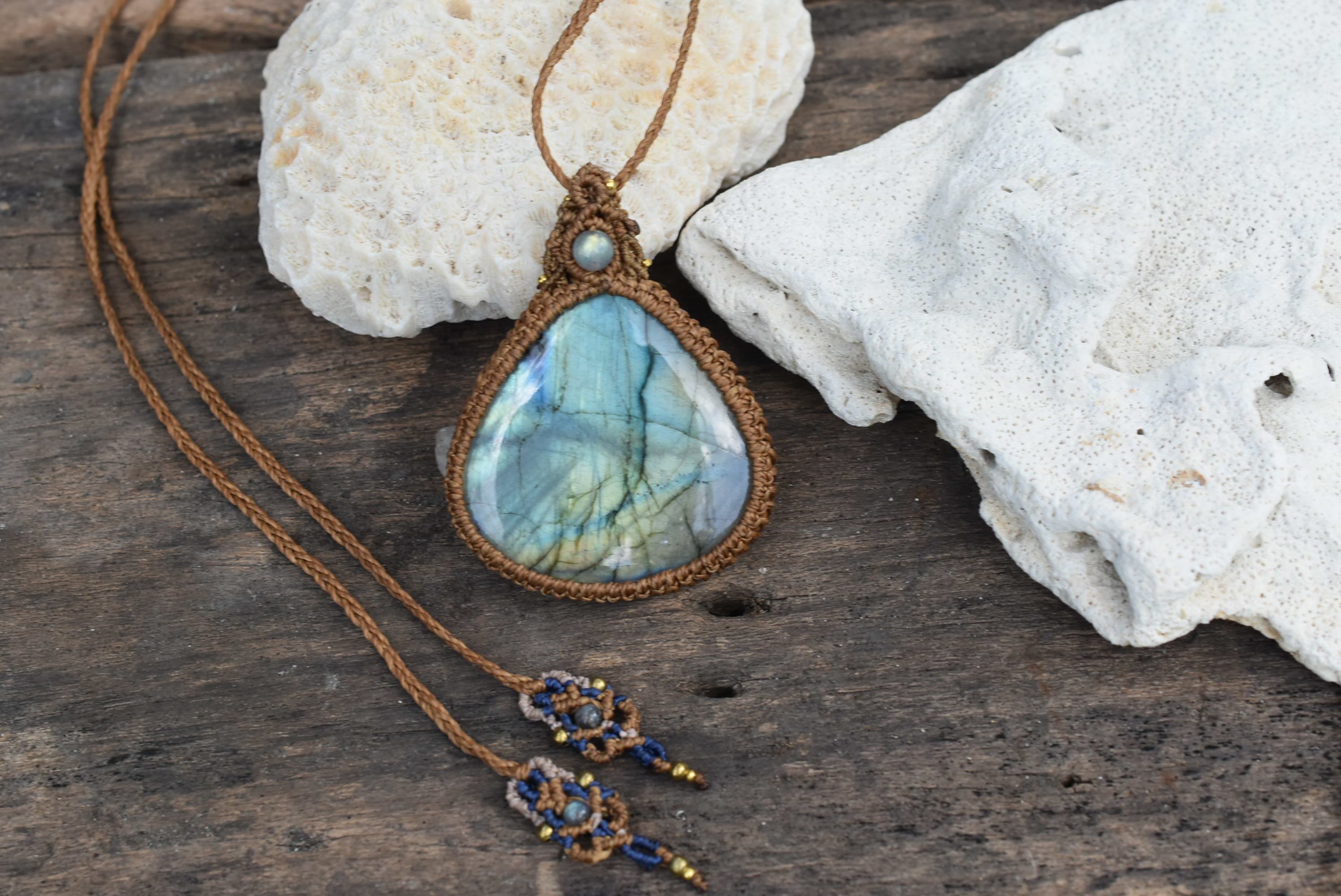 このたびはシンプルに包み込んで編み上げました。トップには同じくラブラドライトビーズの美しいピースをセレクトしてマクラメ編み装飾を施しました。
