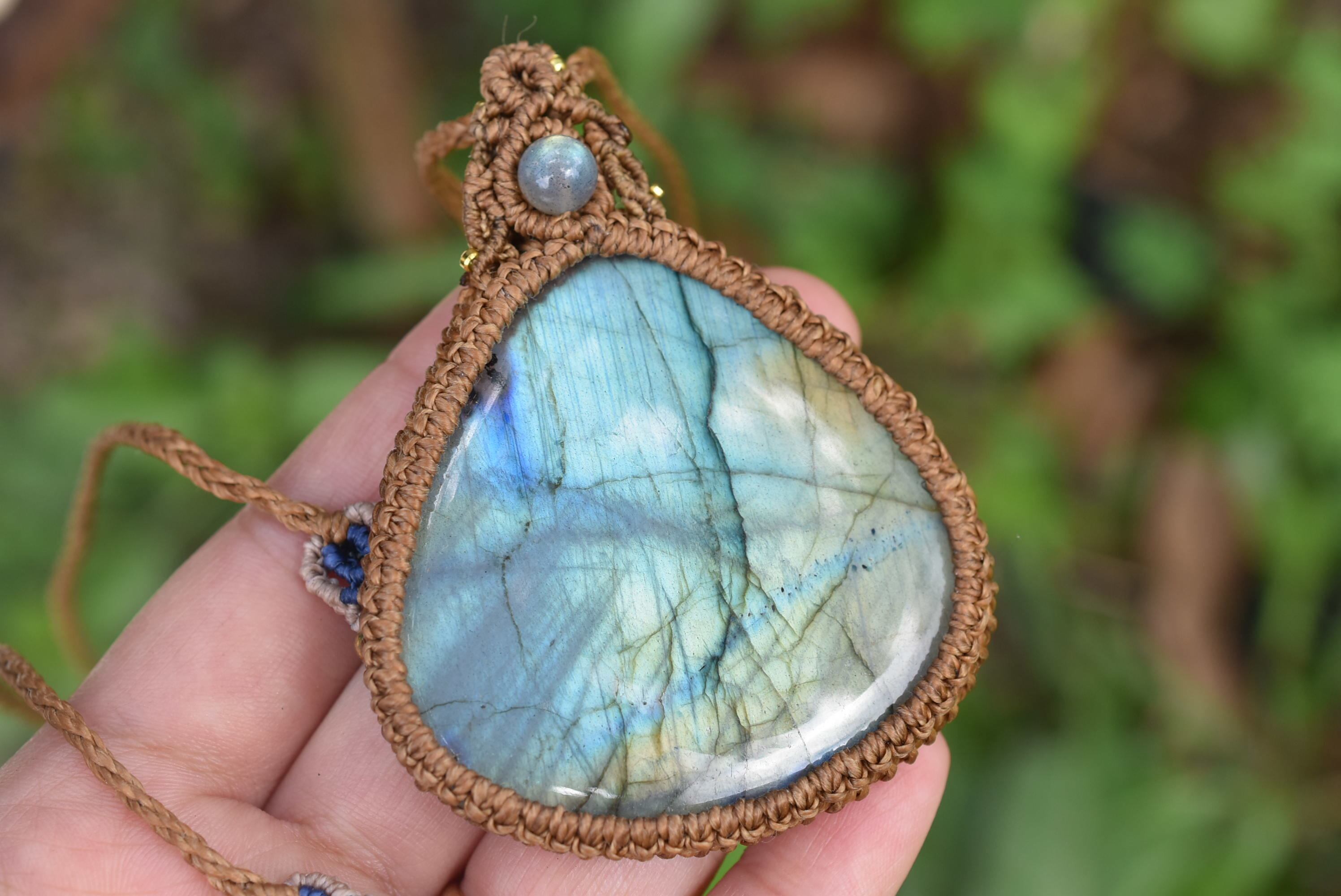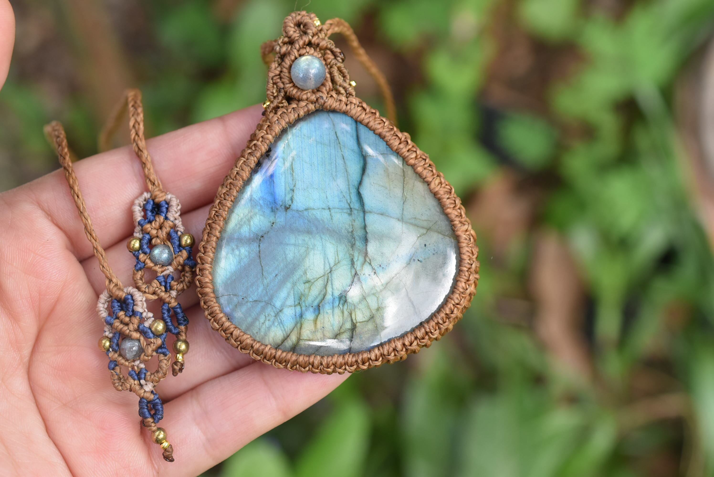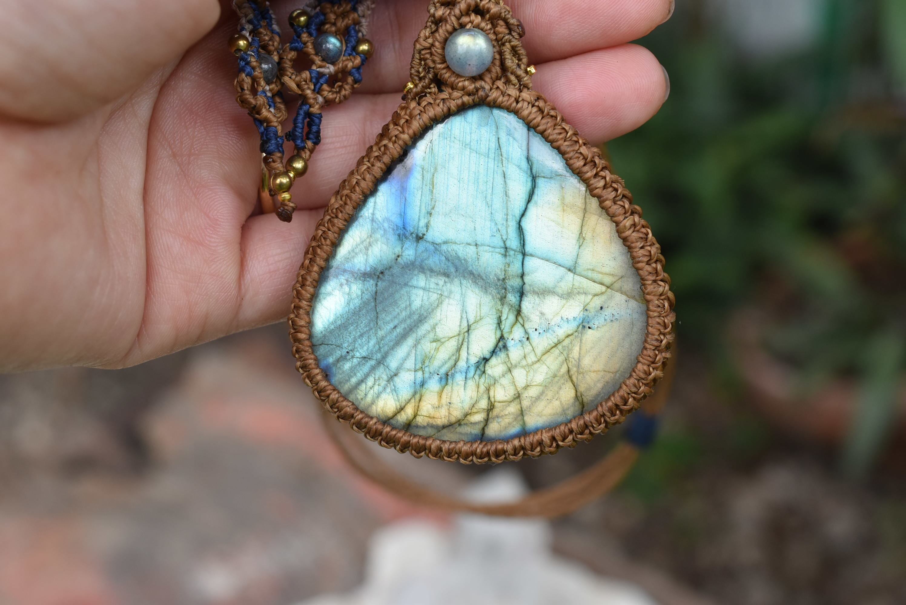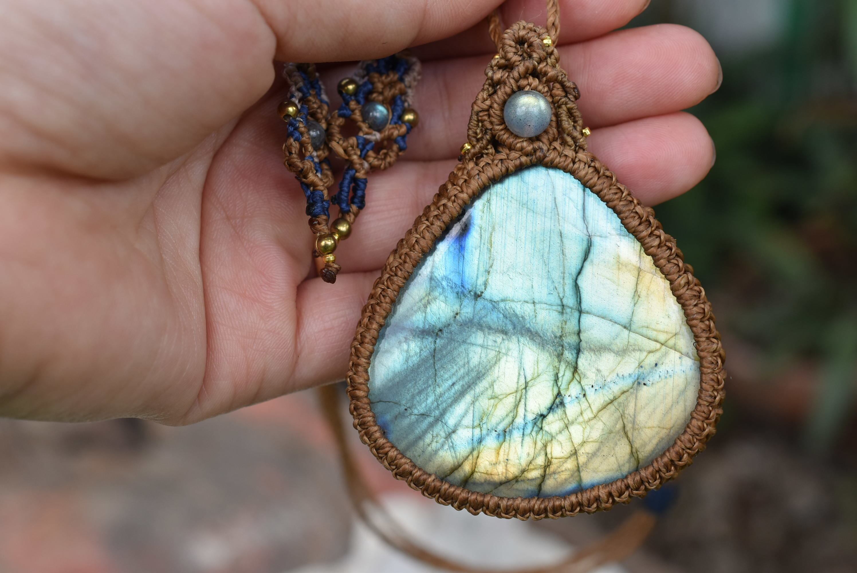 このたびはシンプルに包み込んで編み上げました。トップには同じくラブラドライトビーズの美しいピースをセレクトしてマクラメ編み装飾を施しました。