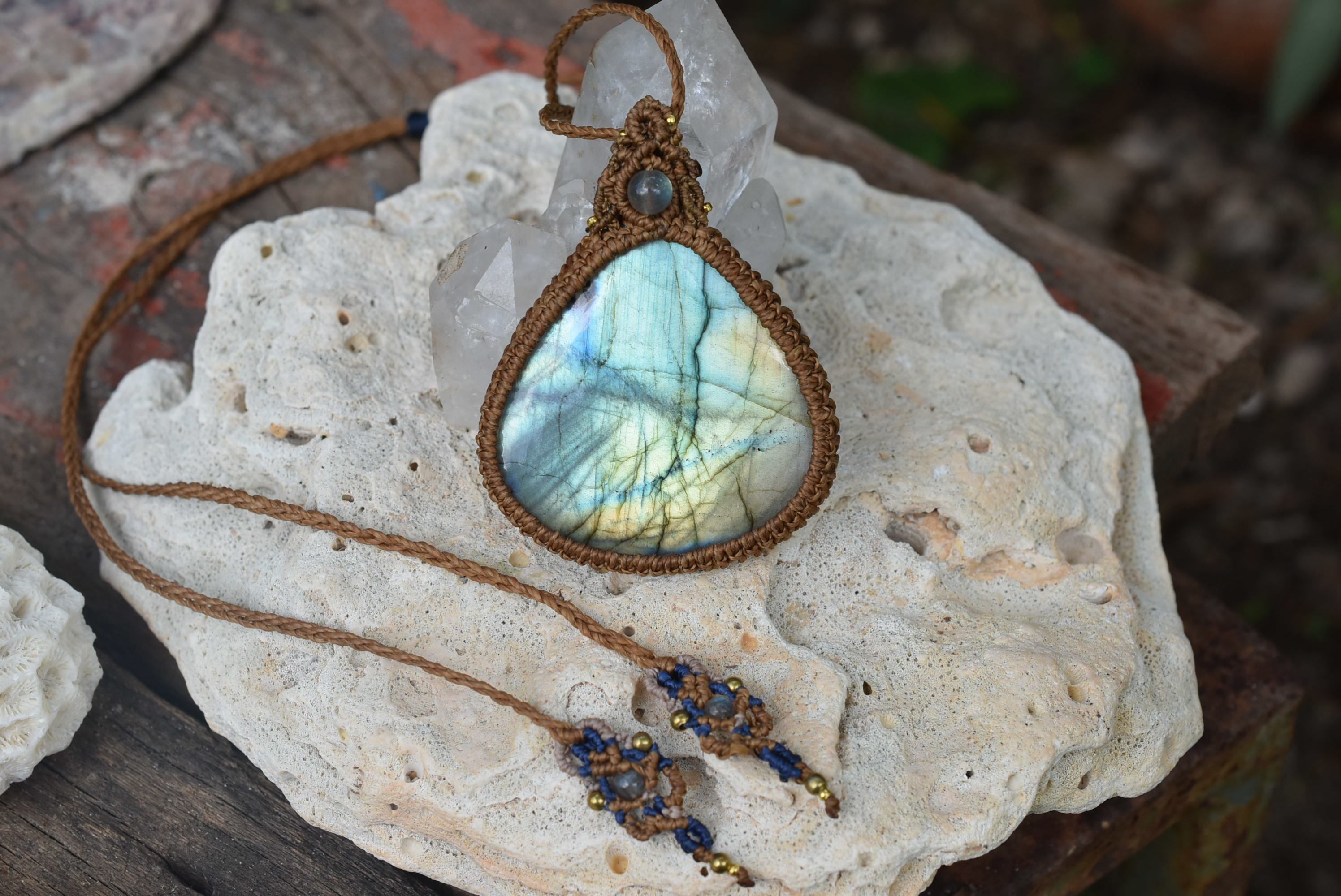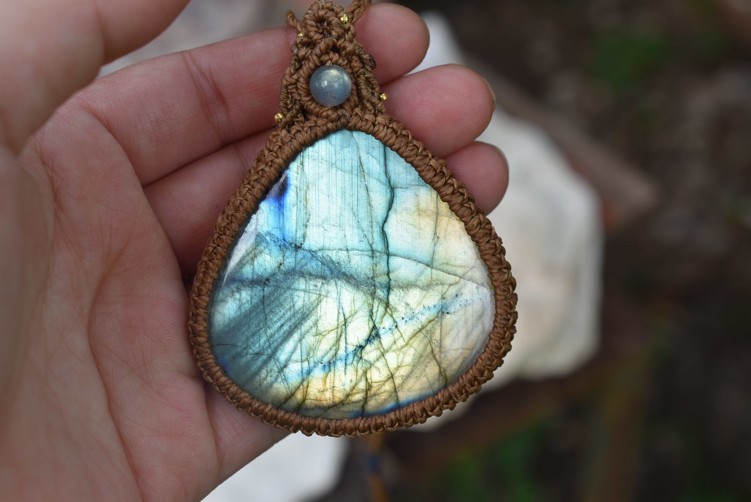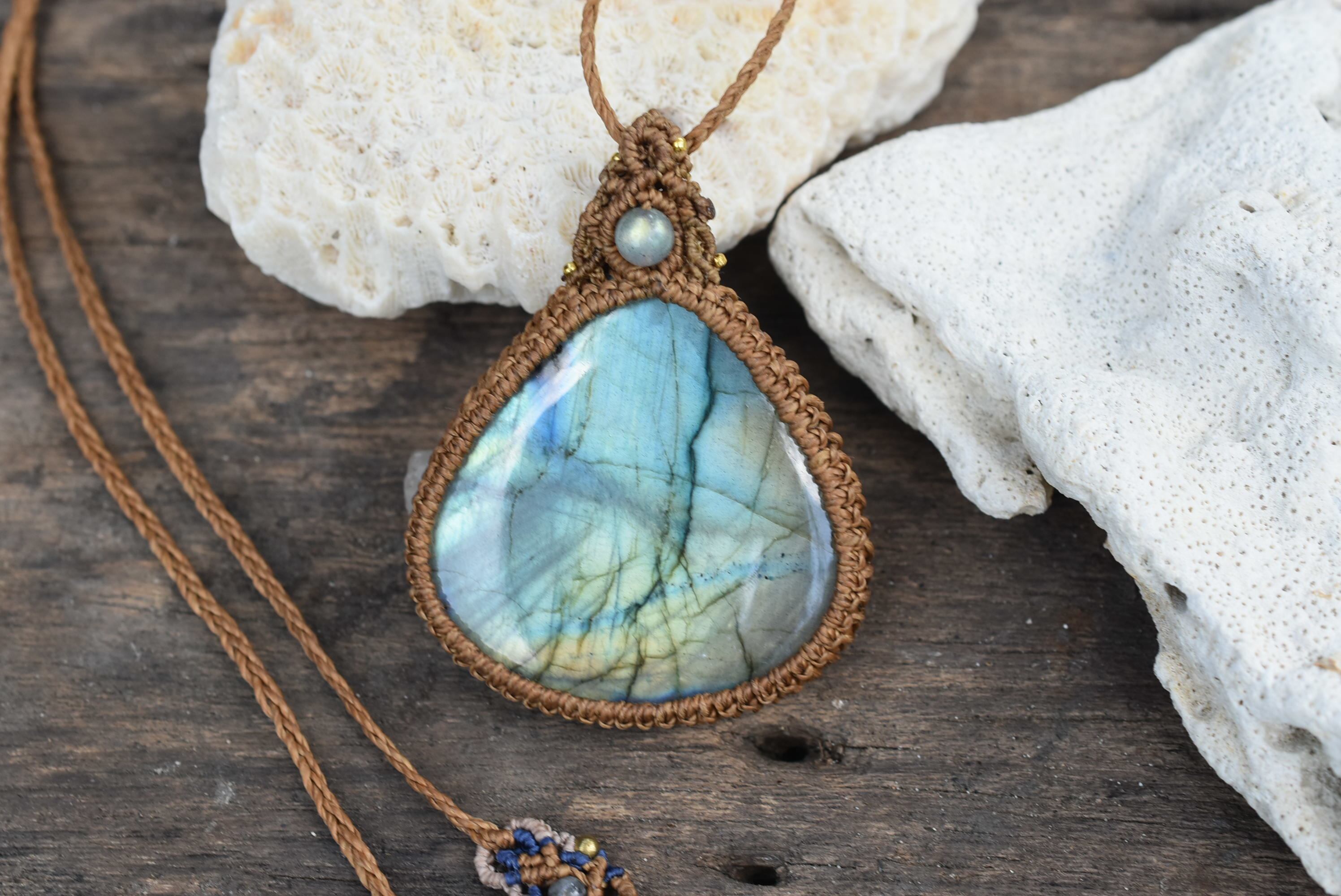 淡い水族館★上質★虹色ラブラドライト マクラメペンダント
