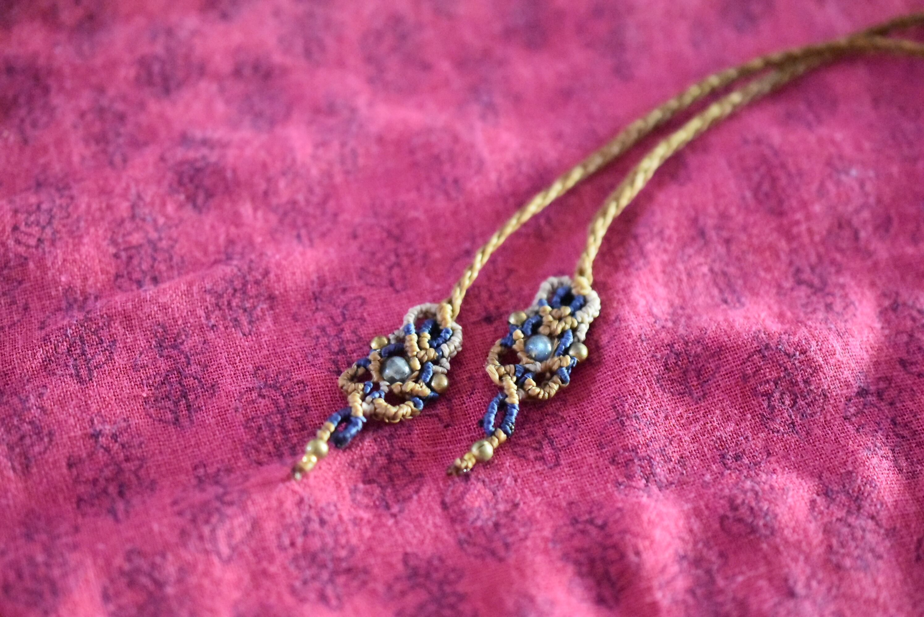 ◆このたびはゴールドブラウン色の蝋引き糸を使用しマクラメ編み装飾を施しました。