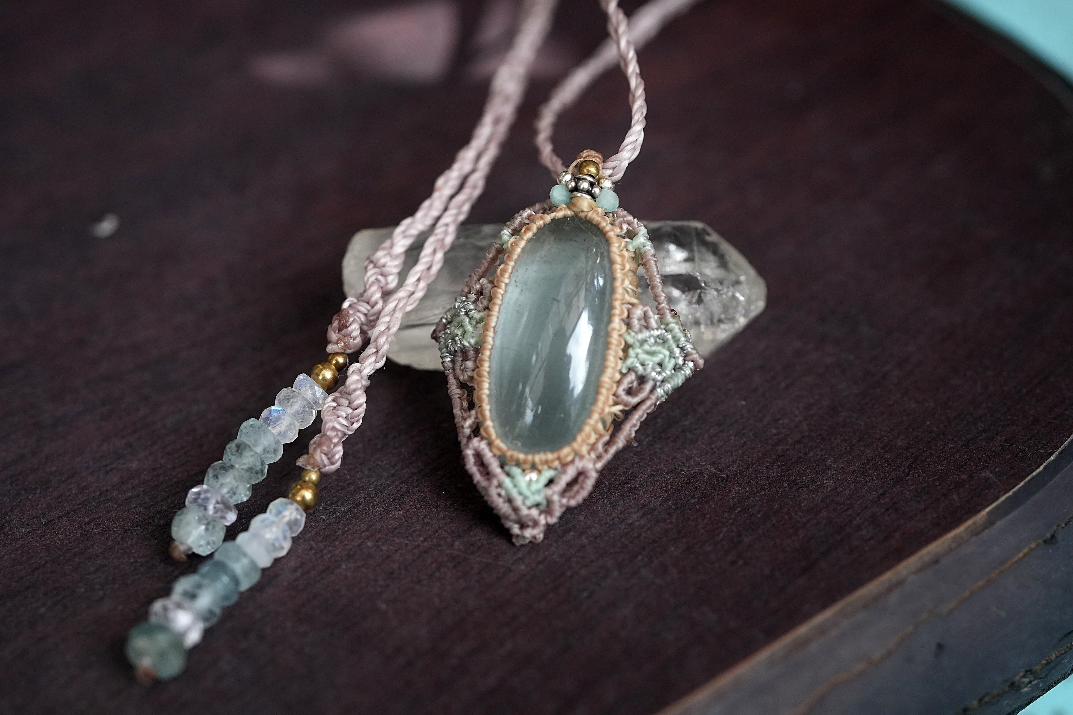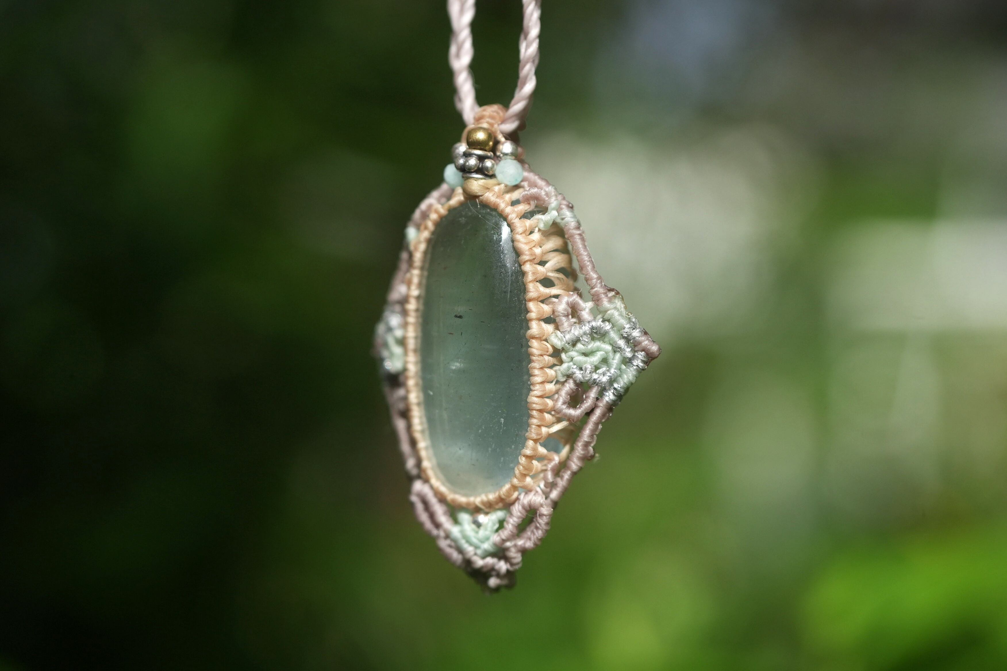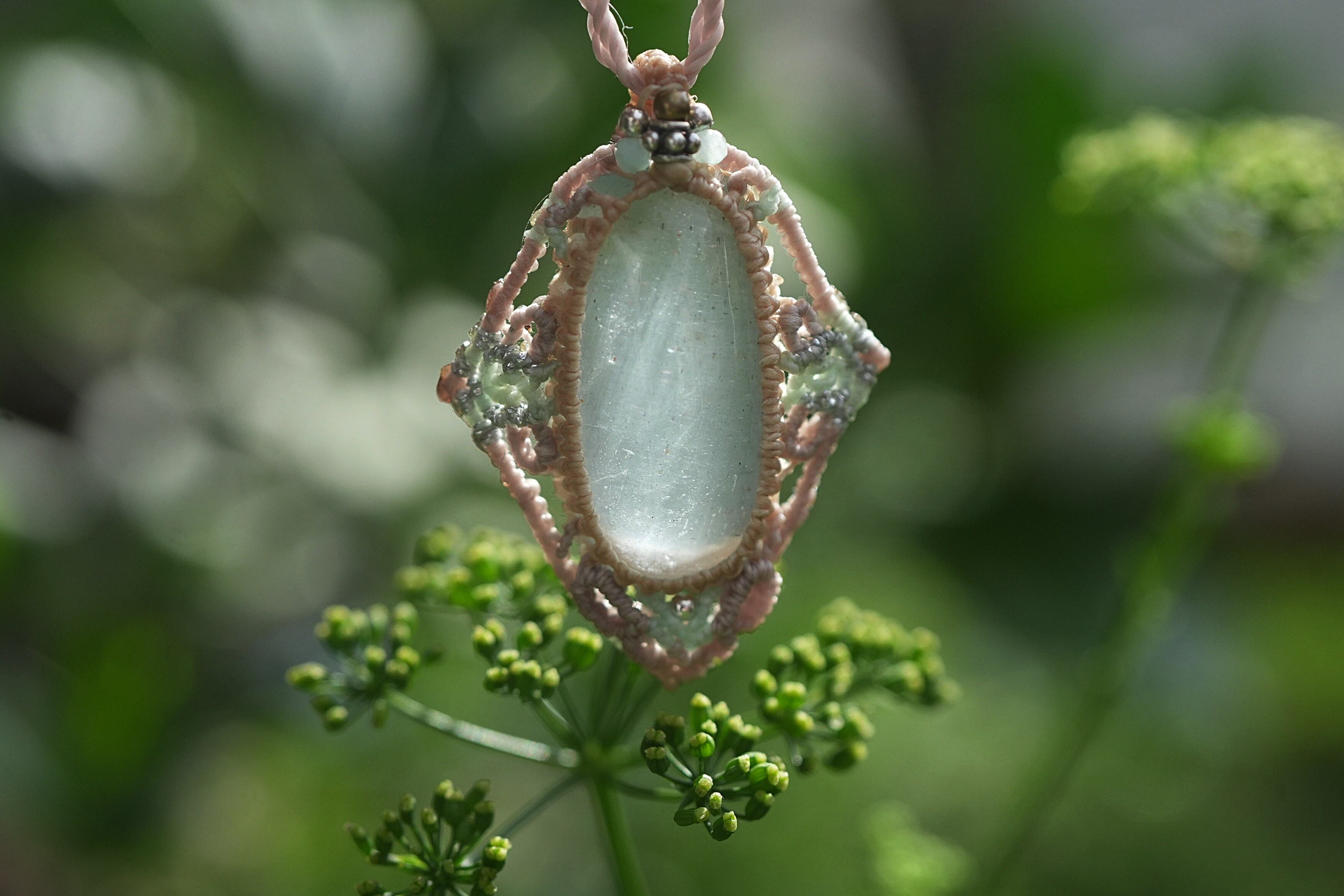 ◆このたびはキャラメル、カフェオレ、キナリ、ミント、シルバー色の蝋引き糸を使用しマクラメ編み装飾を施しました。