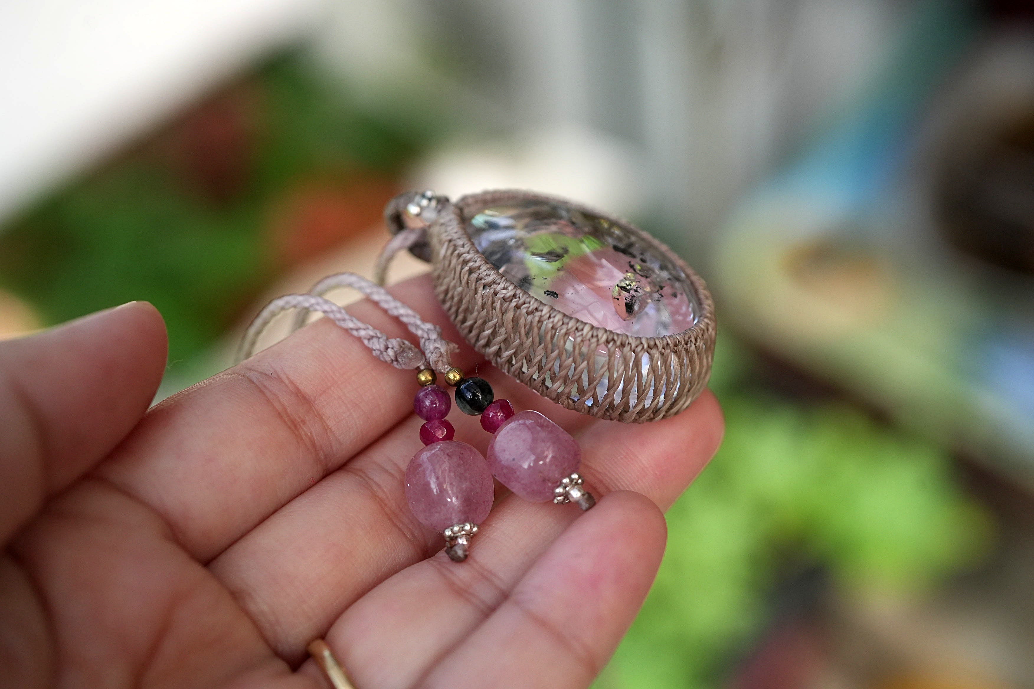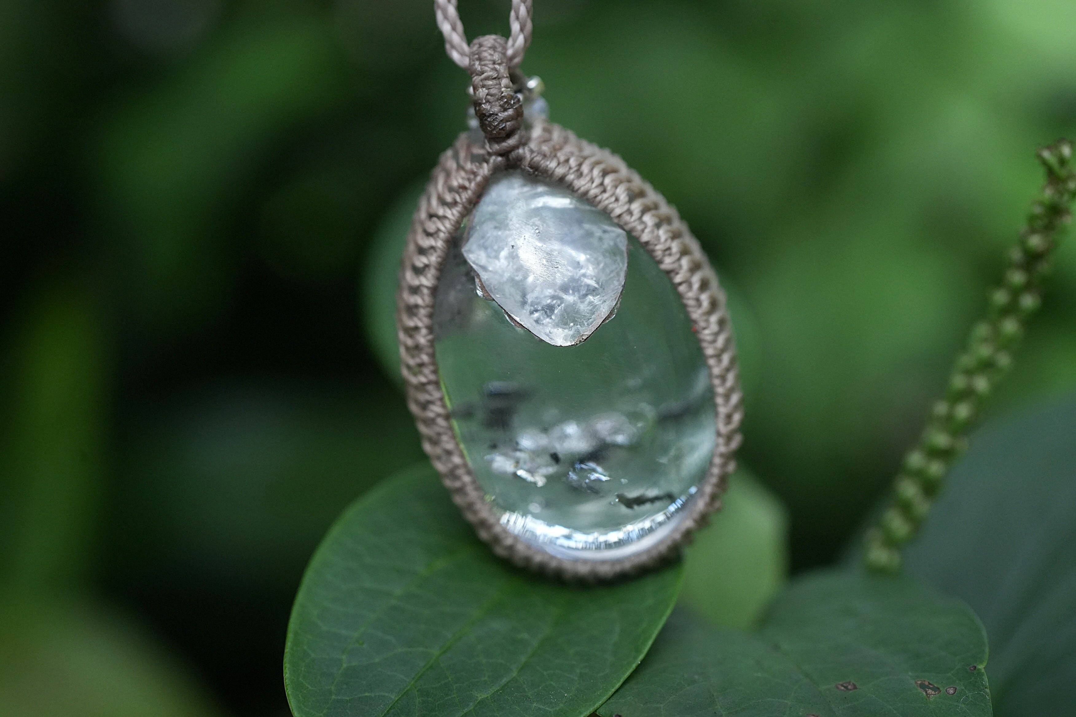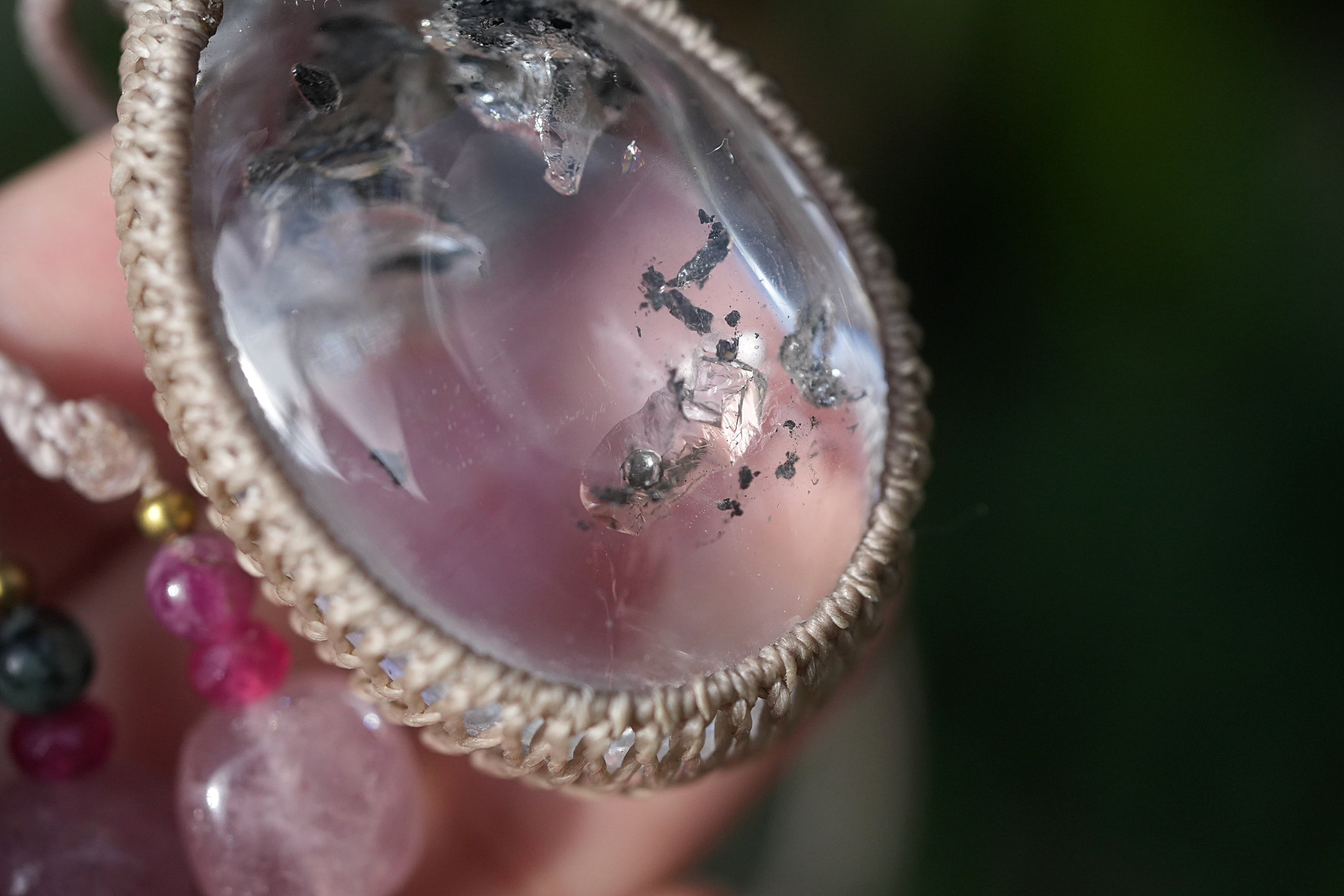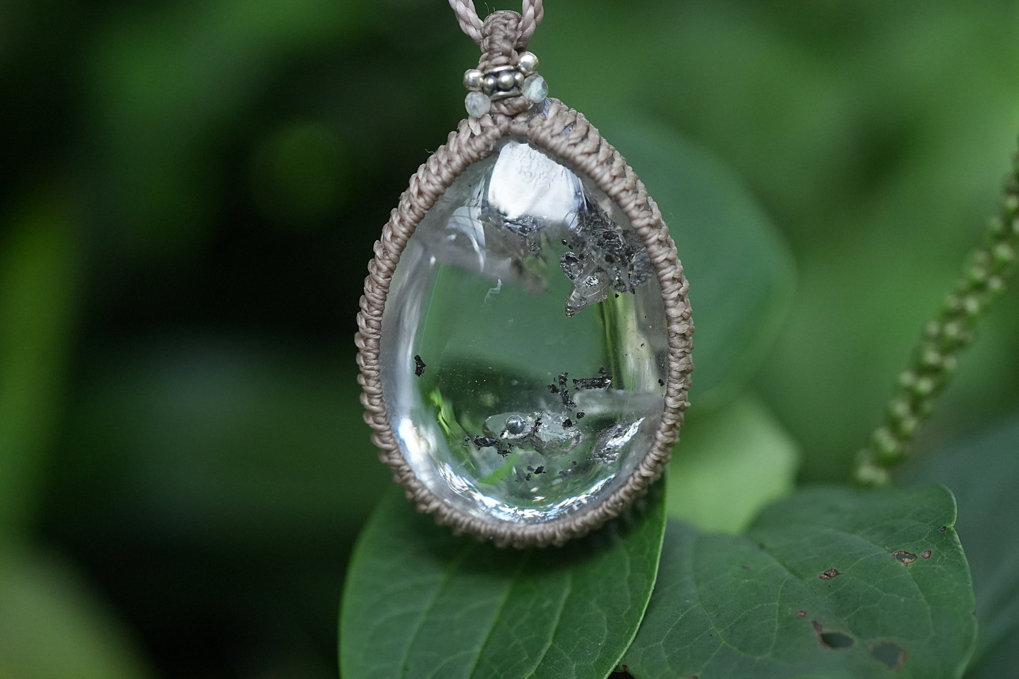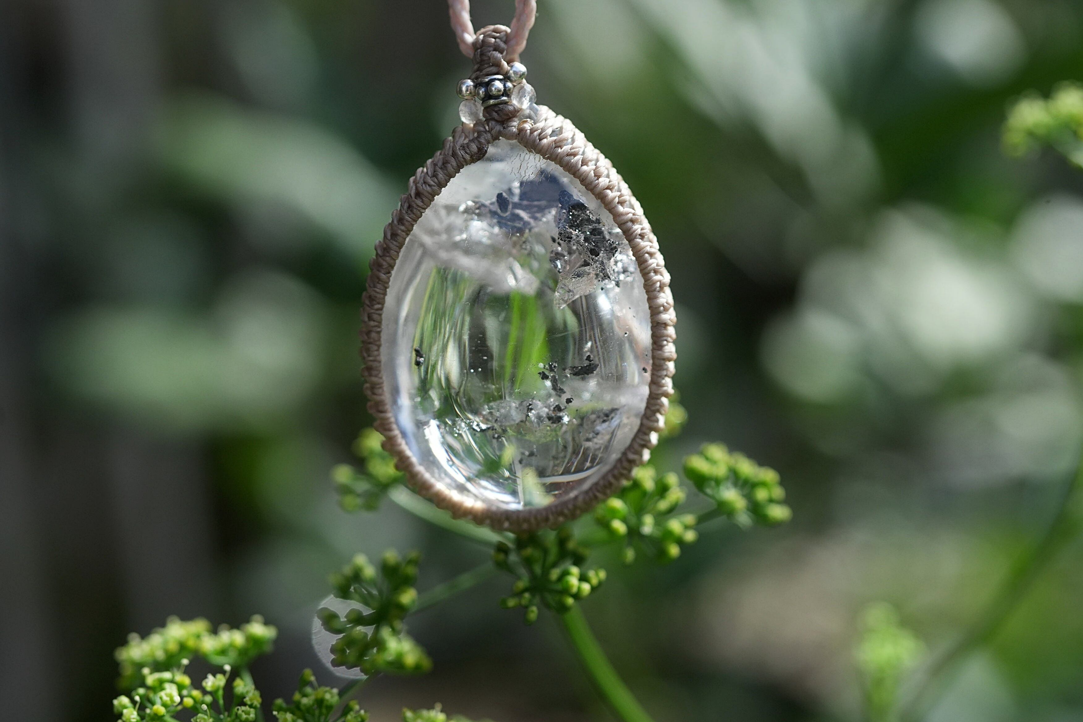 悩ましい水入り水晶をシンプルにマクラメネックレスに仕上げました。