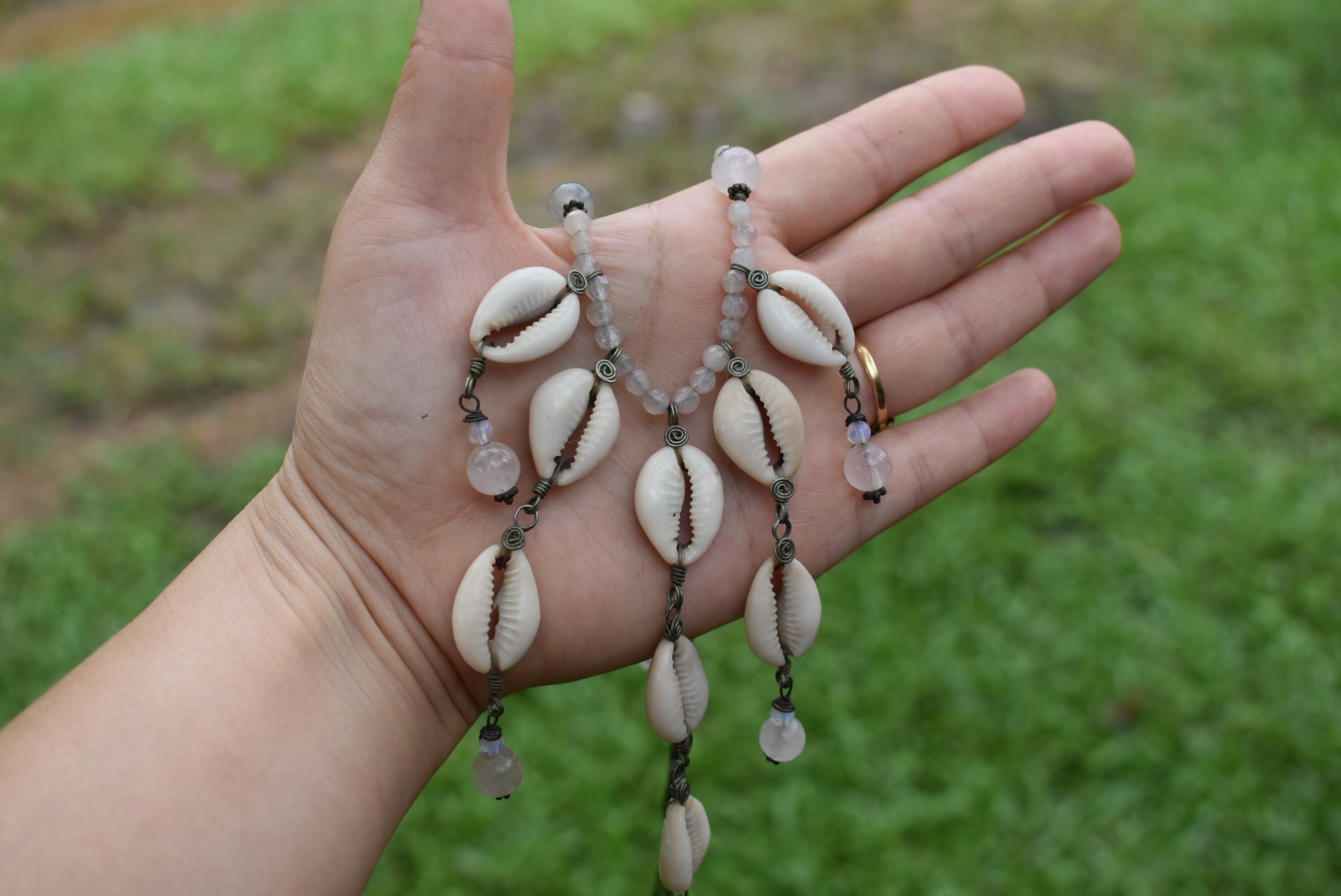 大ぶりな天然石ビーズローズクォーツと貝殻をワイヤーで結び、華やかでワイルドなネックレスに仕上げました。