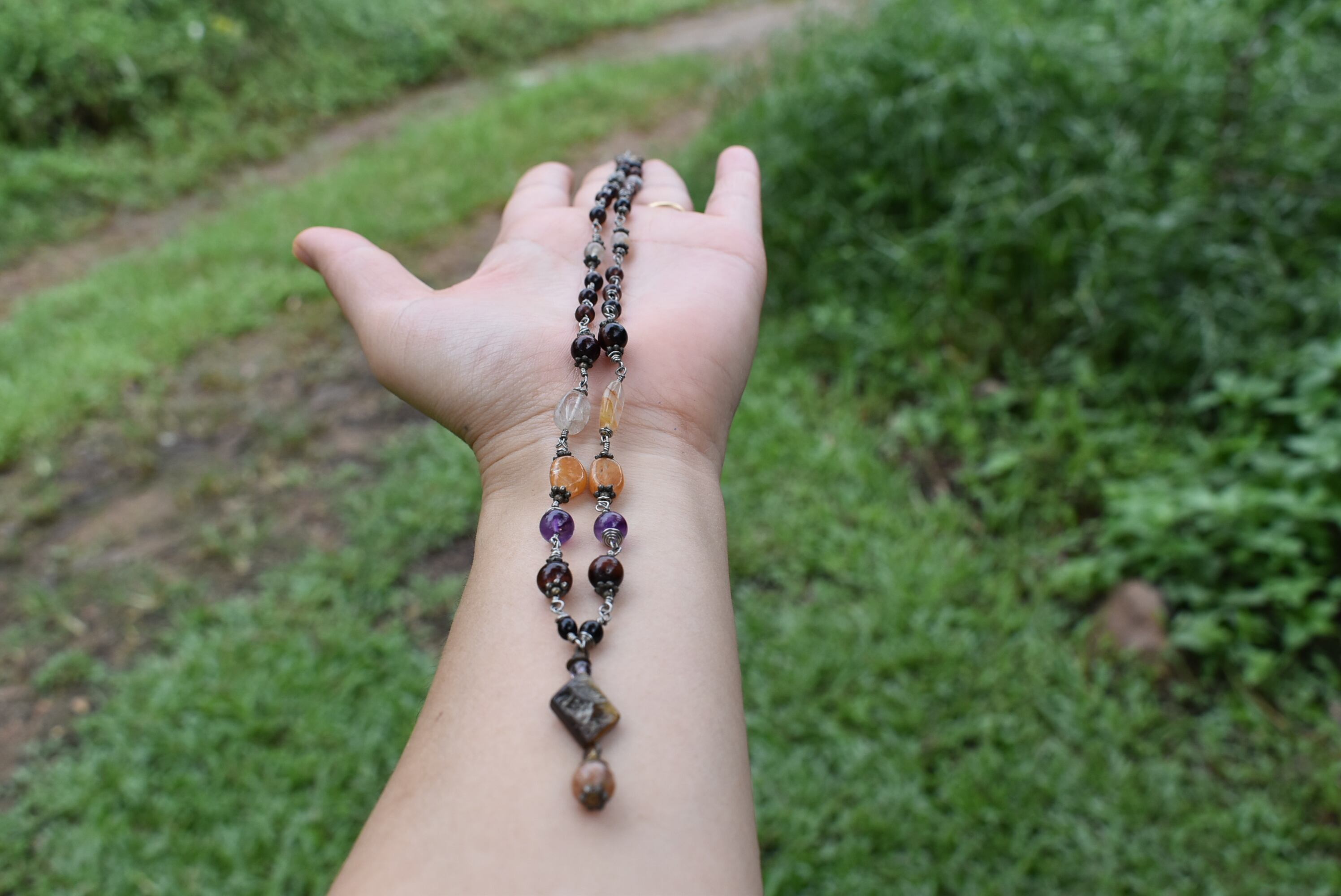 ブロック型のタイガーアイをメインにいろんな種類のビーズストーンをワイヤーで結び合わせてネックレスに仕上げました。